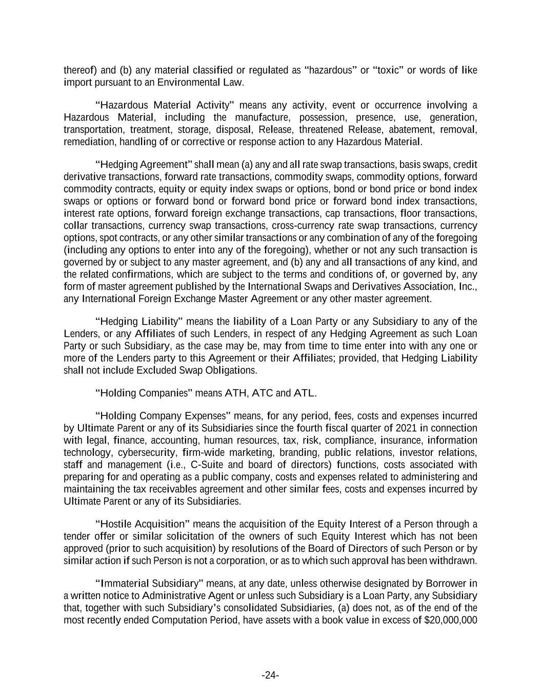 -24- thereof) and (b) any material classified or regulated as “hazardous” or “toxic” or words of like import pursuant to an Environmental Law. “Hazardous Material Activity” means any activity, event or occurrence involving a Hazardous Material, including the manufacture, possession, presence, use, generation, transportation, treatment, storage, disposal, Release, threatened Release, abatement, removal, remediation, handling of or corrective or response action to any Hazardous Material. “Hedging Agreement” shall mean (a) any and all rate swap transactions, basis swaps, credit derivative transactions, forward rate transactions, commodity swaps, commodity options, forward commodity contracts, equity or equity index swaps or options, bond or bond price or bond index swaps or options or forward bond or forward bond price or forward bond index transactions, interest rate options, forward foreign exchange transactions, cap transactions, floor transactions, collar transactions, currency swap transactions, cross-currency rate swap transactions, currency options, spot contracts, or any other similar transactions or any combination of any of the foregoing (including any options to enter into any of the foregoing), whether or not any such transaction is governed by or subject to any master agreement, and (b) any and all transactions of any kind, and the related confirmations, which are subject to the terms and conditions of, or governed by, any form of master agreement published by the International Swaps and Derivatives Association, Inc., any International Foreign Exchange Master Agreement or any other master agreement. “Hedging Liability” means the liability of a Loan Party or any Subsidiary to any of the Lenders, or any Affiliates of such Lenders, in respect of any Hedging Agreement as such Loan Party or such Subsidiary, as the case may be, may from time to time enter into with any one or more of the Lenders party to this Agreement or their Affiliates; provided, that Hedging Liability shall not include Excluded Swap Obligations. “Holding Companies” means ATH, ATC and ATL. “Holding Company Expenses” means, for any period, fees, costs and expenses incurred by Ultimate Parent or any of its Subsidiaries since the fourth fiscal quarter of 2021 in connection with legal, finance, accounting, human resources, tax, risk, compliance, insurance, information technology, cybersecurity, firm-wide marketing, branding, public relations, investor relations, staff and management (i.e., C-Suite and board of directors) functions, costs associated with preparing for and operating as a public company, costs and expenses related to administering and maintaining the tax receivables agreement and other similar fees, costs and expenses incurred by Ultimate Parent or any of its Subsidiaries. “Hostile Acquisition” means the acquisition of the Equity Interest of a Person through a tender offer or similar solicitation of the owners of such Equity Interest which has not been approved (prior to such acquisition) by resolutions of the Board of Directors of such Person or by similar action if such Person is not a corporation, or as to which such approval has been withdrawn. “Immaterial Subsidiary” means, at any date, unless otherwise designated by Borrower in a written notice to Administrative Agent or unless such Subsidiary is a Loan Party, any Subsidiary that, together with such Subsidiary’s consolidated Subsidiaries, (a) does not, as of the end of the most recently ended Computation Period, have assets with a book value in excess of $20,000,000