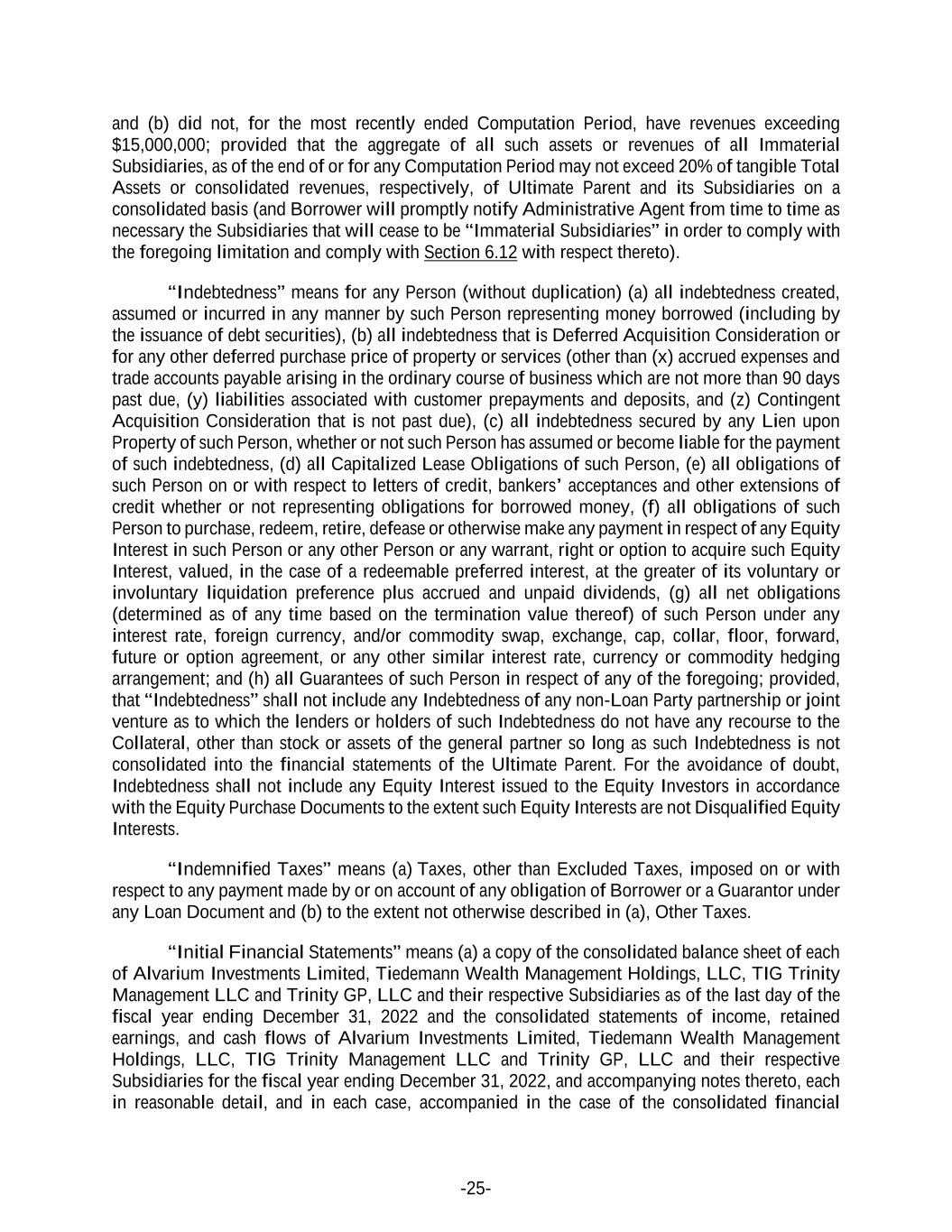 -25- and (b) did not, for the most recently ended Computation Period, have revenues exceeding $15,000,000; provided that the aggregate of all such assets or revenues of all Immaterial Subsidiaries, as of the end of or for any Computation Period may not exceed 20% of tangible Total Assets or consolidated revenues, respectively, of Ultimate Parent and its Subsidiaries on a consolidated basis (and Borrower will promptly notify Administrative Agent from time to time as necessary the Subsidiaries that will cease to be “Immaterial Subsidiaries” in order to comply with the foregoing limitation and comply with Section 6.12 with respect thereto). “Indebtedness” means for any Person (without duplication) (a) all indebtedness created, assumed or incurred in any manner by such Person representing money borrowed (including by the issuance of debt securities), (b) all indebtedness that is Deferred Acquisition Consideration or for any other deferred purchase price of property or services (other than (x) accrued expenses and trade accounts payable arising in the ordinary course of business which are not more than 90 days past due, (y) liabilities associated with customer prepayments and deposits, and (z) Contingent Acquisition Consideration that is not past due), (c) all indebtedness secured by any Lien upon Property of such Person, whether or not such Person has assumed or become liable for the payment of such indebtedness, (d) all Capitalized Lease Obligations of such Person, (e) all obligations of such Person on or with respect to letters of credit, bankers’ acceptances and other extensions of credit whether or not representing obligations for borrowed money, (f) all obligations of such Person to purchase, redeem, retire, defease or otherwise make any payment in respect of any Equity Interest in such Person or any other Person or any warrant, right or option to acquire such Equity Interest, valued, in the case of a redeemable preferred interest, at the greater of its voluntary or involuntary liquidation preference plus accrued and unpaid dividends, (g) all net obligations (determined as of any time based on the termination value thereof) of such Person under any interest rate, foreign currency, and/or commodity swap, exchange, cap, collar, floor, forward, future or option agreement, or any other similar interest rate, currency or commodity hedging arrangement; and (h) all Guarantees of such Person in respect of any of the foregoing; provided, that “Indebtedness” shall not include any Indebtedness of any non-Loan Party partnership or joint venture as to which the lenders or holders of such Indebtedness do not have any recourse to the Collateral, other than stock or assets of the general partner so long as such Indebtedness is not consolidated into the financial statements of the Ultimate Parent. For the avoidance of doubt, Indebtedness shall not include any Equity Interest issued to the Equity Investors in accordance with the Equity Purchase Documents to the extent such Equity Interests are not Disqualified Equity Interests. “Indemnified Taxes” means (a) Taxes, other than Excluded Taxes, imposed on or with respect to any payment made by or on account of any obligation of Borrower or a Guarantor under any Loan Document and (b) to the extent not otherwise described in (a), Other Taxes. “Initial Financial Statements” means (a) a copy of the consolidated balance sheet of each of Alvarium Investments Limited, Tiedemann Wealth Management Holdings, LLC, TIG Trinity Management LLC and Trinity GP, LLC and their respective Subsidiaries as of the last day of the fiscal year ending December 31, 2022 and the consolidated statements of income, retained earnings, and cash flows of Alvarium Investments Limited, Tiedemann Wealth Management Holdings, LLC, TIG Trinity Management LLC and Trinity GP, LLC and their respective Subsidiaries for the fiscal year ending December 31, 2022, and accompanying notes thereto, each in reasonable detail, and in each case, accompanied in the case of the consolidated financial