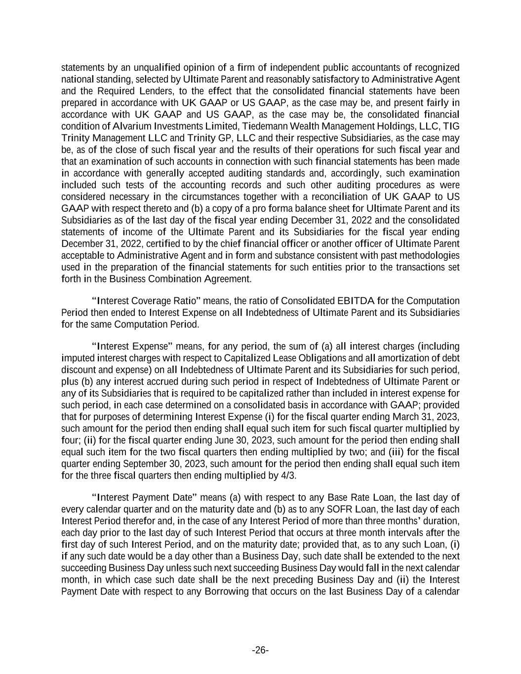 -26- statements by an unqualified opinion of a firm of independent public accountants of recognized national standing, selected by Ultimate Parent and reasonably satisfactory to Administrative Agent and the Required Lenders, to the effect that the consolidated financial statements have been prepared in accordance with UK GAAP or US GAAP, as the case may be, and present fairly in accordance with UK GAAP and US GAAP, as the case may be, the consolidated financial condition of Alvarium Investments Limited, Tiedemann Wealth Management Holdings, LLC, TIG Trinity Management LLC and Trinity GP, LLC and their respective Subsidiaries, as the case may be, as of the close of such fiscal year and the results of their operations for such fiscal year and that an examination of such accounts in connection with such financial statements has been made in accordance with generally accepted auditing standards and, accordingly, such examination included such tests of the accounting records and such other auditing procedures as were considered necessary in the circumstances together with a reconciliation of UK GAAP to US GAAP with respect thereto and (b) a copy of a pro forma balance sheet for Ultimate Parent and its Subsidiaries as of the last day of the fiscal year ending December 31, 2022 and the consolidated statements of income of the Ultimate Parent and its Subsidiaries for the fiscal year ending December 31, 2022, certified to by the chief financial officer or another officer of Ultimate Parent acceptable to Administrative Agent and in form and substance consistent with past methodologies used in the preparation of the financial statements for such entities prior to the transactions set forth in the Business Combination Agreement. “Interest Coverage Ratio” means, the ratio of Consolidated EBITDA for the Computation Period then ended to Interest Expense on all Indebtedness of Ultimate Parent and its Subsidiaries for the same Computation Period. “Interest Expense” means, for any period, the sum of (a) all interest charges (including imputed interest charges with respect to Capitalized Lease Obligations and all amortization of debt discount and expense) on all Indebtedness of Ultimate Parent and its Subsidiaries for such period, plus (b) any interest accrued during such period in respect of Indebtedness of Ultimate Parent or any of its Subsidiaries that is required to be capitalized rather than included in interest expense for such period, in each case determined on a consolidated basis in accordance with GAAP; provided that for purposes of determining Interest Expense (i) for the fiscal quarter ending March 31, 2023, such amount for the period then ending shall equal such item for such fiscal quarter multiplied by four; (ii) for the fiscal quarter ending June 30, 2023, such amount for the period then ending shall equal such item for the two fiscal quarters then ending multiplied by two; and (iii) for the fiscal quarter ending September 30, 2023, such amount for the period then ending shall equal such item for the three fiscal quarters then ending multiplied by 4/3. “Interest Payment Date” means (a) with respect to any Base Rate Loan, the last day of every calendar quarter and on the maturity date and (b) as to any SOFR Loan, the last day of each Interest Period therefor and, in the case of any Interest Period of more than three months’ duration, each day prior to the last day of such Interest Period that occurs at three month intervals after the first day of such Interest Period, and on the maturity date; provided that, as to any such Loan, (i) if any such date would be a day other than a Business Day, such date shall be extended to the next succeeding Business Day unless such next succeeding Business Day would fall in the next calendar month, in which case such date shall be the next preceding Business Day and (ii) the Interest Payment Date with respect to any Borrowing that occurs on the last Business Day of a calendar
