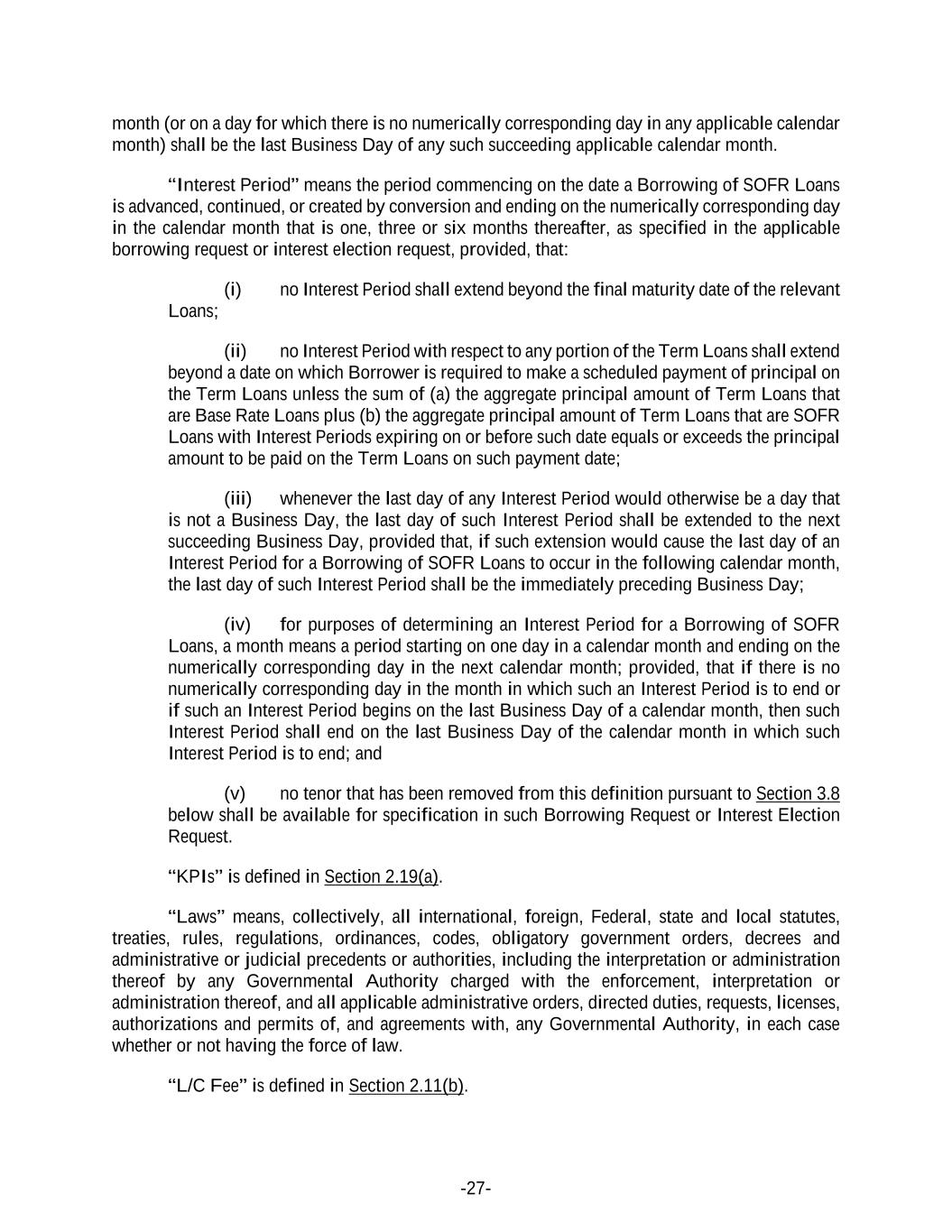 -27- month (or on a day for which there is no numerically corresponding day in any applicable calendar month) shall be the last Business Day of any such succeeding applicable calendar month. “Interest Period” means the period commencing on the date a Borrowing of SOFR Loans is advanced, continued, or created by conversion and ending on the numerically corresponding day in the calendar month that is one, three or six months thereafter, as specified in the applicable borrowing request or interest election request, provided, that: (i) no Interest Period shall extend beyond the final maturity date of the relevant Loans; (ii) no Interest Period with respect to any portion of the Term Loans shall extend beyond a date on which Borrower is required to make a scheduled payment of principal on the Term Loans unless the sum of (a) the aggregate principal amount of Term Loans that are Base Rate Loans plus (b) the aggregate principal amount of Term Loans that are SOFR Loans with Interest Periods expiring on or before such date equals or exceeds the principal amount to be paid on the Term Loans on such payment date; (iii) whenever the last day of any Interest Period would otherwise be a day that is not a Business Day, the last day of such Interest Period shall be extended to the next succeeding Business Day, provided that, if such extension would cause the last day of an Interest Period for a Borrowing of SOFR Loans to occur in the following calendar month, the last day of such Interest Period shall be the immediately preceding Business Day; (iv) for purposes of determining an Interest Period for a Borrowing of SOFR Loans, a month means a period starting on one day in a calendar month and ending on the numerically corresponding day in the next calendar month; provided, that if there is no numerically corresponding day in the month in which such an Interest Period is to end or if such an Interest Period begins on the last Business Day of a calendar month, then such Interest Period shall end on the last Business Day of the calendar month in which such Interest Period is to end; and (v) no tenor that has been removed from this definition pursuant to Section 3.8 below shall be available for specification in such Borrowing Request or Interest Election Request. “KPIs” is defined in Section 2.19(a). “Laws” means, collectively, all international, foreign, Federal, state and local statutes, treaties, rules, regulations, ordinances, codes, obligatory government orders, decrees and administrative or judicial precedents or authorities, including the interpretation or administration thereof by any Governmental Authority charged with the enforcement, interpretation or administration thereof, and all applicable administrative orders, directed duties, requests, licenses, authorizations and permits of, and agreements with, any Governmental Authority, in each case whether or not having the force of law. “L/C Fee” is defined in Section 2.11(b).