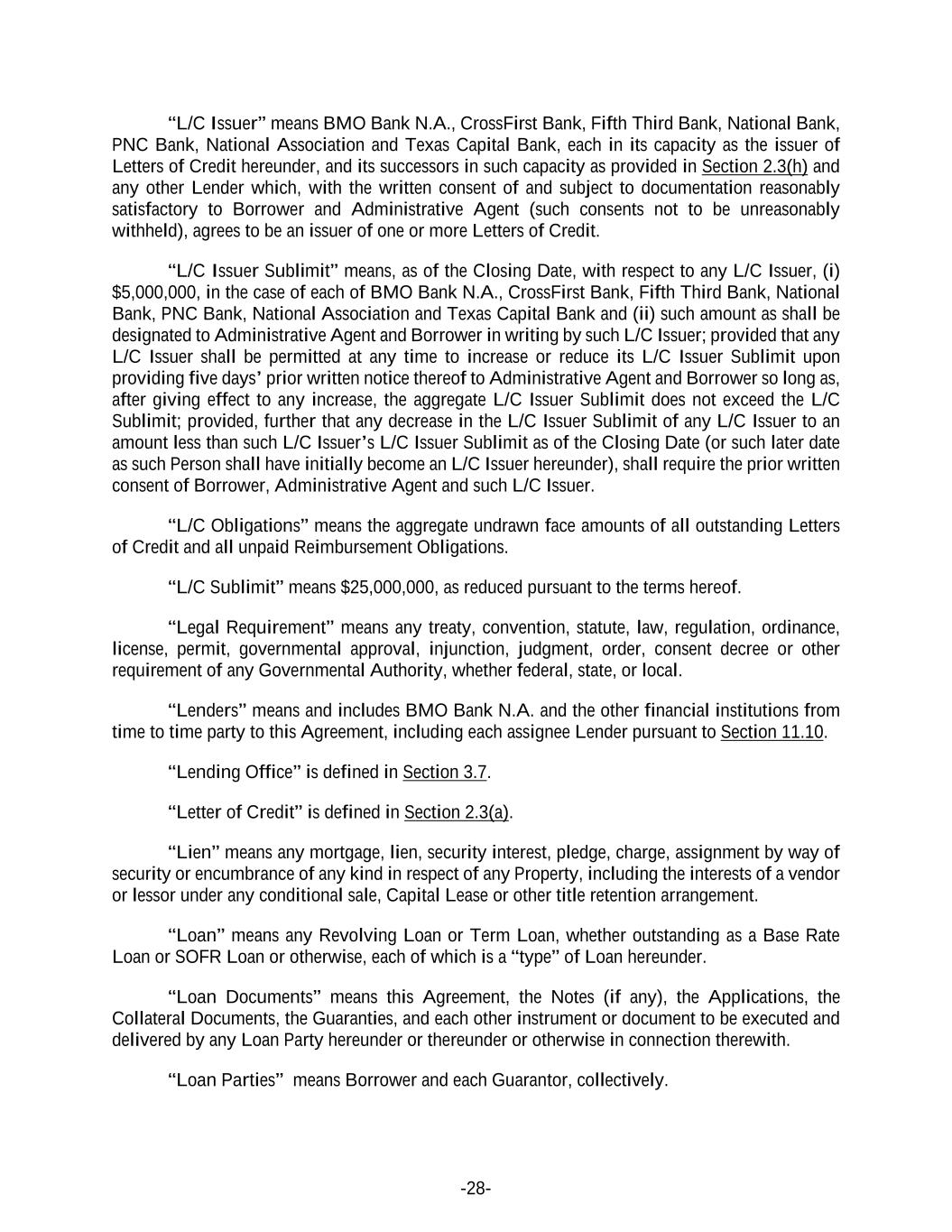 -28- “L/C Issuer” means BMO Bank N.A., CrossFirst Bank, Fifth Third Bank, National Bank, PNC Bank, National Association and Texas Capital Bank, each in its capacity as the issuer of Letters of Credit hereunder, and its successors in such capacity as provided in Section 2.3(h) and any other Lender which, with the written consent of and subject to documentation reasonably satisfactory to Borrower and Administrative Agent (such consents not to be unreasonably withheld), agrees to be an issuer of one or more Letters of Credit. “L/C Issuer Sublimit” means, as of the Closing Date, with respect to any L/C Issuer, (i) $5,000,000, in the case of each of BMO Bank N.A., CrossFirst Bank, Fifth Third Bank, National Bank, PNC Bank, National Association and Texas Capital Bank and (ii) such amount as shall be designated to Administrative Agent and Borrower in writing by such L/C Issuer; provided that any L/C Issuer shall be permitted at any time to increase or reduce its L/C Issuer Sublimit upon providing five days’ prior written notice thereof to Administrative Agent and Borrower so long as, after giving effect to any increase, the aggregate L/C Issuer Sublimit does not exceed the L/C Sublimit; provided, further that any decrease in the L/C Issuer Sublimit of any L/C Issuer to an amount less than such L/C Issuer’s L/C Issuer Sublimit as of the Closing Date (or such later date as such Person shall have initially become an L/C Issuer hereunder), shall require the prior written consent of Borrower, Administrative Agent and such L/C Issuer. “L/C Obligations” means the aggregate undrawn face amounts of all outstanding Letters of Credit and all unpaid Reimbursement Obligations. “L/C Sublimit” means $25,000,000, as reduced pursuant to the terms hereof. “Legal Requirement” means any treaty, convention, statute, law, regulation, ordinance, license, permit, governmental approval, injunction, judgment, order, consent decree or other requirement of any Governmental Authority, whether federal, state, or local. “Lenders” means and includes BMO Bank N.A. and the other financial institutions from time to time party to this Agreement, including each assignee Lender pursuant to Section 11.10. “Lending Office” is defined in Section 3.7. “Letter of Credit” is defined in Section 2.3(a). “Lien” means any mortgage, lien, security interest, pledge, charge, assignment by way of security or encumbrance of any kind in respect of any Property, including the interests of a vendor or lessor under any conditional sale, Capital Lease or other title retention arrangement. “Loan” means any Revolving Loan or Term Loan, whether outstanding as a Base Rate Loan or SOFR Loan or otherwise, each of which is a “type” of Loan hereunder. “Loan Documents” means this Agreement, the Notes (if any), the Applications, the Collateral Documents, the Guaranties, and each other instrument or document to be executed and delivered by any Loan Party hereunder or thereunder or otherwise in connection therewith. “Loan Parties” means Borrower and each Guarantor, collectively.