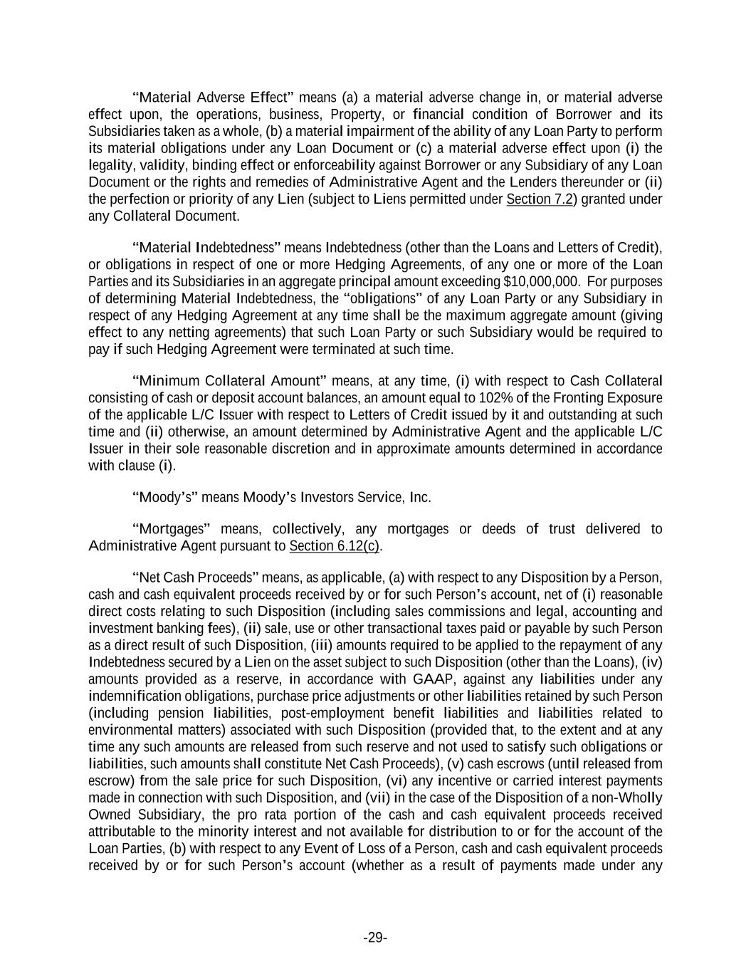 -29- “Material Adverse Effect” means (a) a material adverse change in, or material adverse effect upon, the operations, business, Property, or financial condition of Borrower and its Subsidiaries taken as a whole, (b) a material impairment of the ability of any Loan Party to perform its material obligations under any Loan Document or (c) a material adverse effect upon (i) the legality, validity, binding effect or enforceability against Borrower or any Subsidiary of any Loan Document or the rights and remedies of Administrative Agent and the Lenders thereunder or (ii) the perfection or priority of any Lien (subject to Liens permitted under Section 7.2) granted under any Collateral Document. “Material Indebtedness” means Indebtedness (other than the Loans and Letters of Credit), or obligations in respect of one or more Hedging Agreements, of any one or more of the Loan Parties and its Subsidiaries in an aggregate principal amount exceeding $10,000,000. For purposes of determining Material Indebtedness, the “obligations” of any Loan Party or any Subsidiary in respect of any Hedging Agreement at any time shall be the maximum aggregate amount (giving effect to any netting agreements) that such Loan Party or such Subsidiary would be required to pay if such Hedging Agreement were terminated at such time. “Minimum Collateral Amount” means, at any time, (i) with respect to Cash Collateral consisting of cash or deposit account balances, an amount equal to 102% of the Fronting Exposure of the applicable L/C Issuer with respect to Letters of Credit issued by it and outstanding at such time and (ii) otherwise, an amount determined by Administrative Agent and the applicable L/C Issuer in their sole reasonable discretion and in approximate amounts determined in accordance with clause (i). “Moody’s” means Moody’s Investors Service, Inc. “Mortgages” means, collectively, any mortgages or deeds of trust delivered to Administrative Agent pursuant to Section 6.12(c). “Net Cash Proceeds” means, as applicable, (a) with respect to any Disposition by a Person, cash and cash equivalent proceeds received by or for such Person’s account, net of (i) reasonable direct costs relating to such Disposition (including sales commissions and legal, accounting and investment banking fees), (ii) sale, use or other transactional taxes paid or payable by such Person as a direct result of such Disposition, (iii) amounts required to be applied to the repayment of any Indebtedness secured by a Lien on the asset subject to such Disposition (other than the Loans), (iv) amounts provided as a reserve, in accordance with GAAP, against any liabilities under any indemnification obligations, purchase price adjustments or other liabilities retained by such Person (including pension liabilities, post-employment benefit liabilities and liabilities related to environmental matters) associated with such Disposition (provided that, to the extent and at any time any such amounts are released from such reserve and not used to satisfy such obligations or liabilities, such amounts shall constitute Net Cash Proceeds), (v) cash escrows (until released from escrow) from the sale price for such Disposition, (vi) any incentive or carried interest payments made in connection with such Disposition, and (vii) in the case of the Disposition of a non-Wholly Owned Subsidiary, the pro rata portion of the cash and cash equivalent proceeds received attributable to the minority interest and not available for distribution to or for the account of the Loan Parties, (b) with respect to any Event of Loss of a Person, cash and cash equivalent proceeds received by or for such Person’s account (whether as a result of payments made under any