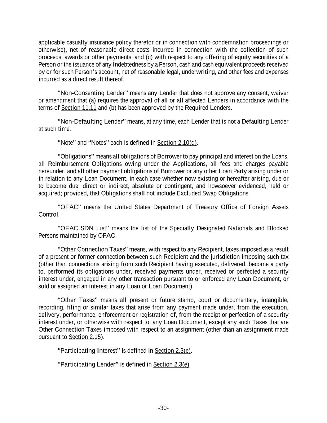 -30- applicable casualty insurance policy therefor or in connection with condemnation proceedings or otherwise), net of reasonable direct costs incurred in connection with the collection of such proceeds, awards or other payments, and (c) with respect to any offering of equity securities of a Person or the issuance of any Indebtedness by a Person, cash and cash equivalent proceeds received by or for such Person’s account, net of reasonable legal, underwriting, and other fees and expenses incurred as a direct result thereof. “Non-Consenting Lender” means any Lender that does not approve any consent, waiver or amendment that (a) requires the approval of all or all affected Lenders in accordance with the terms of Section 11.11 and (b) has been approved by the Required Lenders. “Non-Defaulting Lender” means, at any time, each Lender that is not a Defaulting Lender at such time. “Note” and “Notes” each is defined in Section 2.10(d). “Obligations” means all obligations of Borrower to pay principal and interest on the Loans, all Reimbursement Obligations owing under the Applications, all fees and charges payable hereunder, and all other payment obligations of Borrower or any other Loan Party arising under or in relation to any Loan Document, in each case whether now existing or hereafter arising, due or to become due, direct or indirect, absolute or contingent, and howsoever evidenced, held or acquired; provided, that Obligations shall not include Excluded Swap Obligations. “OFAC” means the United States Department of Treasury Office of Foreign Assets Control. “OFAC SDN List” means the list of the Specially Designated Nationals and Blocked Persons maintained by OFAC. “Other Connection Taxes” means, with respect to any Recipient, taxes imposed as a result of a present or former connection between such Recipient and the jurisdiction imposing such tax (other than connections arising from such Recipient having executed, delivered, become a party to, performed its obligations under, received payments under, received or perfected a security interest under, engaged in any other transaction pursuant to or enforced any Loan Document, or sold or assigned an interest in any Loan or Loan Document). “Other Taxes” means all present or future stamp, court or documentary, intangible, recording, filing or similar taxes that arise from any payment made under, from the execution, delivery, performance, enforcement or registration of, from the receipt or perfection of a security interest under, or otherwise with respect to, any Loan Document, except any such Taxes that are Other Connection Taxes imposed with respect to an assignment (other than an assignment made pursuant to Section 2.15). “Participating Interest” is defined in Section 2.3(e). “Participating Lender” is defined in Section 2.3(e).