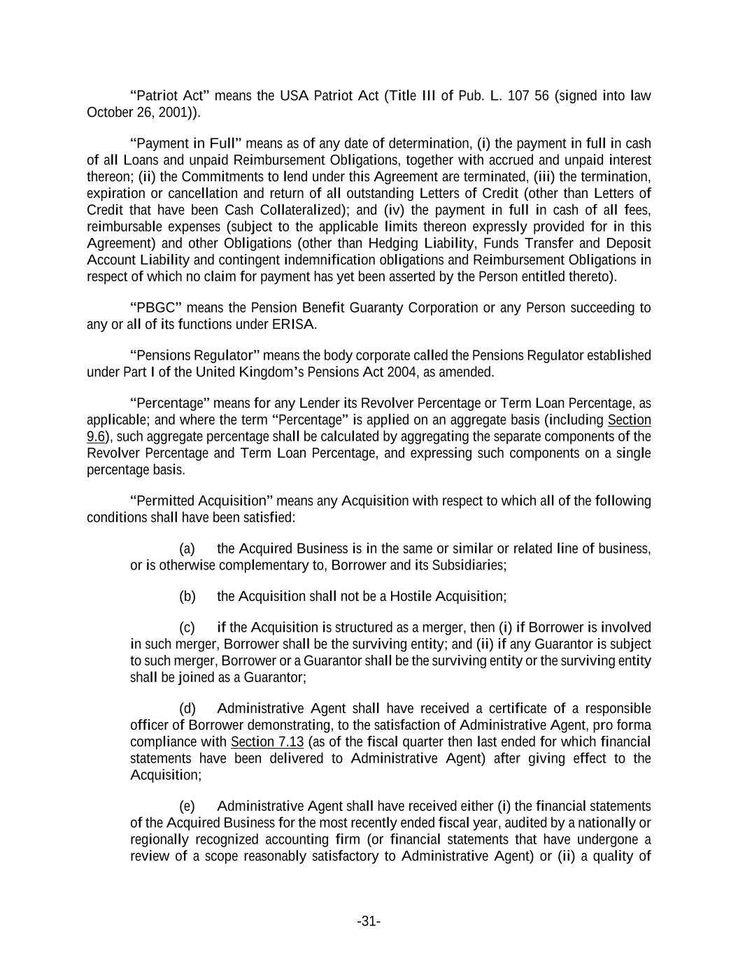 -31- “Patriot Act” means the USA Patriot Act (Title III of Pub. L. 107 56 (signed into law October 26, 2001)). “Payment in Full” means as of any date of determination, (i) the payment in full in cash of all Loans and unpaid Reimbursement Obligations, together with accrued and unpaid interest thereon; (ii) the Commitments to lend under this Agreement are terminated, (iii) the termination, expiration or cancellation and return of all outstanding Letters of Credit (other than Letters of Credit that have been Cash Collateralized); and (iv) the payment in full in cash of all fees, reimbursable expenses (subject to the applicable limits thereon expressly provided for in this Agreement) and other Obligations (other than Hedging Liability, Funds Transfer and Deposit Account Liability and contingent indemnification obligations and Reimbursement Obligations in respect of which no claim for payment has yet been asserted by the Person entitled thereto). “PBGC” means the Pension Benefit Guaranty Corporation or any Person succeeding to any or all of its functions under ERISA. “Pensions Regulator” means the body corporate called the Pensions Regulator established under Part I of the United Kingdom’s Pensions Act 2004, as amended. “Percentage” means for any Lender its Revolver Percentage or Term Loan Percentage, as applicable; and where the term “Percentage” is applied on an aggregate basis (including Section 9.6), such aggregate percentage shall be calculated by aggregating the separate components of the Revolver Percentage and Term Loan Percentage, and expressing such components on a single percentage basis. “Permitted Acquisition” means any Acquisition with respect to which all of the following conditions shall have been satisfied: (a) the Acquired Business is in the same or similar or related line of business, or is otherwise complementary to, Borrower and its Subsidiaries; (b) the Acquisition shall not be a Hostile Acquisition; (c) if the Acquisition is structured as a merger, then (i) if Borrower is involved in such merger, Borrower shall be the surviving entity; and (ii) if any Guarantor is subject to such merger, Borrower or a Guarantor shall be the surviving entity or the surviving entity shall be joined as a Guarantor; (d) Administrative Agent shall have received a certificate of a responsible officer of Borrower demonstrating, to the satisfaction of Administrative Agent, pro forma compliance with Section 7.13 (as of the fiscal quarter then last ended for which financial statements have been delivered to Administrative Agent) after giving effect to the Acquisition; (e) Administrative Agent shall have received either (i) the financial statements of the Acquired Business for the most recently ended fiscal year, audited by a nationally or regionally recognized accounting firm (or financial statements that have undergone a review of a scope reasonably satisfactory to Administrative Agent) or (ii) a quality of
