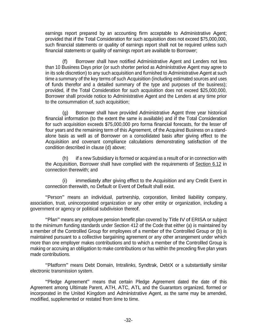 -32- earnings report prepared by an accounting firm acceptable to Administrative Agent; provided that if the Total Consideration for such acquisition does not exceed $75,000,000, such financial statements or quality of earnings report shall not be required unless such financial statements or quality of earnings report are available to Borrower; (f) Borrower shall have notified Administrative Agent and Lenders not less than 10 Business Days prior (or such shorter period as Administrative Agent may agree to in its sole discretion) to any such acquisition and furnished to Administrative Agent at such time a summary of the key terms of such Acquisition (including estimated sources and uses of funds therefor and a detailed summary of the type and purposes of the business); provided, if the Total Consideration for such acquisition does not exceed $25,000,000, Borrower shall provide notice to Administrative Agent and the Lenders at any time prior to the consummation of, such acquisition; (g) Borrower shall have provided Administrative Agent three year historical financial information (to the extent the same is available) and if the Total Consideration for such acquisition exceeds $75,000,000 pro forma financial forecasts, for the lesser of four years and the remaining term of this Agreement, of the Acquired Business on a stand- alone basis as well as of Borrower on a consolidated basis after giving effect to the Acquisition and covenant compliance calculations demonstrating satisfaction of the condition described in clause (d) above; (h) if a new Subsidiary is formed or acquired as a result of or in connection with the Acquisition, Borrower shall have complied with the requirements of Section 6.12 in connection therewith; and (i) immediately after giving effect to the Acquisition and any Credit Event in connection therewith, no Default or Event of Default shall exist. “Person” means an individual, partnership, corporation, limited liability company, association, trust, unincorporated organization or any other entity or organization, including a government or agency or political subdivision thereof. “Plan” means any employee pension benefit plan covered by Title IV of ERISA or subject to the minimum funding standards under Section 412 of the Code that either (a) is maintained by a member of the Controlled Group for employees of a member of the Controlled Group or (b) is maintained pursuant to a collective bargaining agreement or any other arrangement under which more than one employer makes contributions and to which a member of the Controlled Group is making or accruing an obligation to make contributions or has within the preceding five plan years made contributions. “Platform” means Debt Domain, Intralinks, Syndtrak, DebtX or a substantially similar electronic transmission system. “Pledge Agreement” means that certain Pledge Agreement dated the date of this Agreement among Ultimate Parent, ATH, ATC, ATL and the Guarantors organized, formed or incorporated in the United Kingdom and Administrative Agent, as the same may be amended, modified, supplemented or restated from time to time.