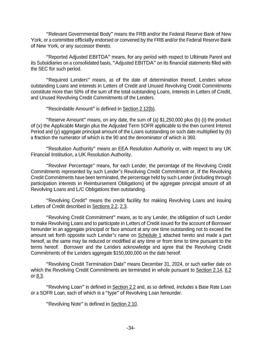-34- “Relevant Governmental Body” means the FRB and/or the Federal Reserve Bank of New York, or a committee officially endorsed or convened by the FRB and/or the Federal Reserve Bank of New York, or any successor thereto. “Reported Adjusted EBITDA” means, for any period with respect to Ultimate Parent and its Subsidiaries on a consolidated basis, “Adjusted EBITDA” on its financial statements filed with the SEC for such period. “Required Lenders” means, as of the date of determination thereof, Lenders whose outstanding Loans and interests in Letters of Credit and Unused Revolving Credit Commitments constitute more than 50% of the sum of the total outstanding Loans, interests in Letters of Credit, and Unused Revolving Credit Commitments of the Lenders. “Rescindable Amount” is defined in Section 2.12(b). “Reserve Amount” means, on any date, the sum of (a) $1,250,000 plus (b) (i) the product of (x) the Applicable Margin plus the Adjusted Term SOFR applicable to the then current Interest Period and (y) aggregate principal amount of the Loans outstanding on such date multiplied by (b) a fraction the numerator of which is the 90 and the denominator of which is 360. “Resolution Authority” means an EEA Resolution Authority or, with respect to any UK Financial Institution, a UK Resolution Authority. “Revolver Percentage” means, for each Lender, the percentage of the Revolving Credit Commitments represented by such Lender’s Revolving Credit Commitment or, if the Revolving Credit Commitments have been terminated, the percentage held by such Lender (including through participation interests in Reimbursement Obligations) of the aggregate principal amount of all Revolving Loans and L/C Obligations then outstanding. “Revolving Credit” means the credit facility for making Revolving Loans and issuing Letters of Credit described in Sections 2.2, 2.3. “Revolving Credit Commitment” means, as to any Lender, the obligation of such Lender to make Revolving Loans and to participate in Letters of Credit issued for the account of Borrower hereunder in an aggregate principal or face amount at any one time outstanding not to exceed the amount set forth opposite such Lender’s name on Schedule 1 attached hereto and made a part hereof, as the same may be reduced or modified at any time or from time to time pursuant to the terms hereof. Borrower and the Lenders acknowledge and agree that the Revolving Credit Commitments of the Lenders aggregate $150,000,000 on the date hereof. “Revolving Credit Termination Date” means December 31, 2024, or such earlier date on which the Revolving Credit Commitments are terminated in whole pursuant to Section 2.14, 8.2 or 8.3. “Revolving Loan” is defined in Section 2.2 and, as so defined, includes a Base Rate Loan or a SOFR Loan, each of which is a “type” of Revolving Loan hereunder. “Revolving Note” is defined in Section 2.10.