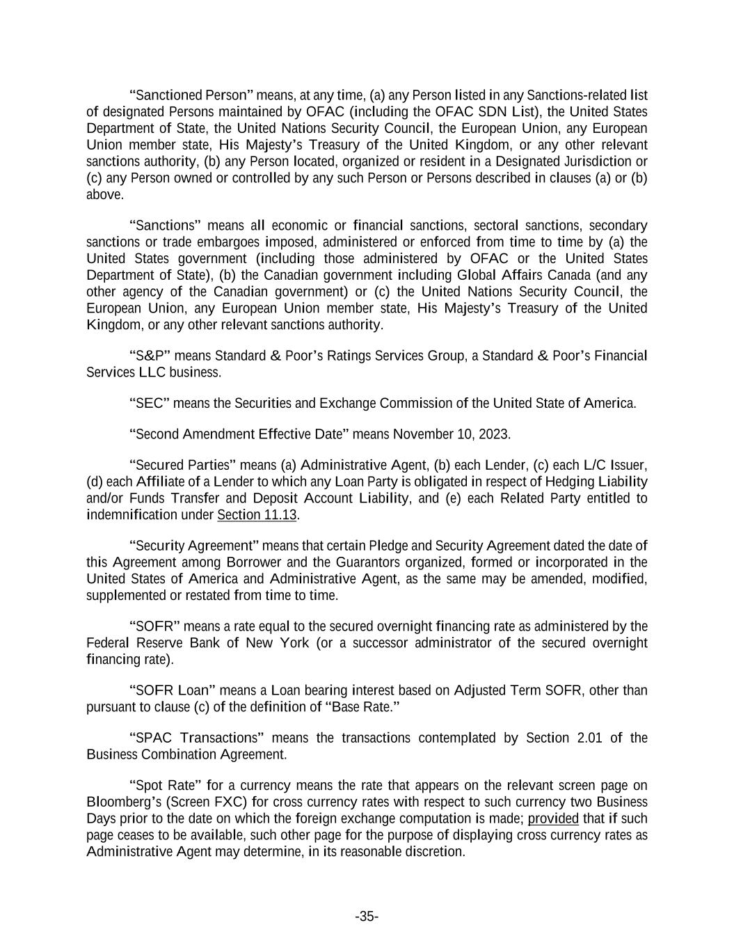 -35- “Sanctioned Person” means, at any time, (a) any Person listed in any Sanctions-related list of designated Persons maintained by OFAC (including the OFAC SDN List), the United States Department of State, the United Nations Security Council, the European Union, any European Union member state, His Majesty’s Treasury of the United Kingdom, or any other relevant sanctions authority, (b) any Person located, organized or resident in a Designated Jurisdiction or (c) any Person owned or controlled by any such Person or Persons described in clauses (a) or (b) above. “Sanctions” means all economic or financial sanctions, sectoral sanctions, secondary sanctions or trade embargoes imposed, administered or enforced from time to time by (a) the United States government (including those administered by OFAC or the United States Department of State), (b) the Canadian government including Global Affairs Canada (and any other agency of the Canadian government) or (c) the United Nations Security Council, the European Union, any European Union member state, His Majesty’s Treasury of the United Kingdom, or any other relevant sanctions authority. “S&P” means Standard & Poor’s Ratings Services Group, a Standard & Poor’s Financial Services LLC business. “SEC” means the Securities and Exchange Commission of the United State of America. “Second Amendment Effective Date” means November 10, 2023. “Secured Parties” means (a) Administrative Agent, (b) each Lender, (c) each L/C Issuer, (d) each Affiliate of a Lender to which any Loan Party is obligated in respect of Hedging Liability and/or Funds Transfer and Deposit Account Liability, and (e) each Related Party entitled to indemnification under Section 11.13. “Security Agreement” means that certain Pledge and Security Agreement dated the date of this Agreement among Borrower and the Guarantors organized, formed or incorporated in the United States of America and Administrative Agent, as the same may be amended, modified, supplemented or restated from time to time. “SOFR” means a rate equal to the secured overnight financing rate as administered by the Federal Reserve Bank of New York (or a successor administrator of the secured overnight financing rate). “SOFR Loan” means a Loan bearing interest based on Adjusted Term SOFR, other than pursuant to clause (c) of the definition of “Base Rate.” “SPAC Transactions” means the transactions contemplated by Section 2.01 of the Business Combination Agreement. “Spot Rate” for a currency means the rate that appears on the relevant screen page on Bloomberg’s (Screen FXC) for cross currency rates with respect to such currency two Business Days prior to the date on which the foreign exchange computation is made; provided that if such page ceases to be available, such other page for the purpose of displaying cross currency rates as Administrative Agent may determine, in its reasonable discretion.