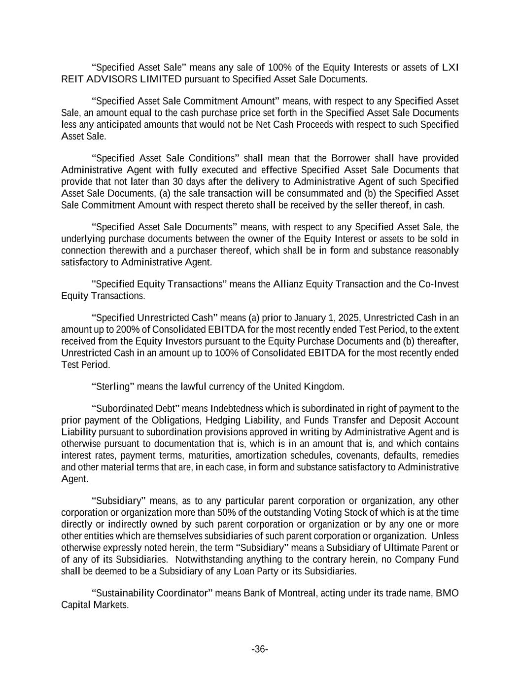 -36- “Specified Asset Sale” means any sale of 100% of the Equity Interests or assets of LXI REIT ADVISORS LIMITED pursuant to Specified Asset Sale Documents. “Specified Asset Sale Commitment Amount” means, with respect to any Specified Asset Sale, an amount equal to the cash purchase price set forth in the Specified Asset Sale Documents less any anticipated amounts that would not be Net Cash Proceeds with respect to such Specified Asset Sale. “Specified Asset Sale Conditions” shall mean that the Borrower shall have provided Administrative Agent with fully executed and effective Specified Asset Sale Documents that provide that not later than 30 days after the delivery to Administrative Agent of such Specified Asset Sale Documents, (a) the sale transaction will be consummated and (b) the Specified Asset Sale Commitment Amount with respect thereto shall be received by the seller thereof, in cash. “Specified Asset Sale Documents” means, with respect to any Specified Asset Sale, the underlying purchase documents between the owner of the Equity Interest or assets to be sold in connection therewith and a purchaser thereof, which shall be in form and substance reasonably satisfactory to Administrative Agent. "Specified Equity Transactions” means the Allianz Equity Transaction and the Co-Invest Equity Transactions. “Specified Unrestricted Cash” means (a) prior to January 1, 2025, Unrestricted Cash in an amount up to 200% of Consolidated EBITDA for the most recently ended Test Period, to the extent received from the Equity Investors pursuant to the Equity Purchase Documents and (b) thereafter, Unrestricted Cash in an amount up to 100% of Consolidated EBITDA for the most recently ended Test Period. “Sterling” means the lawful currency of the United Kingdom. “Subordinated Debt” means Indebtedness which is subordinated in right of payment to the prior payment of the Obligations, Hedging Liability, and Funds Transfer and Deposit Account Liability pursuant to subordination provisions approved in writing by Administrative Agent and is otherwise pursuant to documentation that is, which is in an amount that is, and which contains interest rates, payment terms, maturities, amortization schedules, covenants, defaults, remedies and other material terms that are, in each case, in form and substance satisfactory to Administrative Agent. “Subsidiary” means, as to any particular parent corporation or organization, any other corporation or organization more than 50% of the outstanding Voting Stock of which is at the time directly or indirectly owned by such parent corporation or organization or by any one or more other entities which are themselves subsidiaries of such parent corporation or organization. Unless otherwise expressly noted herein, the term “Subsidiary” means a Subsidiary of Ultimate Parent or of any of its Subsidiaries. Notwithstanding anything to the contrary herein, no Company Fund shall be deemed to be a Subsidiary of any Loan Party or its Subsidiaries. “Sustainability Coordinator” means Bank of Montreal, acting under its trade name, BMO Capital Markets.