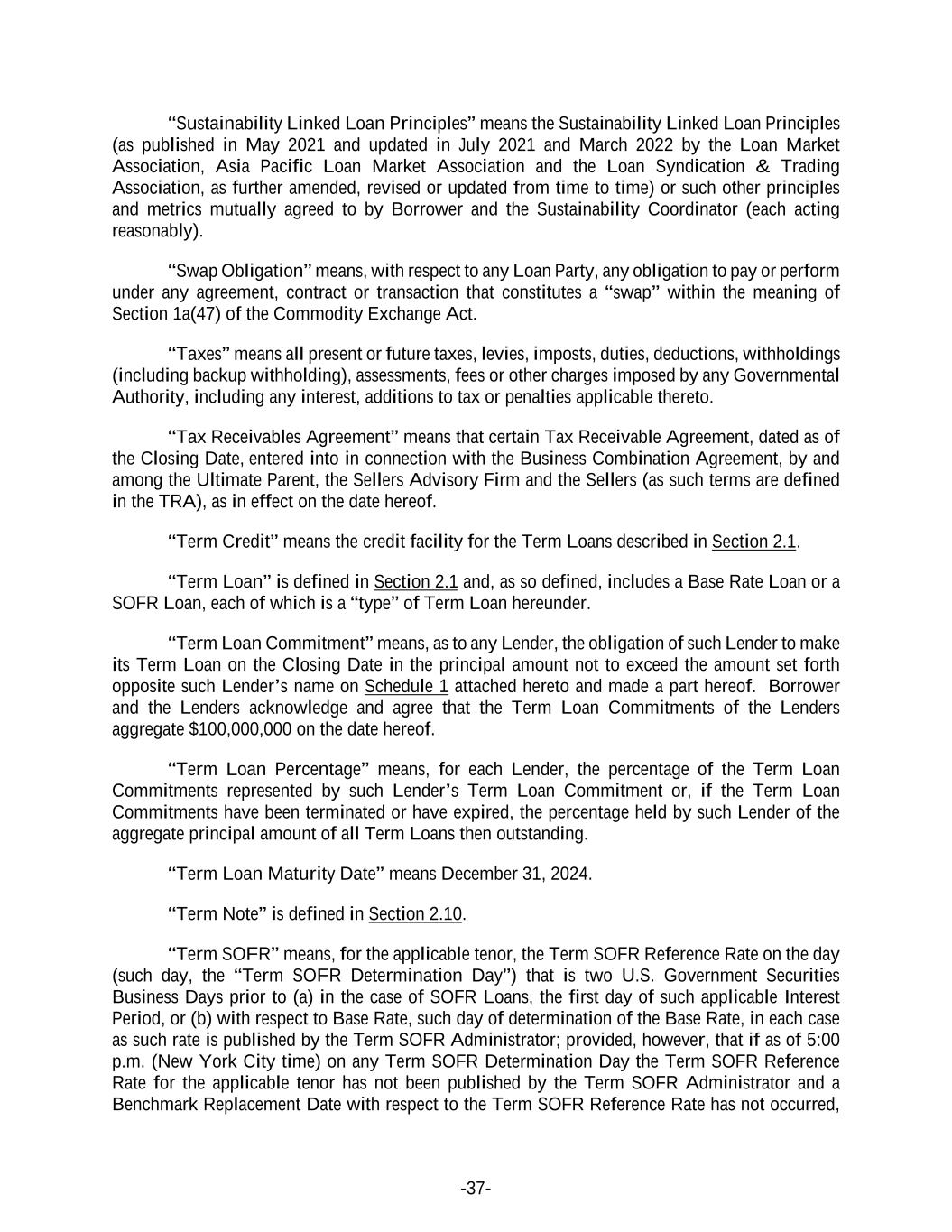 -37- “Sustainability Linked Loan Principles” means the Sustainability Linked Loan Principles (as published in May 2021 and updated in July 2021 and March 2022 by the Loan Market Association, Asia Pacific Loan Market Association and the Loan Syndication & Trading Association, as further amended, revised or updated from time to time) or such other principles and metrics mutually agreed to by Borrower and the Sustainability Coordinator (each acting reasonably). “Swap Obligation” means, with respect to any Loan Party, any obligation to pay or perform under any agreement, contract or transaction that constitutes a “swap” within the meaning of Section 1a(47) of the Commodity Exchange Act. “Taxes” means all present or future taxes, levies, imposts, duties, deductions, withholdings (including backup withholding), assessments, fees or other charges imposed by any Governmental Authority, including any interest, additions to tax or penalties applicable thereto. “Tax Receivables Agreement” means that certain Tax Receivable Agreement, dated as of the Closing Date, entered into in connection with the Business Combination Agreement, by and among the Ultimate Parent, the Sellers Advisory Firm and the Sellers (as such terms are defined in the TRA), as in effect on the date hereof. “Term Credit” means the credit facility for the Term Loans described in Section 2.1. “Term Loan” is defined in Section 2.1 and, as so defined, includes a Base Rate Loan or a SOFR Loan, each of which is a “type” of Term Loan hereunder. “Term Loan Commitment” means, as to any Lender, the obligation of such Lender to make its Term Loan on the Closing Date in the principal amount not to exceed the amount set forth opposite such Lender’s name on Schedule 1 attached hereto and made a part hereof. Borrower and the Lenders acknowledge and agree that the Term Loan Commitments of the Lenders aggregate $100,000,000 on the date hereof. “Term Loan Percentage” means, for each Lender, the percentage of the Term Loan Commitments represented by such Lender’s Term Loan Commitment or, if the Term Loan Commitments have been terminated or have expired, the percentage held by such Lender of the aggregate principal amount of all Term Loans then outstanding. “Term Loan Maturity Date” means December 31, 2024. “Term Note” is defined in Section 2.10. “Term SOFR” means, for the applicable tenor, the Term SOFR Reference Rate on the day (such day, the “Term SOFR Determination Day”) that is two U.S. Government Securities Business Days prior to (a) in the case of SOFR Loans, the first day of such applicable Interest Period, or (b) with respect to Base Rate, such day of determination of the Base Rate, in each case as such rate is published by the Term SOFR Administrator; provided, however, that if as of 5:00 p.m. (New York City time) on any Term SOFR Determination Day the Term SOFR Reference Rate for the applicable tenor has not been published by the Term SOFR Administrator and a Benchmark Replacement Date with respect to the Term SOFR Reference Rate has not occurred,