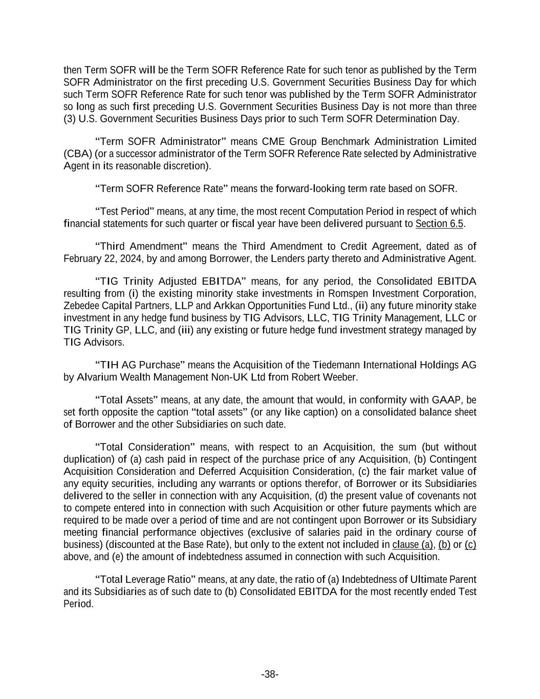 -38- then Term SOFR will be the Term SOFR Reference Rate for such tenor as published by the Term SOFR Administrator on the first preceding U.S. Government Securities Business Day for which such Term SOFR Reference Rate for such tenor was published by the Term SOFR Administrator so long as such first preceding U.S. Government Securities Business Day is not more than three (3) U.S. Government Securities Business Days prior to such Term SOFR Determination Day. “Term SOFR Administrator” means CME Group Benchmark Administration Limited (CBA) (or a successor administrator of the Term SOFR Reference Rate selected by Administrative Agent in its reasonable discretion). “Term SOFR Reference Rate” means the forward-looking term rate based on SOFR. “Test Period” means, at any time, the most recent Computation Period in respect of which financial statements for such quarter or fiscal year have been delivered pursuant to Section 6.5. “Third Amendment” means the Third Amendment to Credit Agreement, dated as of February 22, 2024, by and among Borrower, the Lenders party thereto and Administrative Agent. “TIG Trinity Adjusted EBITDA” means, for any period, the Consolidated EBITDA resulting from (i) the existing minority stake investments in Romspen Investment Corporation, Zebedee Capital Partners, LLP and Arkkan Opportunities Fund Ltd., (ii) any future minority stake investment in any hedge fund business by TIG Advisors, LLC, TIG Trinity Management, LLC or TIG Trinity GP, LLC, and (iii) any existing or future hedge fund investment strategy managed by TIG Advisors. “TIH AG Purchase” means the Acquisition of the Tiedemann International Holdings AG by Alvarium Wealth Management Non-UK Ltd from Robert Weeber. “Total Assets” means, at any date, the amount that would, in conformity with GAAP, be set forth opposite the caption “total assets” (or any like caption) on a consolidated balance sheet of Borrower and the other Subsidiaries on such date. “Total Consideration” means, with respect to an Acquisition, the sum (but without duplication) of (a) cash paid in respect of the purchase price of any Acquisition, (b) Contingent Acquisition Consideration and Deferred Acquisition Consideration, (c) the fair market value of any equity securities, including any warrants or options therefor, of Borrower or its Subsidiaries delivered to the seller in connection with any Acquisition, (d) the present value of covenants not to compete entered into in connection with such Acquisition or other future payments which are required to be made over a period of time and are not contingent upon Borrower or its Subsidiary meeting financial performance objectives (exclusive of salaries paid in the ordinary course of business) (discounted at the Base Rate), but only to the extent not included in clause (a), (b) or (c) above, and (e) the amount of indebtedness assumed in connection with such Acquisition. “Total Leverage Ratio” means, at any date, the ratio of (a) Indebtedness of Ultimate Parent and its Subsidiaries as of such date to (b) Consolidated EBITDA for the most recently ended Test Period.