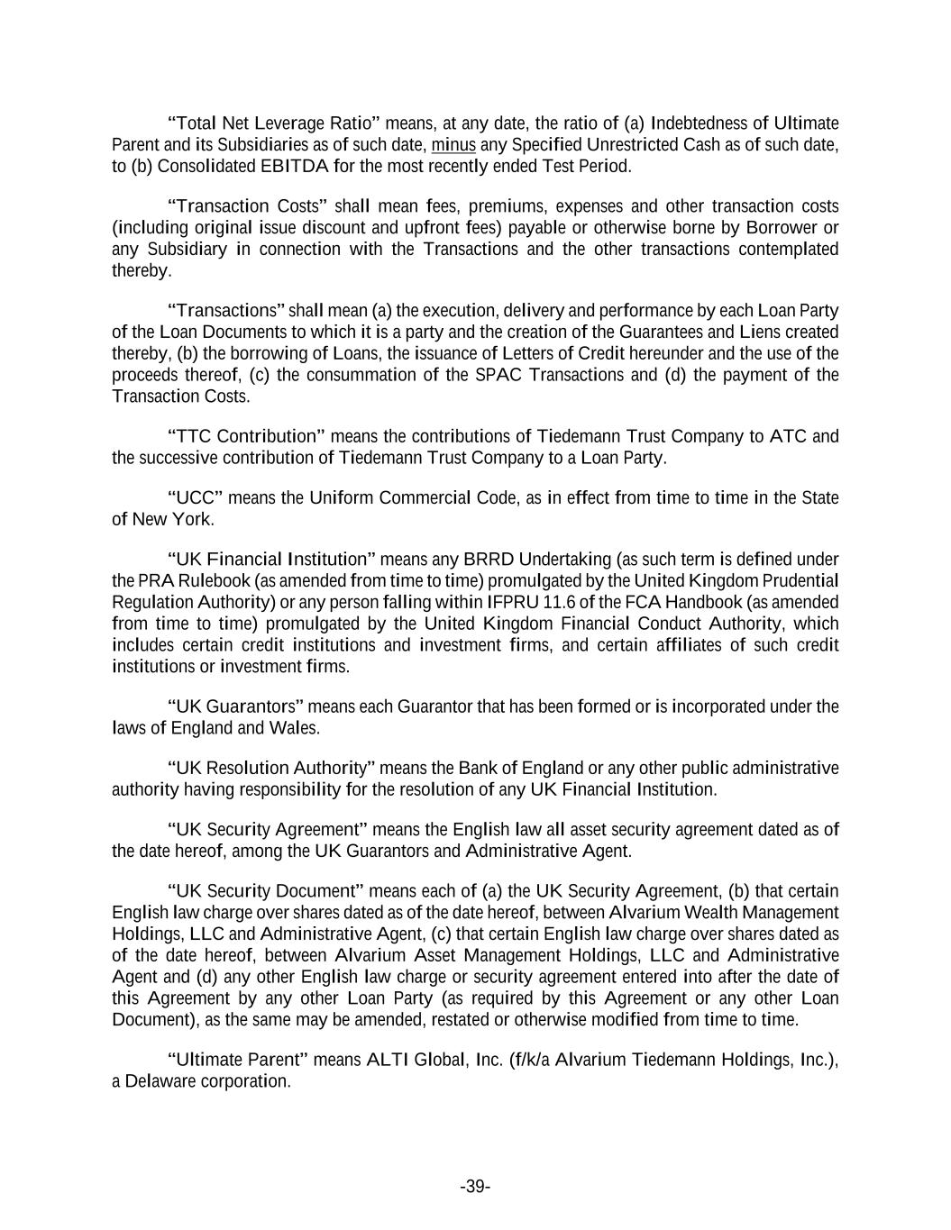 -39- “Total Net Leverage Ratio” means, at any date, the ratio of (a) Indebtedness of Ultimate Parent and its Subsidiaries as of such date, minus any Specified Unrestricted Cash as of such date, to (b) Consolidated EBITDA for the most recently ended Test Period. “Transaction Costs” shall mean fees, premiums, expenses and other transaction costs (including original issue discount and upfront fees) payable or otherwise borne by Borrower or any Subsidiary in connection with the Transactions and the other transactions contemplated thereby. “Transactions” shall mean (a) the execution, delivery and performance by each Loan Party of the Loan Documents to which it is a party and the creation of the Guarantees and Liens created thereby, (b) the borrowing of Loans, the issuance of Letters of Credit hereunder and the use of the proceeds thereof, (c) the consummation of the SPAC Transactions and (d) the payment of the Transaction Costs. “TTC Contribution” means the contributions of Tiedemann Trust Company to ATC and the successive contribution of Tiedemann Trust Company to a Loan Party. “UCC” means the Uniform Commercial Code, as in effect from time to time in the State of New York. “UK Financial Institution” means any BRRD Undertaking (as such term is defined under the PRA Rulebook (as amended from time to time) promulgated by the United Kingdom Prudential Regulation Authority) or any person falling within IFPRU 11.6 of the FCA Handbook (as amended from time to time) promulgated by the United Kingdom Financial Conduct Authority, which includes certain credit institutions and investment firms, and certain affiliates of such credit institutions or investment firms. “UK Guarantors” means each Guarantor that has been formed or is incorporated under the laws of England and Wales. “UK Resolution Authority” means the Bank of England or any other public administrative authority having responsibility for the resolution of any UK Financial Institution. “UK Security Agreement” means the English law all asset security agreement dated as of the date hereof, among the UK Guarantors and Administrative Agent. “UK Security Document” means each of (a) the UK Security Agreement, (b) that certain English law charge over shares dated as of the date hereof, between Alvarium Wealth Management Holdings, LLC and Administrative Agent, (c) that certain English law charge over shares dated as of the date hereof, between Alvarium Asset Management Holdings, LLC and Administrative Agent and (d) any other English law charge or security agreement entered into after the date of this Agreement by any other Loan Party (as required by this Agreement or any other Loan Document), as the same may be amended, restated or otherwise modified from time to time. “Ultimate Parent” means ALTI Global, Inc. (f/k/a Alvarium Tiedemann Holdings, Inc.), a Delaware corporation.