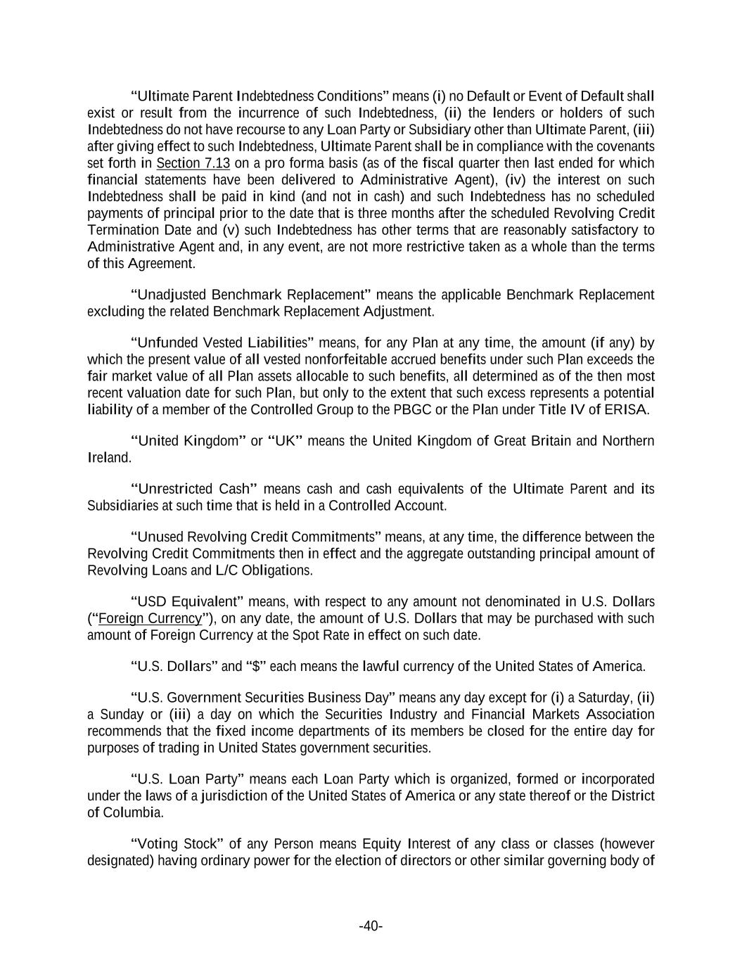 -40- “Ultimate Parent Indebtedness Conditions” means (i) no Default or Event of Default shall exist or result from the incurrence of such Indebtedness, (ii) the lenders or holders of such Indebtedness do not have recourse to any Loan Party or Subsidiary other than Ultimate Parent, (iii) after giving effect to such Indebtedness, Ultimate Parent shall be in compliance with the covenants set forth in Section 7.13 on a pro forma basis (as of the fiscal quarter then last ended for which financial statements have been delivered to Administrative Agent), (iv) the interest on such Indebtedness shall be paid in kind (and not in cash) and such Indebtedness has no scheduled payments of principal prior to the date that is three months after the scheduled Revolving Credit Termination Date and (v) such Indebtedness has other terms that are reasonably satisfactory to Administrative Agent and, in any event, are not more restrictive taken as a whole than the terms of this Agreement. “Unadjusted Benchmark Replacement” means the applicable Benchmark Replacement excluding the related Benchmark Replacement Adjustment. “Unfunded Vested Liabilities” means, for any Plan at any time, the amount (if any) by which the present value of all vested nonforfeitable accrued benefits under such Plan exceeds the fair market value of all Plan assets allocable to such benefits, all determined as of the then most recent valuation date for such Plan, but only to the extent that such excess represents a potential liability of a member of the Controlled Group to the PBGC or the Plan under Title IV of ERISA. “United Kingdom” or “UK” means the United Kingdom of Great Britain and Northern Ireland. “Unrestricted Cash” means cash and cash equivalents of the Ultimate Parent and its Subsidiaries at such time that is held in a Controlled Account. “Unused Revolving Credit Commitments” means, at any time, the difference between the Revolving Credit Commitments then in effect and the aggregate outstanding principal amount of Revolving Loans and L/C Obligations. “USD Equivalent” means, with respect to any amount not denominated in U.S. Dollars (“Foreign Currency”), on any date, the amount of U.S. Dollars that may be purchased with such amount of Foreign Currency at the Spot Rate in effect on such date. “U.S. Dollars” and “$” each means the lawful currency of the United States of America. “U.S. Government Securities Business Day” means any day except for (i) a Saturday, (ii) a Sunday or (iii) a day on which the Securities Industry and Financial Markets Association recommends that the fixed income departments of its members be closed for the entire day for purposes of trading in United States government securities. “U.S. Loan Party” means each Loan Party which is organized, formed or incorporated under the laws of a jurisdiction of the United States of America or any state thereof or the District of Columbia. “Voting Stock” of any Person means Equity Interest of any class or classes (however designated) having ordinary power for the election of directors or other similar governing body of