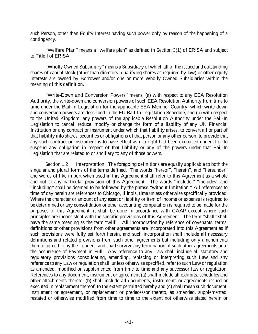 -41- such Person, other than Equity Interest having such power only by reason of the happening of a contingency. “Welfare Plan” means a “welfare plan” as defined in Section 3(1) of ERISA and subject to Title I of ERISA. “Wholly Owned Subsidiary” means a Subsidiary of which all of the issued and outstanding shares of capital stock (other than directors’ qualifying shares as required by law) or other equity interests are owned by Borrower and/or one or more Wholly Owned Subsidiaries within the meaning of this definition. “Write-Down and Conversion Powers” means, (a) with respect to any EEA Resolution Authority, the write-down and conversion powers of such EEA Resolution Authority from time to time under the Bail-In Legislation for the applicable EEA Member Country, which write-down and conversion powers are described in the EU Bail-In Legislation Schedule, and (b) with respect to the United Kingdom, any powers of the applicable Resolution Authority under the Bail-In Legislation to cancel, reduce, modify or change the form of a liability of any UK Financial Institution or any contract or instrument under which that liability arises, to convert all or part of that liability into shares, securities or obligations of that person or any other person, to provide that any such contract or instrument is to have effect as if a right had been exercised under it or to suspend any obligation in respect of that liability or any of the powers under that Bail-In Legislation that are related to or ancillary to any of those powers. Section 1.2 Interpretation. The foregoing definitions are equally applicable to both the singular and plural forms of the terms defined. The words “hereof”, “herein”, and “hereunder” and words of like import when used in this Agreement shall refer to this Agreement as a whole and not to any particular provision of this Agreement. The words “include,” “includes” and “including” shall be deemed to be followed by the phrase “without limitation.” All references to time of day herein are references to Chicago, Illinois, time unless otherwise specifically provided. Where the character or amount of any asset or liability or item of income or expense is required to be determined or any consolidation or other accounting computation is required to be made for the purposes of this Agreement, it shall be done in accordance with GAAP except where such principles are inconsistent with the specific provisions of this Agreement. The term “shall” shall have the same meaning as the term “will”. All incorporation by reference of covenants, terms, definitions or other provisions from other agreements are incorporated into this Agreement as if such provisions were fully set forth herein, and such incorporation shall include all necessary definitions and related provisions from such other agreements but including only amendments thereto agreed to by the Lenders, and shall survive any termination of such other agreements until the occurrence of Payment in Full. Any reference to any Law shall include all statutory and regulatory provisions consolidating, amending, replacing or interpreting such Law and any reference to any Law or regulation shall, unless otherwise specified, refer to such Law or regulation as amended, modified or supplemented from time to time and any successor law or regulation. References to any document, instrument or agreement (a) shall include all exhibits, schedules and other attachments thereto, (b) shall include all documents, instruments or agreements issued or executed in replacement thereof, to the extent permitted hereby and (c) shall mean such document, instrument or agreement, or replacement or predecessor thereto, as amended, supplemented, restated or otherwise modified from time to time to the extent not otherwise stated herein or