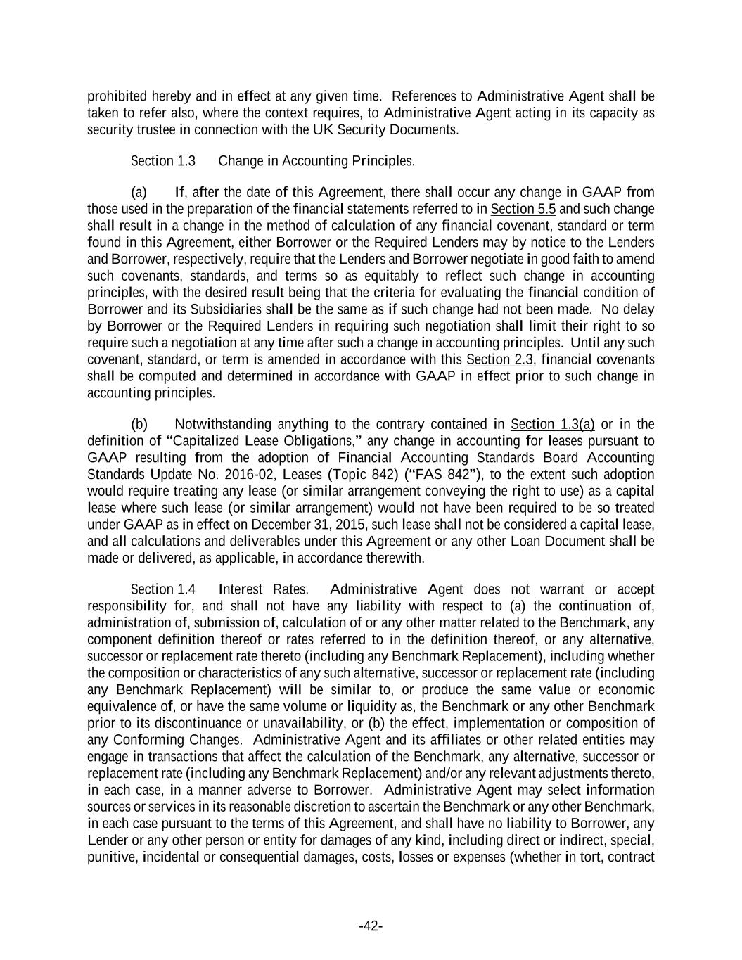 -42- prohibited hereby and in effect at any given time. References to Administrative Agent shall be taken to refer also, where the context requires, to Administrative Agent acting in its capacity as security trustee in connection with the UK Security Documents. Section 1.3 Change in Accounting Principles. (a) If, after the date of this Agreement, there shall occur any change in GAAP from those used in the preparation of the financial statements referred to in Section 5.5 and such change shall result in a change in the method of calculation of any financial covenant, standard or term found in this Agreement, either Borrower or the Required Lenders may by notice to the Lenders and Borrower, respectively, require that the Lenders and Borrower negotiate in good faith to amend such covenants, standards, and terms so as equitably to reflect such change in accounting principles, with the desired result being that the criteria for evaluating the financial condition of Borrower and its Subsidiaries shall be the same as if such change had not been made. No delay by Borrower or the Required Lenders in requiring such negotiation shall limit their right to so require such a negotiation at any time after such a change in accounting principles. Until any such covenant, standard, or term is amended in accordance with this Section 2.3, financial covenants shall be computed and determined in accordance with GAAP in effect prior to such change in accounting principles. (b) Notwithstanding anything to the contrary contained in Section 1.3(a) or in the definition of “Capitalized Lease Obligations,” any change in accounting for leases pursuant to GAAP resulting from the adoption of Financial Accounting Standards Board Accounting Standards Update No. 2016-02, Leases (Topic 842) (“FAS 842”), to the extent such adoption would require treating any lease (or similar arrangement conveying the right to use) as a capital lease where such lease (or similar arrangement) would not have been required to be so treated under GAAP as in effect on December 31, 2015, such lease shall not be considered a capital lease, and all calculations and deliverables under this Agreement or any other Loan Document shall be made or delivered, as applicable, in accordance therewith. Section 1.4 Interest Rates. Administrative Agent does not warrant or accept responsibility for, and shall not have any liability with respect to (a) the continuation of, administration of, submission of, calculation of or any other matter related to the Benchmark, any component definition thereof or rates referred to in the definition thereof, or any alternative, successor or replacement rate thereto (including any Benchmark Replacement), including whether the composition or characteristics of any such alternative, successor or replacement rate (including any Benchmark Replacement) will be similar to, or produce the same value or economic equivalence of, or have the same volume or liquidity as, the Benchmark or any other Benchmark prior to its discontinuance or unavailability, or (b) the effect, implementation or composition of any Conforming Changes. Administrative Agent and its affiliates or other related entities may engage in transactions that affect the calculation of the Benchmark, any alternative, successor or replacement rate (including any Benchmark Replacement) and/or any relevant adjustments thereto, in each case, in a manner adverse to Borrower. Administrative Agent may select information sources or services in its reasonable discretion to ascertain the Benchmark or any other Benchmark, in each case pursuant to the terms of this Agreement, and shall have no liability to Borrower, any Lender or any other person or entity for damages of any kind, including direct or indirect, special, punitive, incidental or consequential damages, costs, losses or expenses (whether in tort, contract