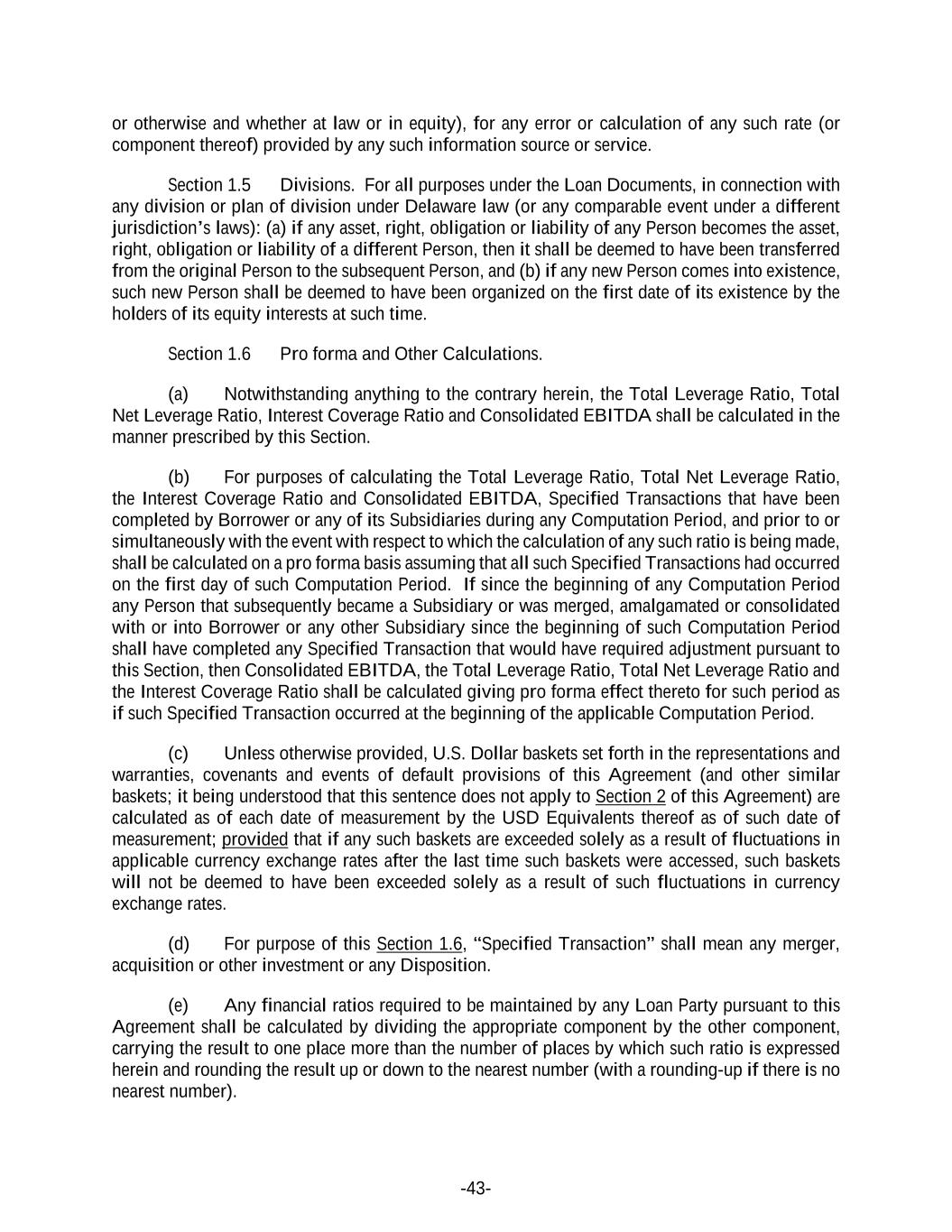 -43- or otherwise and whether at law or in equity), for any error or calculation of any such rate (or component thereof) provided by any such information source or service. Section 1.5 Divisions. For all purposes under the Loan Documents, in connection with any division or plan of division under Delaware law (or any comparable event under a different jurisdiction’s laws): (a) if any asset, right, obligation or liability of any Person becomes the asset, right, obligation or liability of a different Person, then it shall be deemed to have been transferred from the original Person to the subsequent Person, and (b) if any new Person comes into existence, such new Person shall be deemed to have been organized on the first date of its existence by the holders of its equity interests at such time. Section 1.6 Pro forma and Other Calculations. (a) Notwithstanding anything to the contrary herein, the Total Leverage Ratio, Total Net Leverage Ratio, Interest Coverage Ratio and Consolidated EBITDA shall be calculated in the manner prescribed by this Section. (b) For purposes of calculating the Total Leverage Ratio, Total Net Leverage Ratio, the Interest Coverage Ratio and Consolidated EBITDA, Specified Transactions that have been completed by Borrower or any of its Subsidiaries during any Computation Period, and prior to or simultaneously with the event with respect to which the calculation of any such ratio is being made, shall be calculated on a pro forma basis assuming that all such Specified Transactions had occurred on the first day of such Computation Period. If since the beginning of any Computation Period any Person that subsequently became a Subsidiary or was merged, amalgamated or consolidated with or into Borrower or any other Subsidiary since the beginning of such Computation Period shall have completed any Specified Transaction that would have required adjustment pursuant to this Section, then Consolidated EBITDA, the Total Leverage Ratio, Total Net Leverage Ratio and the Interest Coverage Ratio shall be calculated giving pro forma effect thereto for such period as if such Specified Transaction occurred at the beginning of the applicable Computation Period. (c) Unless otherwise provided, U.S. Dollar baskets set forth in the representations and warranties, covenants and events of default provisions of this Agreement (and other similar baskets; it being understood that this sentence does not apply to Section 2 of this Agreement) are calculated as of each date of measurement by the USD Equivalents thereof as of such date of measurement; provided that if any such baskets are exceeded solely as a result of fluctuations in applicable currency exchange rates after the last time such baskets were accessed, such baskets will not be deemed to have been exceeded solely as a result of such fluctuations in currency exchange rates. (d) For purpose of this Section 1.6, “Specified Transaction” shall mean any merger, acquisition or other investment or any Disposition. (e) Any financial ratios required to be maintained by any Loan Party pursuant to this Agreement shall be calculated by dividing the appropriate component by the other component, carrying the result to one place more than the number of places by which such ratio is expressed herein and rounding the result up or down to the nearest number (with a rounding-up if there is no nearest number).