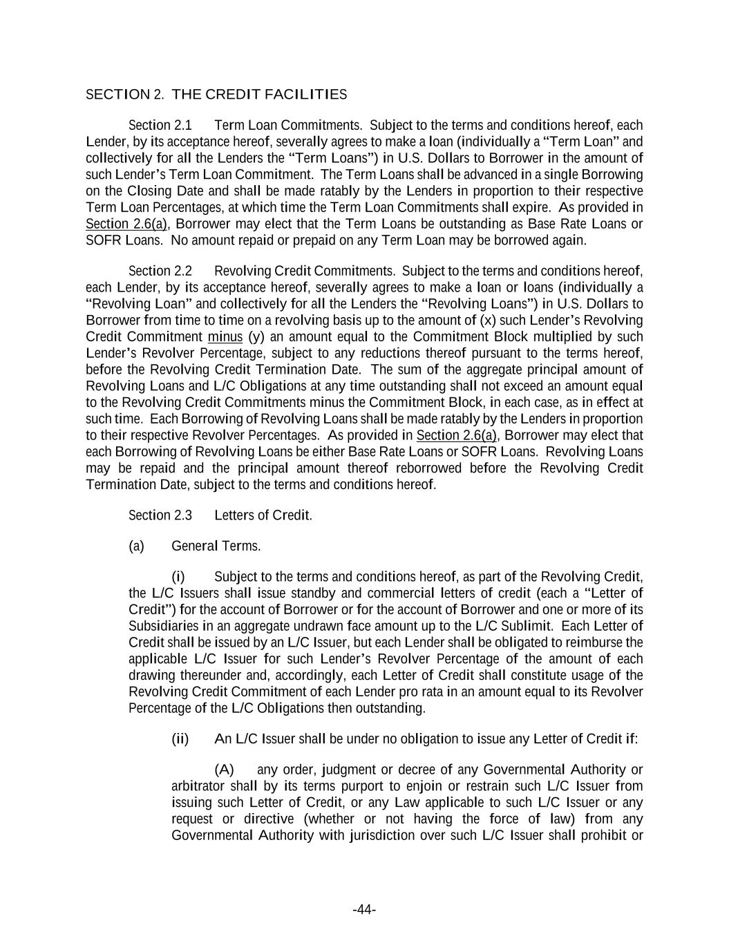 -44- SECTION 2. THE CREDIT FACILITIES Section 2.1 Term Loan Commitments. Subject to the terms and conditions hereof, each Lender, by its acceptance hereof, severally agrees to make a loan (individually a “Term Loan” and collectively for all the Lenders the “Term Loans”) in U.S. Dollars to Borrower in the amount of such Lender’s Term Loan Commitment. The Term Loans shall be advanced in a single Borrowing on the Closing Date and shall be made ratably by the Lenders in proportion to their respective Term Loan Percentages, at which time the Term Loan Commitments shall expire. As provided in Section 2.6(a), Borrower may elect that the Term Loans be outstanding as Base Rate Loans or SOFR Loans. No amount repaid or prepaid on any Term Loan may be borrowed again. Section 2.2 Revolving Credit Commitments. Subject to the terms and conditions hereof, each Lender, by its acceptance hereof, severally agrees to make a loan or loans (individually a “Revolving Loan” and collectively for all the Lenders the “Revolving Loans”) in U.S. Dollars to Borrower from time to time on a revolving basis up to the amount of (x) such Lender’s Revolving Credit Commitment minus (y) an amount equal to the Commitment Block multiplied by such Lender’s Revolver Percentage, subject to any reductions thereof pursuant to the terms hereof, before the Revolving Credit Termination Date. The sum of the aggregate principal amount of Revolving Loans and L/C Obligations at any time outstanding shall not exceed an amount equal to the Revolving Credit Commitments minus the Commitment Block, in each case, as in effect at such time. Each Borrowing of Revolving Loans shall be made ratably by the Lenders in proportion to their respective Revolver Percentages. As provided in Section 2.6(a), Borrower may elect that each Borrowing of Revolving Loans be either Base Rate Loans or SOFR Loans. Revolving Loans may be repaid and the principal amount thereof reborrowed before the Revolving Credit Termination Date, subject to the terms and conditions hereof. Section 2.3 Letters of Credit. (a) General Terms. (i) Subject to the terms and conditions hereof, as part of the Revolving Credit, the L/C Issuers shall issue standby and commercial letters of credit (each a “Letter of Credit”) for the account of Borrower or for the account of Borrower and one or more of its Subsidiaries in an aggregate undrawn face amount up to the L/C Sublimit. Each Letter of Credit shall be issued by an L/C Issuer, but each Lender shall be obligated to reimburse the applicable L/C Issuer for such Lender’s Revolver Percentage of the amount of each drawing thereunder and, accordingly, each Letter of Credit shall constitute usage of the Revolving Credit Commitment of each Lender pro rata in an amount equal to its Revolver Percentage of the L/C Obligations then outstanding. (ii) An L/C Issuer shall be under no obligation to issue any Letter of Credit if: (A) any order, judgment or decree of any Governmental Authority or arbitrator shall by its terms purport to enjoin or restrain such L/C Issuer from issuing such Letter of Credit, or any Law applicable to such L/C Issuer or any request or directive (whether or not having the force of law) from any Governmental Authority with jurisdiction over such L/C Issuer shall prohibit or