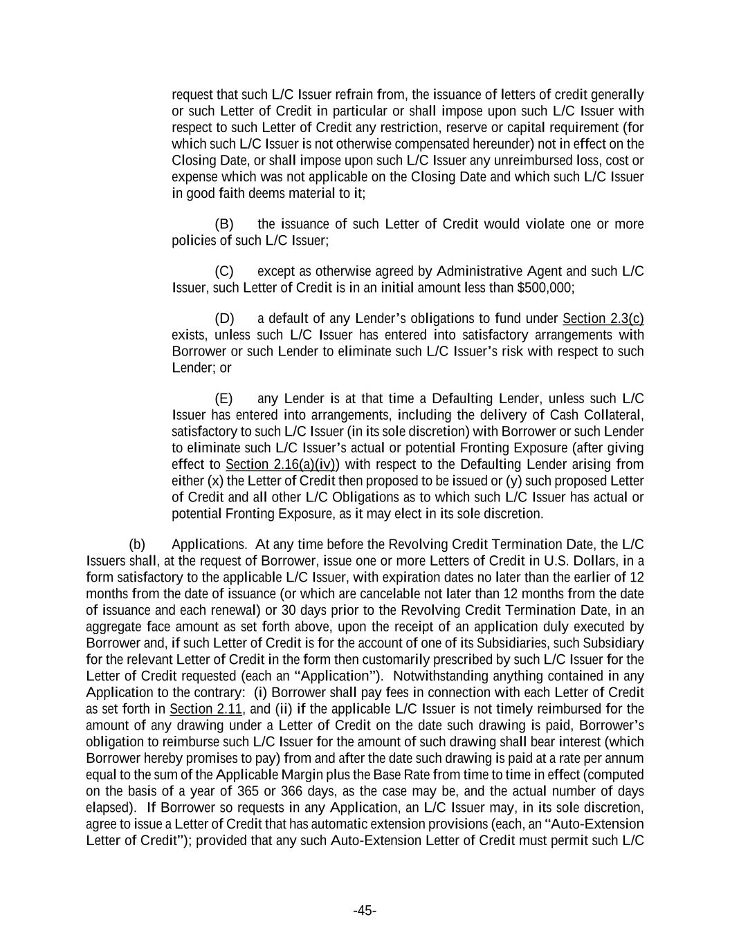 -45- request that such L/C Issuer refrain from, the issuance of letters of credit generally or such Letter of Credit in particular or shall impose upon such L/C Issuer with respect to such Letter of Credit any restriction, reserve or capital requirement (for which such L/C Issuer is not otherwise compensated hereunder) not in effect on the Closing Date, or shall impose upon such L/C Issuer any unreimbursed loss, cost or expense which was not applicable on the Closing Date and which such L/C Issuer in good faith deems material to it; (B) the issuance of such Letter of Credit would violate one or more policies of such L/C Issuer; (C) except as otherwise agreed by Administrative Agent and such L/C Issuer, such Letter of Credit is in an initial amount less than $500,000; (D) a default of any Lender’s obligations to fund under Section 2.3(c) exists, unless such L/C Issuer has entered into satisfactory arrangements with Borrower or such Lender to eliminate such L/C Issuer’s risk with respect to such Lender; or (E) any Lender is at that time a Defaulting Lender, unless such L/C Issuer has entered into arrangements, including the delivery of Cash Collateral, satisfactory to such L/C Issuer (in its sole discretion) with Borrower or such Lender to eliminate such L/C Issuer’s actual or potential Fronting Exposure (after giving effect to Section 2.16(a)(iv)) with respect to the Defaulting Lender arising from either (x) the Letter of Credit then proposed to be issued or (y) such proposed Letter of Credit and all other L/C Obligations as to which such L/C Issuer has actual or potential Fronting Exposure, as it may elect in its sole discretion. (b) Applications. At any time before the Revolving Credit Termination Date, the L/C Issuers shall, at the request of Borrower, issue one or more Letters of Credit in U.S. Dollars, in a form satisfactory to the applicable L/C Issuer, with expiration dates no later than the earlier of 12 months from the date of issuance (or which are cancelable not later than 12 months from the date of issuance and each renewal) or 30 days prior to the Revolving Credit Termination Date, in an aggregate face amount as set forth above, upon the receipt of an application duly executed by Borrower and, if such Letter of Credit is for the account of one of its Subsidiaries, such Subsidiary for the relevant Letter of Credit in the form then customarily prescribed by such L/C Issuer for the Letter of Credit requested (each an “Application”). Notwithstanding anything contained in any Application to the contrary: (i) Borrower shall pay fees in connection with each Letter of Credit as set forth in Section 2.11, and (ii) if the applicable L/C Issuer is not timely reimbursed for the amount of any drawing under a Letter of Credit on the date such drawing is paid, Borrower’s obligation to reimburse such L/C Issuer for the amount of such drawing shall bear interest (which Borrower hereby promises to pay) from and after the date such drawing is paid at a rate per annum equal to the sum of the Applicable Margin plus the Base Rate from time to time in effect (computed on the basis of a year of 365 or 366 days, as the case may be, and the actual number of days elapsed). If Borrower so requests in any Application, an L/C Issuer may, in its sole discretion, agree to issue a Letter of Credit that has automatic extension provisions (each, an “Auto-Extension Letter of Credit”); provided that any such Auto-Extension Letter of Credit must permit such L/C