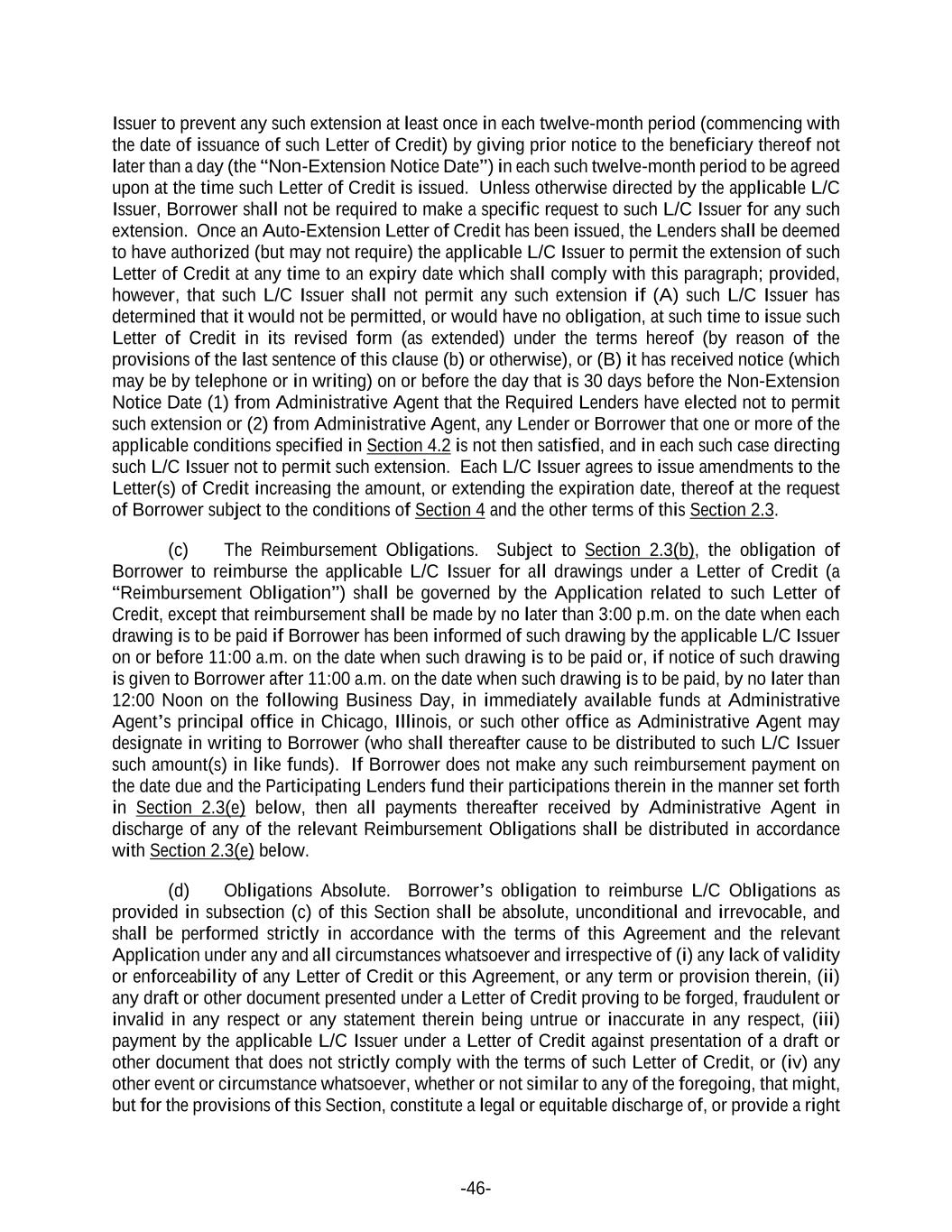 -46- Issuer to prevent any such extension at least once in each twelve-month period (commencing with the date of issuance of such Letter of Credit) by giving prior notice to the beneficiary thereof not later than a day (the “Non-Extension Notice Date”) in each such twelve-month period to be agreed upon at the time such Letter of Credit is issued. Unless otherwise directed by the applicable L/C Issuer, Borrower shall not be required to make a specific request to such L/C Issuer for any such extension. Once an Auto-Extension Letter of Credit has been issued, the Lenders shall be deemed to have authorized (but may not require) the applicable L/C Issuer to permit the extension of such Letter of Credit at any time to an expiry date which shall comply with this paragraph; provided, however, that such L/C Issuer shall not permit any such extension if (A) such L/C Issuer has determined that it would not be permitted, or would have no obligation, at such time to issue such Letter of Credit in its revised form (as extended) under the terms hereof (by reason of the provisions of the last sentence of this clause (b) or otherwise), or (B) it has received notice (which may be by telephone or in writing) on or before the day that is 30 days before the Non-Extension Notice Date (1) from Administrative Agent that the Required Lenders have elected not to permit such extension or (2) from Administrative Agent, any Lender or Borrower that one or more of the applicable conditions specified in Section 4.2 is not then satisfied, and in each such case directing such L/C Issuer not to permit such extension. Each L/C Issuer agrees to issue amendments to the Letter(s) of Credit increasing the amount, or extending the expiration date, thereof at the request of Borrower subject to the conditions of Section 4 and the other terms of this Section 2.3. (c) The Reimbursement Obligations. Subject to Section 2.3(b), the obligation of Borrower to reimburse the applicable L/C Issuer for all drawings under a Letter of Credit (a “Reimbursement Obligation”) shall be governed by the Application related to such Letter of Credit, except that reimbursement shall be made by no later than 3:00 p.m. on the date when each drawing is to be paid if Borrower has been informed of such drawing by the applicable L/C Issuer on or before 11:00 a.m. on the date when such drawing is to be paid or, if notice of such drawing is given to Borrower after 11:00 a.m. on the date when such drawing is to be paid, by no later than 12:00 Noon on the following Business Day, in immediately available funds at Administrative Agent’s principal office in Chicago, Illinois, or such other office as Administrative Agent may designate in writing to Borrower (who shall thereafter cause to be distributed to such L/C Issuer such amount(s) in like funds). If Borrower does not make any such reimbursement payment on the date due and the Participating Lenders fund their participations therein in the manner set forth in Section 2.3(e) below, then all payments thereafter received by Administrative Agent in discharge of any of the relevant Reimbursement Obligations shall be distributed in accordance with Section 2.3(e) below. (d) Obligations Absolute. Borrower’s obligation to reimburse L/C Obligations as provided in subsection (c) of this Section shall be absolute, unconditional and irrevocable, and shall be performed strictly in accordance with the terms of this Agreement and the relevant Application under any and all circumstances whatsoever and irrespective of (i) any lack of validity or enforceability of any Letter of Credit or this Agreement, or any term or provision therein, (ii) any draft or other document presented under a Letter of Credit proving to be forged, fraudulent or invalid in any respect or any statement therein being untrue or inaccurate in any respect, (iii) payment by the applicable L/C Issuer under a Letter of Credit against presentation of a draft or other document that does not strictly comply with the terms of such Letter of Credit, or (iv) any other event or circumstance whatsoever, whether or not similar to any of the foregoing, that might, but for the provisions of this Section, constitute a legal or equitable discharge of, or provide a right