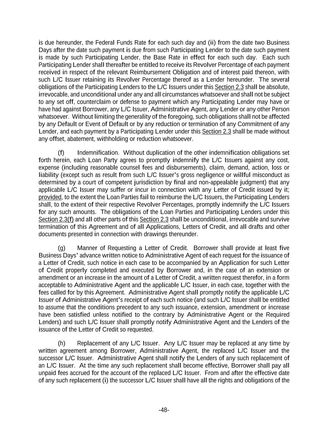 -48- is due hereunder, the Federal Funds Rate for each such day and (ii) from the date two Business Days after the date such payment is due from such Participating Lender to the date such payment is made by such Participating Lender, the Base Rate in effect for each such day. Each such Participating Lender shall thereafter be entitled to receive its Revolver Percentage of each payment received in respect of the relevant Reimbursement Obligation and of interest paid thereon, with such L/C Issuer retaining its Revolver Percentage thereof as a Lender hereunder. The several obligations of the Participating Lenders to the L/C Issuers under this Section 2.3 shall be absolute, irrevocable, and unconditional under any and all circumstances whatsoever and shall not be subject to any set off, counterclaim or defense to payment which any Participating Lender may have or have had against Borrower, any L/C Issuer, Administrative Agent, any Lender or any other Person whatsoever. Without limiting the generality of the foregoing, such obligations shall not be affected by any Default or Event of Default or by any reduction or termination of any Commitment of any Lender, and each payment by a Participating Lender under this Section 2.3 shall be made without any offset, abatement, withholding or reduction whatsoever. (f) Indemnification. Without duplication of the other indemnification obligations set forth herein, each Loan Party agrees to promptly indemnify the L/C Issuers against any cost, expense (including reasonable counsel fees and disbursements), claim, demand, action, loss or liability (except such as result from such L/C Issuer’s gross negligence or willful misconduct as determined by a court of competent jurisdiction by final and non-appealable judgment) that any applicable L/C Issuer may suffer or incur in connection with any Letter of Credit issued by it; provided, to the extent the Loan Parties fail to reimburse the L/C Issuers, the Participating Lenders shall, to the extent of their respective Revolver Percentages, promptly indemnify the L/C Issuers for any such amounts. The obligations of the Loan Parties and Participating Lenders under this Section 2.3(f) and all other parts of this Section 2.3 shall be unconditional, irrevocable and survive termination of this Agreement and of all Applications, Letters of Credit, and all drafts and other documents presented in connection with drawings thereunder. (g) Manner of Requesting a Letter of Credit. Borrower shall provide at least five Business Days’ advance written notice to Administrative Agent of each request for the issuance of a Letter of Credit, such notice in each case to be accompanied by an Application for such Letter of Credit properly completed and executed by Borrower and, in the case of an extension or amendment or an increase in the amount of a Letter of Credit, a written request therefor, in a form acceptable to Administrative Agent and the applicable L/C Issuer, in each case, together with the fees called for by this Agreement. Administrative Agent shall promptly notify the applicable L/C Issuer of Administrative Agent’s receipt of each such notice (and such L/C Issuer shall be entitled to assume that the conditions precedent to any such issuance, extension, amendment or increase have been satisfied unless notified to the contrary by Administrative Agent or the Required Lenders) and such L/C Issuer shall promptly notify Administrative Agent and the Lenders of the issuance of the Letter of Credit so requested. (h) Replacement of any L/C Issuer. Any L/C Issuer may be replaced at any time by written agreement among Borrower, Administrative Agent, the replaced L/C Issuer and the successor L/C Issuer. Administrative Agent shall notify the Lenders of any such replacement of an L/C Issuer. At the time any such replacement shall become effective, Borrower shall pay all unpaid fees accrued for the account of the replaced L/C Issuer. From and after the effective date of any such replacement (i) the successor L/C Issuer shall have all the rights and obligations of the