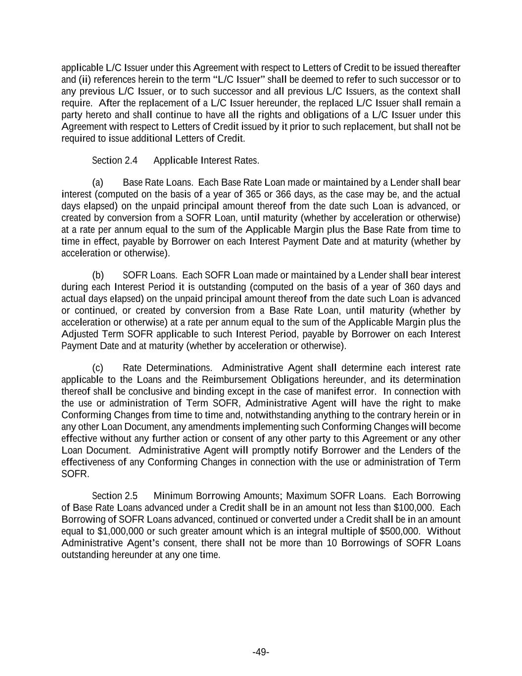 -49- applicable L/C Issuer under this Agreement with respect to Letters of Credit to be issued thereafter and (ii) references herein to the term “L/C Issuer” shall be deemed to refer to such successor or to any previous L/C Issuer, or to such successor and all previous L/C Issuers, as the context shall require. After the replacement of a L/C Issuer hereunder, the replaced L/C Issuer shall remain a party hereto and shall continue to have all the rights and obligations of a L/C Issuer under this Agreement with respect to Letters of Credit issued by it prior to such replacement, but shall not be required to issue additional Letters of Credit. Section 2.4 Applicable Interest Rates. (a) Base Rate Loans. Each Base Rate Loan made or maintained by a Lender shall bear interest (computed on the basis of a year of 365 or 366 days, as the case may be, and the actual days elapsed) on the unpaid principal amount thereof from the date such Loan is advanced, or created by conversion from a SOFR Loan, until maturity (whether by acceleration or otherwise) at a rate per annum equal to the sum of the Applicable Margin plus the Base Rate from time to time in effect, payable by Borrower on each Interest Payment Date and at maturity (whether by acceleration or otherwise). (b) SOFR Loans. Each SOFR Loan made or maintained by a Lender shall bear interest during each Interest Period it is outstanding (computed on the basis of a year of 360 days and actual days elapsed) on the unpaid principal amount thereof from the date such Loan is advanced or continued, or created by conversion from a Base Rate Loan, until maturity (whether by acceleration or otherwise) at a rate per annum equal to the sum of the Applicable Margin plus the Adjusted Term SOFR applicable to such Interest Period, payable by Borrower on each Interest Payment Date and at maturity (whether by acceleration or otherwise). (c) Rate Determinations. Administrative Agent shall determine each interest rate applicable to the Loans and the Reimbursement Obligations hereunder, and its determination thereof shall be conclusive and binding except in the case of manifest error. In connection with the use or administration of Term SOFR, Administrative Agent will have the right to make Conforming Changes from time to time and, notwithstanding anything to the contrary herein or in any other Loan Document, any amendments implementing such Conforming Changes will become effective without any further action or consent of any other party to this Agreement or any other Loan Document. Administrative Agent will promptly notify Borrower and the Lenders of the effectiveness of any Conforming Changes in connection with the use or administration of Term SOFR. Section 2.5 Minimum Borrowing Amounts; Maximum SOFR Loans. Each Borrowing of Base Rate Loans advanced under a Credit shall be in an amount not less than $100,000. Each Borrowing of SOFR Loans advanced, continued or converted under a Credit shall be in an amount equal to $1,000,000 or such greater amount which is an integral multiple of $500,000. Without Administrative Agent’s consent, there shall not be more than 10 Borrowings of SOFR Loans outstanding hereunder at any one time.