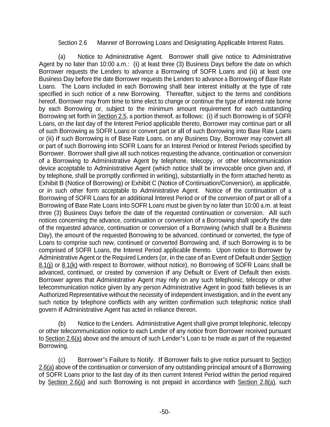 -50- Section 2.6 Manner of Borrowing Loans and Designating Applicable Interest Rates. (a) Notice to Administrative Agent. Borrower shall give notice to Administrative Agent by no later than 10:00 a.m.: (i) at least three (3) Business Days before the date on which Borrower requests the Lenders to advance a Borrowing of SOFR Loans and (ii) at least one Business Day before the date Borrower requests the Lenders to advance a Borrowing of Base Rate Loans. The Loans included in each Borrowing shall bear interest initially at the type of rate specified in such notice of a new Borrowing. Thereafter, subject to the terms and conditions hereof, Borrower may from time to time elect to change or continue the type of interest rate borne by each Borrowing or, subject to the minimum amount requirement for each outstanding Borrowing set forth in Section 2.5, a portion thereof, as follows: (i) if such Borrowing is of SOFR Loans, on the last day of the Interest Period applicable thereto, Borrower may continue part or all of such Borrowing as SOFR Loans or convert part or all of such Borrowing into Base Rate Loans or (ii) if such Borrowing is of Base Rate Loans, on any Business Day, Borrower may convert all or part of such Borrowing into SOFR Loans for an Interest Period or Interest Periods specified by Borrower. Borrower shall give all such notices requesting the advance, continuation or conversion of a Borrowing to Administrative Agent by telephone, telecopy, or other telecommunication device acceptable to Administrative Agent (which notice shall be irrevocable once given and, if by telephone, shall be promptly confirmed in writing), substantially in the form attached hereto as Exhibit B (Notice of Borrowing) or Exhibit C (Notice of Continuation/Conversion), as applicable, or in such other form acceptable to Administrative Agent. Notice of the continuation of a Borrowing of SOFR Loans for an additional Interest Period or of the conversion of part or all of a Borrowing of Base Rate Loans into SOFR Loans must be given by no later than 10:00 a.m. at least three (3) Business Days before the date of the requested continuation or conversion. All such notices concerning the advance, continuation or conversion of a Borrowing shall specify the date of the requested advance, continuation or conversion of a Borrowing (which shall be a Business Day), the amount of the requested Borrowing to be advanced, continued or converted, the type of Loans to comprise such new, continued or converted Borrowing and, if such Borrowing is to be comprised of SOFR Loans, the Interest Period applicable thereto. Upon notice to Borrower by Administrative Agent or the Required Lenders (or, in the case of an Event of Default under Section 8.1(j) or 8.1(k) with respect to Borrower, without notice), no Borrowing of SOFR Loans shall be advanced, continued, or created by conversion if any Default or Event of Default then exists. Borrower agrees that Administrative Agent may rely on any such telephonic, telecopy or other telecommunication notice given by any person Administrative Agent in good faith believes is an Authorized Representative without the necessity of independent investigation, and in the event any such notice by telephone conflicts with any written confirmation such telephonic notice shall govern if Administrative Agent has acted in reliance thereon. (b) Notice to the Lenders. Administrative Agent shall give prompt telephonic, telecopy or other telecommunication notice to each Lender of any notice from Borrower received pursuant to Section 2.6(a) above and the amount of such Lender’s Loan to be made as part of the requested Borrowing. (c) Borrower’s Failure to Notify. If Borrower fails to give notice pursuant to Section 2.6(a) above of the continuation or conversion of any outstanding principal amount of a Borrowing of SOFR Loans prior to the last day of its then current Interest Period within the period required by Section 2.6(a) and such Borrowing is not prepaid in accordance with Section 2.8(a), such