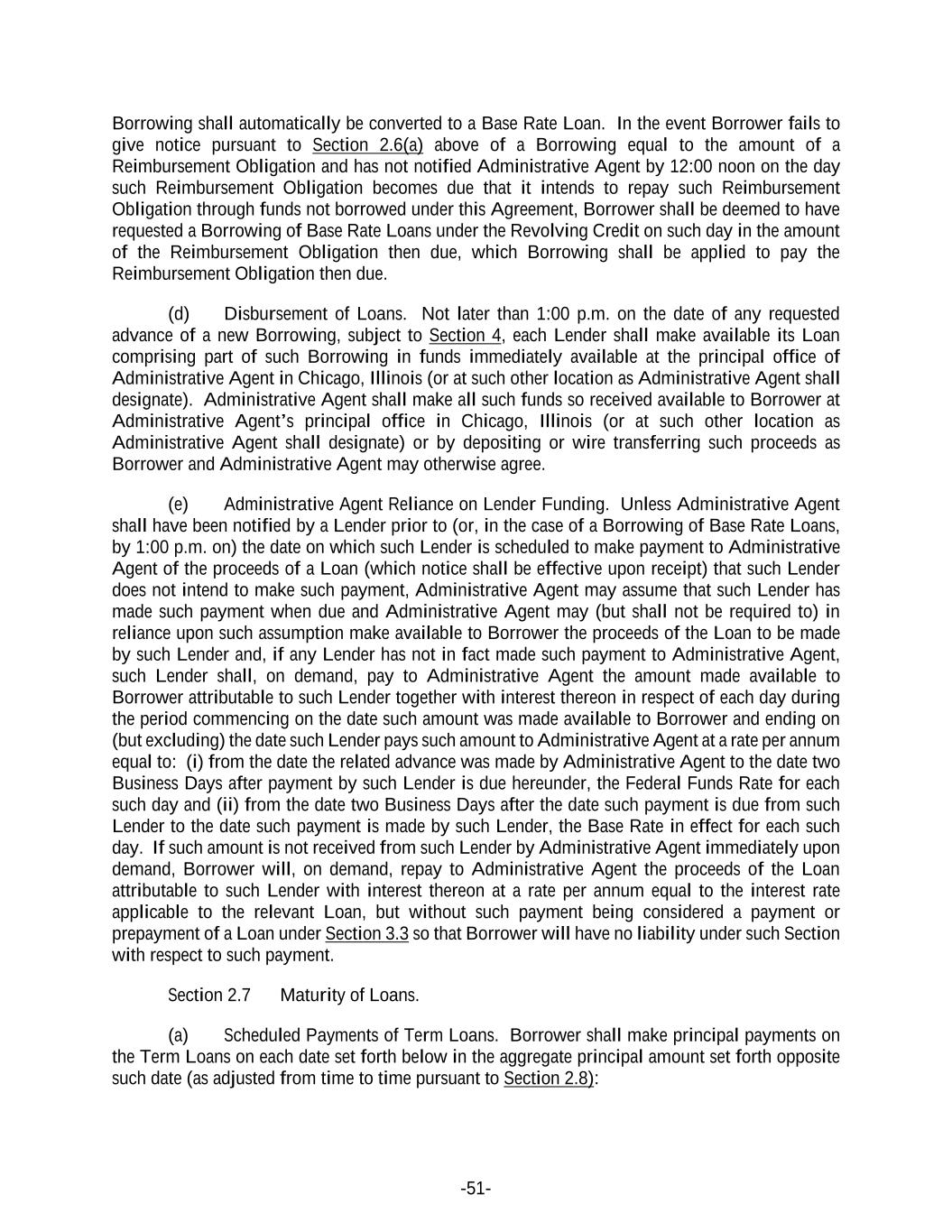 -51- Borrowing shall automatically be converted to a Base Rate Loan. In the event Borrower fails to give notice pursuant to Section 2.6(a) above of a Borrowing equal to the amount of a Reimbursement Obligation and has not notified Administrative Agent by 12:00 noon on the day such Reimbursement Obligation becomes due that it intends to repay such Reimbursement Obligation through funds not borrowed under this Agreement, Borrower shall be deemed to have requested a Borrowing of Base Rate Loans under the Revolving Credit on such day in the amount of the Reimbursement Obligation then due, which Borrowing shall be applied to pay the Reimbursement Obligation then due. (d) Disbursement of Loans. Not later than 1:00 p.m. on the date of any requested advance of a new Borrowing, subject to Section 4, each Lender shall make available its Loan comprising part of such Borrowing in funds immediately available at the principal office of Administrative Agent in Chicago, Illinois (or at such other location as Administrative Agent shall designate). Administrative Agent shall make all such funds so received available to Borrower at Administrative Agent’s principal office in Chicago, Illinois (or at such other location as Administrative Agent shall designate) or by depositing or wire transferring such proceeds as Borrower and Administrative Agent may otherwise agree. (e) Administrative Agent Reliance on Lender Funding. Unless Administrative Agent shall have been notified by a Lender prior to (or, in the case of a Borrowing of Base Rate Loans, by 1:00 p.m. on) the date on which such Lender is scheduled to make payment to Administrative Agent of the proceeds of a Loan (which notice shall be effective upon receipt) that such Lender does not intend to make such payment, Administrative Agent may assume that such Lender has made such payment when due and Administrative Agent may (but shall not be required to) in reliance upon such assumption make available to Borrower the proceeds of the Loan to be made by such Lender and, if any Lender has not in fact made such payment to Administrative Agent, such Lender shall, on demand, pay to Administrative Agent the amount made available to Borrower attributable to such Lender together with interest thereon in respect of each day during the period commencing on the date such amount was made available to Borrower and ending on (but excluding) the date such Lender pays such amount to Administrative Agent at a rate per annum equal to: (i) from the date the related advance was made by Administrative Agent to the date two Business Days after payment by such Lender is due hereunder, the Federal Funds Rate for each such day and (ii) from the date two Business Days after the date such payment is due from such Lender to the date such payment is made by such Lender, the Base Rate in effect for each such day. If such amount is not received from such Lender by Administrative Agent immediately upon demand, Borrower will, on demand, repay to Administrative Agent the proceeds of the Loan attributable to such Lender with interest thereon at a rate per annum equal to the interest rate applicable to the relevant Loan, but without such payment being considered a payment or prepayment of a Loan under Section 3.3 so that Borrower will have no liability under such Section with respect to such payment. Section 2.7 Maturity of Loans. (a) Scheduled Payments of Term Loans. Borrower shall make principal payments on the Term Loans on each date set forth below in the aggregate principal amount set forth opposite such date (as adjusted from time to time pursuant to Section 2.8):
