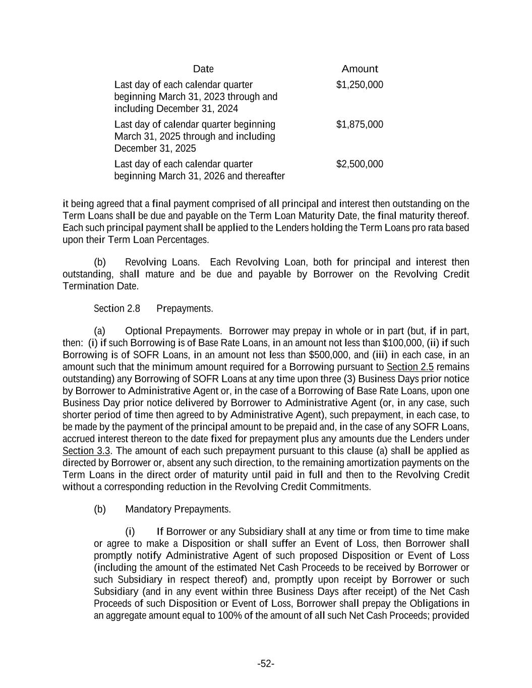 -52- Date Amount Last day of each calendar quarter beginning March 31, 2023 through and including December 31, 2024 $1,250,000 Last day of calendar quarter beginning March 31, 2025 through and including December 31, 2025 $1,875,000 Last day of each calendar quarter beginning March 31, 2026 and thereafter $2,500,000 it being agreed that a final payment comprised of all principal and interest then outstanding on the Term Loans shall be due and payable on the Term Loan Maturity Date, the final maturity thereof. Each such principal payment shall be applied to the Lenders holding the Term Loans pro rata based upon their Term Loan Percentages. (b) Revolving Loans. Each Revolving Loan, both for principal and interest then outstanding, shall mature and be due and payable by Borrower on the Revolving Credit Termination Date. Section 2.8 Prepayments. (a) Optional Prepayments. Borrower may prepay in whole or in part (but, if in part, then: (i) if such Borrowing is of Base Rate Loans, in an amount not less than $100,000, (ii) if such Borrowing is of SOFR Loans, in an amount not less than $500,000, and (iii) in each case, in an amount such that the minimum amount required for a Borrowing pursuant to Section 2.5 remains outstanding) any Borrowing of SOFR Loans at any time upon three (3) Business Days prior notice by Borrower to Administrative Agent or, in the case of a Borrowing of Base Rate Loans, upon one Business Day prior notice delivered by Borrower to Administrative Agent (or, in any case, such shorter period of time then agreed to by Administrative Agent), such prepayment, in each case, to be made by the payment of the principal amount to be prepaid and, in the case of any SOFR Loans, accrued interest thereon to the date fixed for prepayment plus any amounts due the Lenders under Section 3.3. The amount of each such prepayment pursuant to this clause (a) shall be applied as directed by Borrower or, absent any such direction, to the remaining amortization payments on the Term Loans in the direct order of maturity until paid in full and then to the Revolving Credit without a corresponding reduction in the Revolving Credit Commitments. (b) Mandatory Prepayments. (i) If Borrower or any Subsidiary shall at any time or from time to time make or agree to make a Disposition or shall suffer an Event of Loss, then Borrower shall promptly notify Administrative Agent of such proposed Disposition or Event of Loss (including the amount of the estimated Net Cash Proceeds to be received by Borrower or such Subsidiary in respect thereof) and, promptly upon receipt by Borrower or such Subsidiary (and in any event within three Business Days after receipt) of the Net Cash Proceeds of such Disposition or Event of Loss, Borrower shall prepay the Obligations in an aggregate amount equal to 100% of the amount of all such Net Cash Proceeds; provided