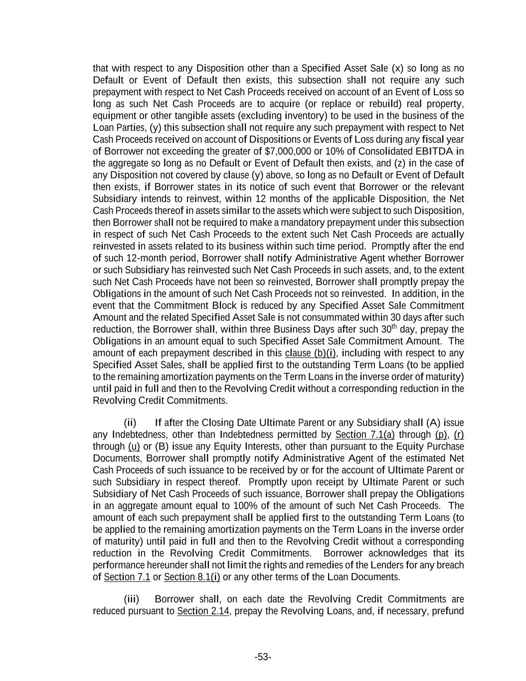 -53- that with respect to any Disposition other than a Specified Asset Sale (x) so long as no Default or Event of Default then exists, this subsection shall not require any such prepayment with respect to Net Cash Proceeds received on account of an Event of Loss so long as such Net Cash Proceeds are to acquire (or replace or rebuild) real property, equipment or other tangible assets (excluding inventory) to be used in the business of the Loan Parties, (y) this subsection shall not require any such prepayment with respect to Net Cash Proceeds received on account of Dispositions or Events of Loss during any fiscal year of Borrower not exceeding the greater of $7,000,000 or 10% of Consolidated EBITDA in the aggregate so long as no Default or Event of Default then exists, and (z) in the case of any Disposition not covered by clause (y) above, so long as no Default or Event of Default then exists, if Borrower states in its notice of such event that Borrower or the relevant Subsidiary intends to reinvest, within 12 months of the applicable Disposition, the Net Cash Proceeds thereof in assets similar to the assets which were subject to such Disposition, then Borrower shall not be required to make a mandatory prepayment under this subsection in respect of such Net Cash Proceeds to the extent such Net Cash Proceeds are actually reinvested in assets related to its business within such time period. Promptly after the end of such 12-month period, Borrower shall notify Administrative Agent whether Borrower or such Subsidiary has reinvested such Net Cash Proceeds in such assets, and, to the extent such Net Cash Proceeds have not been so reinvested, Borrower shall promptly prepay the Obligations in the amount of such Net Cash Proceeds not so reinvested. In addition, in the event that the Commitment Block is reduced by any Specified Asset Sale Commitment Amount and the related Specified Asset Sale is not consummated within 30 days after such reduction, the Borrower shall, within three Business Days after such 30th day, prepay the Obligations in an amount equal to such Specified Asset Sale Commitment Amount. The amount of each prepayment described in this clause (b)(i), including with respect to any Specified Asset Sales, shall be applied first to the outstanding Term Loans (to be applied to the remaining amortization payments on the Term Loans in the inverse order of maturity) until paid in full and then to the Revolving Credit without a corresponding reduction in the Revolving Credit Commitments. (ii) If after the Closing Date Ultimate Parent or any Subsidiary shall (A) issue any Indebtedness, other than Indebtedness permitted by Section 7.1(a) through (p), (r) through (u) or (B) issue any Equity Interests, other than pursuant to the Equity Purchase Documents, Borrower shall promptly notify Administrative Agent of the estimated Net Cash Proceeds of such issuance to be received by or for the account of Ultimate Parent or such Subsidiary in respect thereof. Promptly upon receipt by Ultimate Parent or such Subsidiary of Net Cash Proceeds of such issuance, Borrower shall prepay the Obligations in an aggregate amount equal to 100% of the amount of such Net Cash Proceeds. The amount of each such prepayment shall be applied first to the outstanding Term Loans (to be applied to the remaining amortization payments on the Term Loans in the inverse order of maturity) until paid in full and then to the Revolving Credit without a corresponding reduction in the Revolving Credit Commitments. Borrower acknowledges that its performance hereunder shall not limit the rights and remedies of the Lenders for any breach of Section 7.1 or Section 8.1(i) or any other terms of the Loan Documents. (iii) Borrower shall, on each date the Revolving Credit Commitments are reduced pursuant to Section 2.14, prepay the Revolving Loans, and, if necessary, prefund