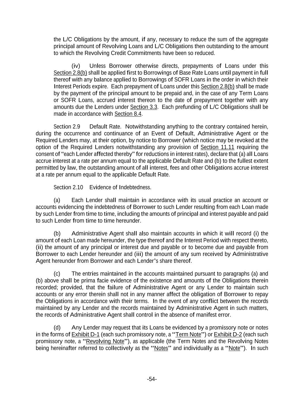 -54- the L/C Obligations by the amount, if any, necessary to reduce the sum of the aggregate principal amount of Revolving Loans and L/C Obligations then outstanding to the amount to which the Revolving Credit Commitments have been so reduced. (iv) Unless Borrower otherwise directs, prepayments of Loans under this Section 2.8(b) shall be applied first to Borrowings of Base Rate Loans until payment in full thereof with any balance applied to Borrowings of SOFR Loans in the order in which their Interest Periods expire. Each prepayment of Loans under this Section 2.8(b) shall be made by the payment of the principal amount to be prepaid and, in the case of any Term Loans or SOFR Loans, accrued interest thereon to the date of prepayment together with any amounts due the Lenders under Section 3.3. Each prefunding of L/C Obligations shall be made in accordance with Section 8.4. Section 2.9 Default Rate. Notwithstanding anything to the contrary contained herein, during the occurrence and continuance of an Event of Default, Administrative Agent or the Required Lenders may, at their option, by notice to Borrower (which notice may be revoked at the option of the Required Lenders notwithstanding any provision of Section 11.11 requiring the consent of “each Lender affected thereby” for reductions in interest rates), declare that (a) all Loans accrue interest at a rate per annum equal to the applicable Default Rate and (b) to the fullest extent permitted by law, the outstanding amount of all interest, fees and other Obligations accrue interest at a rate per annum equal to the applicable Default Rate. Section 2.10 Evidence of Indebtedness. (a) Each Lender shall maintain in accordance with its usual practice an account or accounts evidencing the indebtedness of Borrower to such Lender resulting from each Loan made by such Lender from time to time, including the amounts of principal and interest payable and paid to such Lender from time to time hereunder. (b) Administrative Agent shall also maintain accounts in which it will record (i) the amount of each Loan made hereunder, the type thereof and the Interest Period with respect thereto, (ii) the amount of any principal or interest due and payable or to become due and payable from Borrower to each Lender hereunder and (iii) the amount of any sum received by Administrative Agent hereunder from Borrower and each Lender’s share thereof. (c) The entries maintained in the accounts maintained pursuant to paragraphs (a) and (b) above shall be prima facie evidence of the existence and amounts of the Obligations therein recorded; provided, that the failure of Administrative Agent or any Lender to maintain such accounts or any error therein shall not in any manner affect the obligation of Borrower to repay the Obligations in accordance with their terms. In the event of any conflict between the records maintained by any Lender and the records maintained by Administrative Agent in such matters, the records of Administrative Agent shall control in the absence of manifest error. (d) Any Lender may request that its Loans be evidenced by a promissory note or notes in the forms of Exhibit D-1 (each such promissory note, a “Term Note”) or Exhibit D-2 (each such promissory note, a “Revolving Note”), as applicable (the Term Notes and the Revolving Notes being hereinafter referred to collectively as the “Notes” and individually as a “Note”). In such