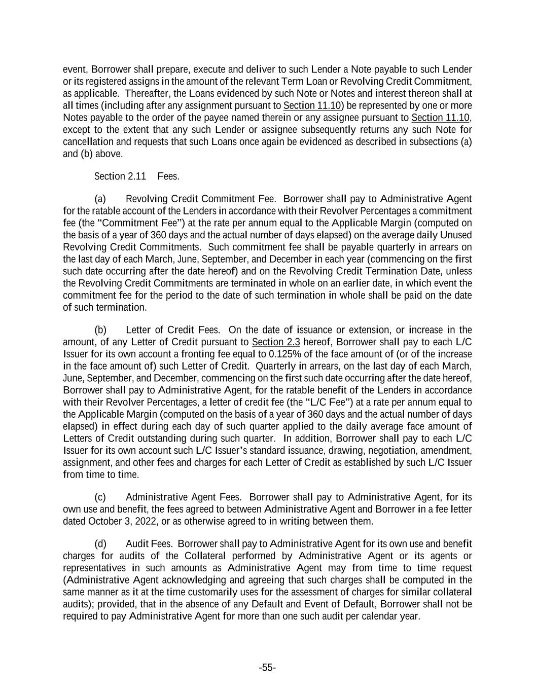 -55- event, Borrower shall prepare, execute and deliver to such Lender a Note payable to such Lender or its registered assigns in the amount of the relevant Term Loan or Revolving Credit Commitment, as applicable. Thereafter, the Loans evidenced by such Note or Notes and interest thereon shall at all times (including after any assignment pursuant to Section 11.10) be represented by one or more Notes payable to the order of the payee named therein or any assignee pursuant to Section 11.10, except to the extent that any such Lender or assignee subsequently returns any such Note for cancellation and requests that such Loans once again be evidenced as described in subsections (a) and (b) above. Section 2.11 Fees. (a) Revolving Credit Commitment Fee. Borrower shall pay to Administrative Agent for the ratable account of the Lenders in accordance with their Revolver Percentages a commitment fee (the “Commitment Fee”) at the rate per annum equal to the Applicable Margin (computed on the basis of a year of 360 days and the actual number of days elapsed) on the average daily Unused Revolving Credit Commitments. Such commitment fee shall be payable quarterly in arrears on the last day of each March, June, September, and December in each year (commencing on the first such date occurring after the date hereof) and on the Revolving Credit Termination Date, unless the Revolving Credit Commitments are terminated in whole on an earlier date, in which event the commitment fee for the period to the date of such termination in whole shall be paid on the date of such termination. (b) Letter of Credit Fees. On the date of issuance or extension, or increase in the amount, of any Letter of Credit pursuant to Section 2.3 hereof, Borrower shall pay to each L/C Issuer for its own account a fronting fee equal to 0.125% of the face amount of (or of the increase in the face amount of) such Letter of Credit. Quarterly in arrears, on the last day of each March, June, September, and December, commencing on the first such date occurring after the date hereof, Borrower shall pay to Administrative Agent, for the ratable benefit of the Lenders in accordance with their Revolver Percentages, a letter of credit fee (the “L/C Fee”) at a rate per annum equal to the Applicable Margin (computed on the basis of a year of 360 days and the actual number of days elapsed) in effect during each day of such quarter applied to the daily average face amount of Letters of Credit outstanding during such quarter. In addition, Borrower shall pay to each L/C Issuer for its own account such L/C Issuer’s standard issuance, drawing, negotiation, amendment, assignment, and other fees and charges for each Letter of Credit as established by such L/C Issuer from time to time. (c) Administrative Agent Fees. Borrower shall pay to Administrative Agent, for its own use and benefit, the fees agreed to between Administrative Agent and Borrower in a fee letter dated October 3, 2022, or as otherwise agreed to in writing between them. (d) Audit Fees. Borrower shall pay to Administrative Agent for its own use and benefit charges for audits of the Collateral performed by Administrative Agent or its agents or representatives in such amounts as Administrative Agent may from time to time request (Administrative Agent acknowledging and agreeing that such charges shall be computed in the same manner as it at the time customarily uses for the assessment of charges for similar collateral audits); provided, that in the absence of any Default and Event of Default, Borrower shall not be required to pay Administrative Agent for more than one such audit per calendar year.