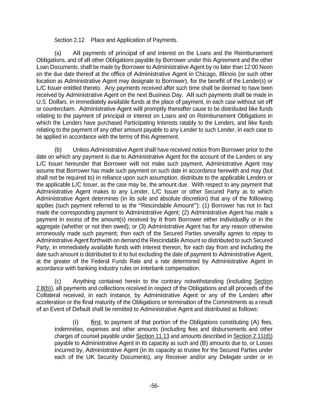 -56- Section 2.12 Place and Application of Payments. (a) All payments of principal of and interest on the Loans and the Reimbursement Obligations, and of all other Obligations payable by Borrower under this Agreement and the other Loan Documents, shall be made by Borrower to Administrative Agent by no later than 12:00 Noon on the due date thereof at the office of Administrative Agent in Chicago, Illinois (or such other location as Administrative Agent may designate to Borrower), for the benefit of the Lender(s) or L/C Issuer entitled thereto. Any payments received after such time shall be deemed to have been received by Administrative Agent on the next Business Day. All such payments shall be made in U.S. Dollars, in immediately available funds at the place of payment, in each case without set off or counterclaim. Administrative Agent will promptly thereafter cause to be distributed like funds relating to the payment of principal or interest on Loans and on Reimbursement Obligations in which the Lenders have purchased Participating Interests ratably to the Lenders, and like funds relating to the payment of any other amount payable to any Lender to such Lender, in each case to be applied in accordance with the terms of this Agreement. (b) Unless Administrative Agent shall have received notice from Borrower prior to the date on which any payment is due to Administrative Agent for the account of the Lenders or any L/C Issuer hereunder that Borrower will not make such payment, Administrative Agent may assume that Borrower has made such payment on such date in accordance herewith and may (but shall not be required to) in reliance upon such assumption, distribute to the applicable Lenders or the applicable L/C Issuer, as the case may be, the amount due. With respect to any payment that Administrative Agent makes to any Lender, L/C Issuer or other Secured Party as to which Administrative Agent determines (in its sole and absolute discretion) that any of the following applies (such payment referred to as the “Rescindable Amount”): (1) Borrower has not in fact made the corresponding payment to Administrative Agent; (2) Administrative Agent has made a payment in excess of the amount(s) received by it from Borrower either individually or in the aggregate (whether or not then owed); or (3) Administrative Agent has for any reason otherwise erroneously made such payment; then each of the Secured Parties severally agrees to repay to Administrative Agent forthwith on demand the Rescindable Amount so distributed to such Secured Party, in immediately available funds with interest thereon, for each day from and including the date such amount is distributed to it to but excluding the date of payment to Administrative Agent, at the greater of the Federal Funds Rate and a rate determined by Administrative Agent in accordance with banking industry rules on interbank compensation. (c) Anything contained herein to the contrary notwithstanding (including Section 2.8(b)), all payments and collections received in respect of the Obligations and all proceeds of the Collateral received, in each instance, by Administrative Agent or any of the Lenders after acceleration or the final maturity of the Obligations or termination of the Commitments as a result of an Event of Default shall be remitted to Administrative Agent and distributed as follows: (i) first, to payment of that portion of the Obligations constituting (A) fees, indemnities, expenses and other amounts (including fees and disbursements and other charges of counsel payable under Section 11.13 and amounts described in Section 2.11(d)) payable to Administrative Agent in its capacity as such and (B) amounts due to, or Losses incurred by, Administrative Agent (in its capacity as trustee for the Secured Parties under each of the UK Security Documents), any Receiver and/or any Delegate under or in