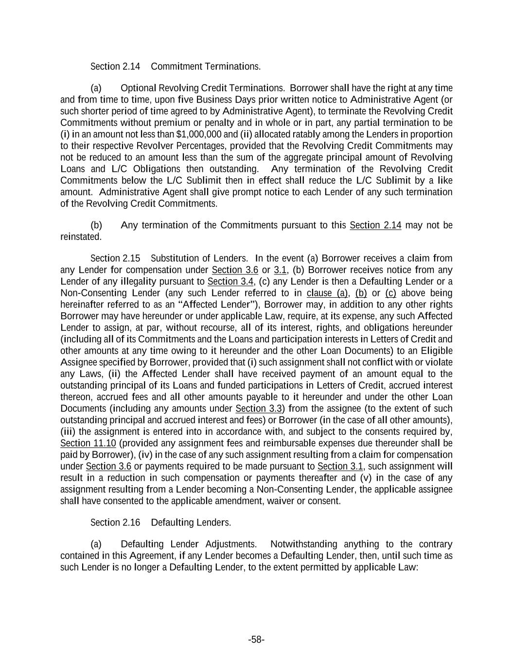 -58- Section 2.14 Commitment Terminations. (a) Optional Revolving Credit Terminations. Borrower shall have the right at any time and from time to time, upon five Business Days prior written notice to Administrative Agent (or such shorter period of time agreed to by Administrative Agent), to terminate the Revolving Credit Commitments without premium or penalty and in whole or in part, any partial termination to be (i) in an amount not less than $1,000,000 and (ii) allocated ratably among the Lenders in proportion to their respective Revolver Percentages, provided that the Revolving Credit Commitments may not be reduced to an amount less than the sum of the aggregate principal amount of Revolving Loans and L/C Obligations then outstanding. Any termination of the Revolving Credit Commitments below the L/C Sublimit then in effect shall reduce the L/C Sublimit by a like amount. Administrative Agent shall give prompt notice to each Lender of any such termination of the Revolving Credit Commitments. (b) Any termination of the Commitments pursuant to this Section 2.14 may not be reinstated. Section 2.15 Substitution of Lenders. In the event (a) Borrower receives a claim from any Lender for compensation under Section 3.6 or 3.1, (b) Borrower receives notice from any Lender of any illegality pursuant to Section 3.4, (c) any Lender is then a Defaulting Lender or a Non-Consenting Lender (any such Lender referred to in clause (a), (b) or (c) above being hereinafter referred to as an “Affected Lender”), Borrower may, in addition to any other rights Borrower may have hereunder or under applicable Law, require, at its expense, any such Affected Lender to assign, at par, without recourse, all of its interest, rights, and obligations hereunder (including all of its Commitments and the Loans and participation interests in Letters of Credit and other amounts at any time owing to it hereunder and the other Loan Documents) to an Eligible Assignee specified by Borrower, provided that (i) such assignment shall not conflict with or violate any Laws, (ii) the Affected Lender shall have received payment of an amount equal to the outstanding principal of its Loans and funded participations in Letters of Credit, accrued interest thereon, accrued fees and all other amounts payable to it hereunder and under the other Loan Documents (including any amounts under Section 3.3) from the assignee (to the extent of such outstanding principal and accrued interest and fees) or Borrower (in the case of all other amounts), (iii) the assignment is entered into in accordance with, and subject to the consents required by, Section 11.10 (provided any assignment fees and reimbursable expenses due thereunder shall be paid by Borrower), (iv) in the case of any such assignment resulting from a claim for compensation under Section 3.6 or payments required to be made pursuant to Section 3.1, such assignment will result in a reduction in such compensation or payments thereafter and (v) in the case of any assignment resulting from a Lender becoming a Non-Consenting Lender, the applicable assignee shall have consented to the applicable amendment, waiver or consent. Section 2.16 Defaulting Lenders. (a) Defaulting Lender Adjustments. Notwithstanding anything to the contrary contained in this Agreement, if any Lender becomes a Defaulting Lender, then, until such time as such Lender is no longer a Defaulting Lender, to the extent permitted by applicable Law: