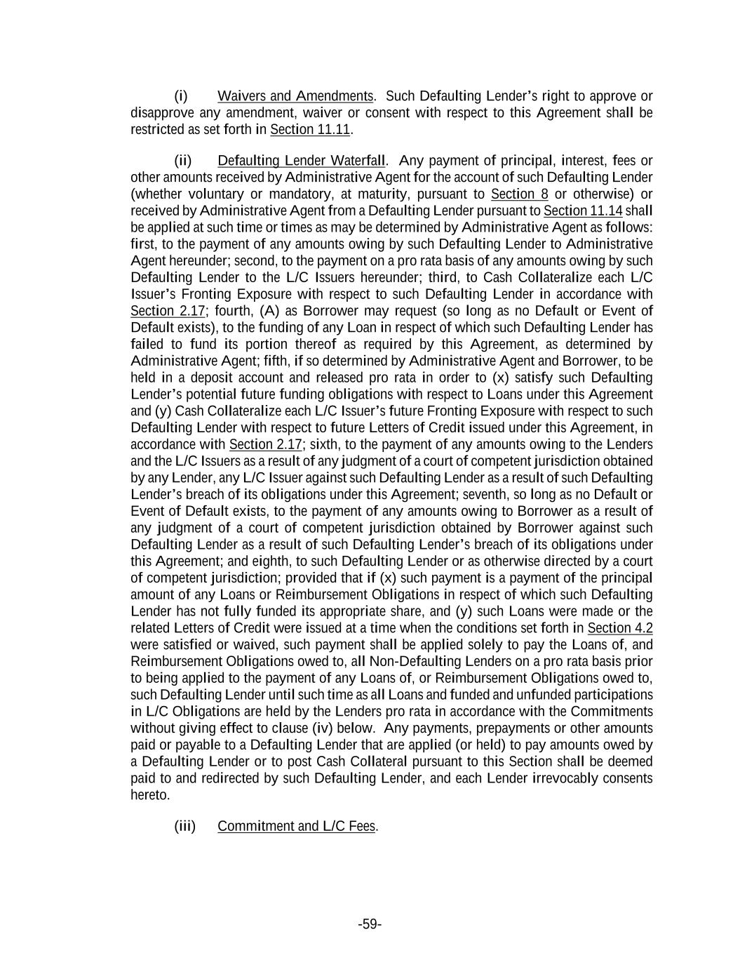 -59- (i) Waivers and Amendments. Such Defaulting Lender’s right to approve or disapprove any amendment, waiver or consent with respect to this Agreement shall be restricted as set forth in Section 11.11. (ii) Defaulting Lender Waterfall. Any payment of principal, interest, fees or other amounts received by Administrative Agent for the account of such Defaulting Lender (whether voluntary or mandatory, at maturity, pursuant to Section 8 or otherwise) or received by Administrative Agent from a Defaulting Lender pursuant to Section 11.14 shall be applied at such time or times as may be determined by Administrative Agent as follows: first, to the payment of any amounts owing by such Defaulting Lender to Administrative Agent hereunder; second, to the payment on a pro rata basis of any amounts owing by such Defaulting Lender to the L/C Issuers hereunder; third, to Cash Collateralize each L/C Issuer’s Fronting Exposure with respect to such Defaulting Lender in accordance with Section 2.17; fourth, (A) as Borrower may request (so long as no Default or Event of Default exists), to the funding of any Loan in respect of which such Defaulting Lender has failed to fund its portion thereof as required by this Agreement, as determined by Administrative Agent; fifth, if so determined by Administrative Agent and Borrower, to be held in a deposit account and released pro rata in order to (x) satisfy such Defaulting Lender’s potential future funding obligations with respect to Loans under this Agreement and (y) Cash Collateralize each L/C Issuer’s future Fronting Exposure with respect to such Defaulting Lender with respect to future Letters of Credit issued under this Agreement, in accordance with Section 2.17; sixth, to the payment of any amounts owing to the Lenders and the L/C Issuers as a result of any judgment of a court of competent jurisdiction obtained by any Lender, any L/C Issuer against such Defaulting Lender as a result of such Defaulting Lender’s breach of its obligations under this Agreement; seventh, so long as no Default or Event of Default exists, to the payment of any amounts owing to Borrower as a result of any judgment of a court of competent jurisdiction obtained by Borrower against such Defaulting Lender as a result of such Defaulting Lender’s breach of its obligations under this Agreement; and eighth, to such Defaulting Lender or as otherwise directed by a court of competent jurisdiction; provided that if (x) such payment is a payment of the principal amount of any Loans or Reimbursement Obligations in respect of which such Defaulting Lender has not fully funded its appropriate share, and (y) such Loans were made or the related Letters of Credit were issued at a time when the conditions set forth in Section 4.2 were satisfied or waived, such payment shall be applied solely to pay the Loans of, and Reimbursement Obligations owed to, all Non-Defaulting Lenders on a pro rata basis prior to being applied to the payment of any Loans of, or Reimbursement Obligations owed to, such Defaulting Lender until such time as all Loans and funded and unfunded participations in L/C Obligations are held by the Lenders pro rata in accordance with the Commitments without giving effect to clause (iv) below. Any payments, prepayments or other amounts paid or payable to a Defaulting Lender that are applied (or held) to pay amounts owed by a Defaulting Lender or to post Cash Collateral pursuant to this Section shall be deemed paid to and redirected by such Defaulting Lender, and each Lender irrevocably consents hereto. (iii) Commitment and L/C Fees.