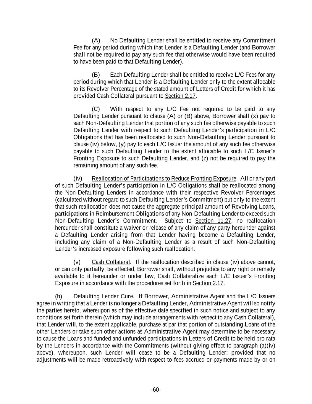 -60- (A) No Defaulting Lender shall be entitled to receive any Commitment Fee for any period during which that Lender is a Defaulting Lender (and Borrower shall not be required to pay any such fee that otherwise would have been required to have been paid to that Defaulting Lender). (B) Each Defaulting Lender shall be entitled to receive L/C Fees for any period during which that Lender is a Defaulting Lender only to the extent allocable to its Revolver Percentage of the stated amount of Letters of Credit for which it has provided Cash Collateral pursuant to Section 2.17. (C) With respect to any L/C Fee not required to be paid to any Defaulting Lender pursuant to clause (A) or (B) above, Borrower shall (x) pay to each Non-Defaulting Lender that portion of any such fee otherwise payable to such Defaulting Lender with respect to such Defaulting Lender’s participation in L/C Obligations that has been reallocated to such Non-Defaulting Lender pursuant to clause (iv) below, (y) pay to each L/C Issuer the amount of any such fee otherwise payable to such Defaulting Lender to the extent allocable to such L/C Issuer’s Fronting Exposure to such Defaulting Lender, and (z) not be required to pay the remaining amount of any such fee. (iv) Reallocation of Participations to Reduce Fronting Exposure. All or any part of such Defaulting Lender’s participation in L/C Obligations shall be reallocated among the Non-Defaulting Lenders in accordance with their respective Revolver Percentages (calculated without regard to such Defaulting Lender’s Commitment) but only to the extent that such reallocation does not cause the aggregate principal amount of Revolving Loans, participations in Reimbursement Obligations of any Non-Defaulting Lender to exceed such Non-Defaulting Lender’s Commitment. Subject to Section 11.27, no reallocation hereunder shall constitute a waiver or release of any claim of any party hereunder against a Defaulting Lender arising from that Lender having become a Defaulting Lender, including any claim of a Non-Defaulting Lender as a result of such Non-Defaulting Lender’s increased exposure following such reallocation. (v) Cash Collateral. If the reallocation described in clause (iv) above cannot, or can only partially, be effected, Borrower shall, without prejudice to any right or remedy available to it hereunder or under law, Cash Collateralize each L/C Issuer’s Fronting Exposure in accordance with the procedures set forth in Section 2.17. (b) Defaulting Lender Cure. If Borrower, Administrative Agent and the L/C Issuers agree in writing that a Lender is no longer a Defaulting Lender, Administrative Agent will so notify the parties hereto, whereupon as of the effective date specified in such notice and subject to any conditions set forth therein (which may include arrangements with respect to any Cash Collateral), that Lender will, to the extent applicable, purchase at par that portion of outstanding Loans of the other Lenders or take such other actions as Administrative Agent may determine to be necessary to cause the Loans and funded and unfunded participations in Letters of Credit to be held pro rata by the Lenders in accordance with the Commitments (without giving effect to paragraph (a)(iv) above), whereupon, such Lender will cease to be a Defaulting Lender; provided that no adjustments will be made retroactively with respect to fees accrued or payments made by or on
