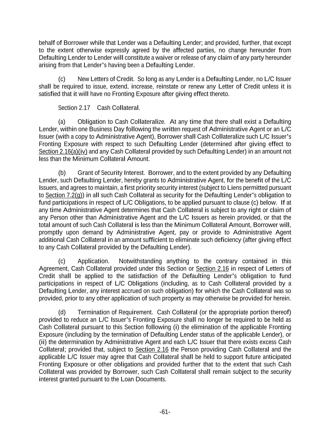 -61- behalf of Borrower while that Lender was a Defaulting Lender; and provided, further, that except to the extent otherwise expressly agreed by the affected parties, no change hereunder from Defaulting Lender to Lender will constitute a waiver or release of any claim of any party hereunder arising from that Lender’s having been a Defaulting Lender. (c) New Letters of Credit. So long as any Lender is a Defaulting Lender, no L/C Issuer shall be required to issue, extend, increase, reinstate or renew any Letter of Credit unless it is satisfied that it will have no Fronting Exposure after giving effect thereto. Section 2.17 Cash Collateral. (a) Obligation to Cash Collateralize. At any time that there shall exist a Defaulting Lender, within one Business Day following the written request of Administrative Agent or an L/C Issuer (with a copy to Administrative Agent), Borrower shall Cash Collateralize such L/C Issuer’s Fronting Exposure with respect to such Defaulting Lender (determined after giving effect to Section 2.16(a)(iv) and any Cash Collateral provided by such Defaulting Lender) in an amount not less than the Minimum Collateral Amount. (b) Grant of Security Interest. Borrower, and to the extent provided by any Defaulting Lender, such Defaulting Lender, hereby grants to Administrative Agent, for the benefit of the L/C Issuers, and agrees to maintain, a first priority security interest (subject to Liens permitted pursuant to Section 7.2(g)) in all such Cash Collateral as security for the Defaulting Lender’s obligation to fund participations in respect of L/C Obligations, to be applied pursuant to clause (c) below. If at any time Administrative Agent determines that Cash Collateral is subject to any right or claim of any Person other than Administrative Agent and the L/C Issuers as herein provided, or that the total amount of such Cash Collateral is less than the Minimum Collateral Amount, Borrower will, promptly upon demand by Administrative Agent, pay or provide to Administrative Agent additional Cash Collateral in an amount sufficient to eliminate such deficiency (after giving effect to any Cash Collateral provided by the Defaulting Lender). (c) Application. Notwithstanding anything to the contrary contained in this Agreement, Cash Collateral provided under this Section or Section 2.16 in respect of Letters of Credit shall be applied to the satisfaction of the Defaulting Lender’s obligation to fund participations in respect of L/C Obligations (including, as to Cash Collateral provided by a Defaulting Lender, any interest accrued on such obligation) for which the Cash Collateral was so provided, prior to any other application of such property as may otherwise be provided for herein. (d) Termination of Requirement. Cash Collateral (or the appropriate portion thereof) provided to reduce an L/C Issuer’s Fronting Exposure shall no longer be required to be held as Cash Collateral pursuant to this Section following (i) the elimination of the applicable Fronting Exposure (including by the termination of Defaulting Lender status of the applicable Lender), or (ii) the determination by Administrative Agent and each L/C Issuer that there exists excess Cash Collateral; provided that, subject to Section 2.16 the Person providing Cash Collateral and the applicable L/C Issuer may agree that Cash Collateral shall be held to support future anticipated Fronting Exposure or other obligations and provided further that to the extent that such Cash Collateral was provided by Borrower, such Cash Collateral shall remain subject to the security interest granted pursuant to the Loan Documents.