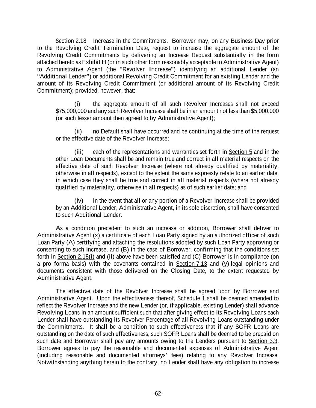 -62- Section 2.18 Increase in the Commitments. Borrower may, on any Business Day prior to the Revolving Credit Termination Date, request to increase the aggregate amount of the Revolving Credit Commitments by delivering an Increase Request substantially in the form attached hereto as Exhibit H (or in such other form reasonably acceptable to Administrative Agent) to Administrative Agent (the “Revolver Increase”) identifying an additional Lender (an “Additional Lender”) or additional Revolving Credit Commitment for an existing Lender and the amount of its Revolving Credit Commitment (or additional amount of its Revolving Credit Commitment); provided, however, that: (i) the aggregate amount of all such Revolver Increases shall not exceed $75,000,000 and any such Revolver Increase shall be in an amount not less than $5,000,000 (or such lesser amount then agreed to by Administrative Agent); (ii) no Default shall have occurred and be continuing at the time of the request or the effective date of the Revolver Increase; (iii) each of the representations and warranties set forth in Section 5 and in the other Loan Documents shall be and remain true and correct in all material respects on the effective date of such Revolver Increase (where not already qualified by materiality, otherwise in all respects), except to the extent the same expressly relate to an earlier date, in which case they shall be true and correct in all material respects (where not already qualified by materiality, otherwise in all respects) as of such earlier date; and (iv) in the event that all or any portion of a Revolver Increase shall be provided by an Additional Lender, Administrative Agent, in its sole discretion, shall have consented to such Additional Lender. As a condition precedent to such an increase or addition, Borrower shall deliver to Administrative Agent (x) a certificate of each Loan Party signed by an authorized officer of such Loan Party (A) certifying and attaching the resolutions adopted by such Loan Party approving or consenting to such increase, and (B) in the case of Borrower, confirming that the conditions set forth in Section 2.18(i) and (ii) above have been satisfied and (C) Borrower is in compliance (on a pro forma basis) with the covenants contained in Section 7.13 and (y) legal opinions and documents consistent with those delivered on the Closing Date, to the extent requested by Administrative Agent. The effective date of the Revolver Increase shall be agreed upon by Borrower and Administrative Agent. Upon the effectiveness thereof, Schedule 1 shall be deemed amended to reflect the Revolver Increase and the new Lender (or, if applicable, existing Lender) shall advance Revolving Loans in an amount sufficient such that after giving effect to its Revolving Loans each Lender shall have outstanding its Revolver Percentage of all Revolving Loans outstanding under the Commitments. It shall be a condition to such effectiveness that if any SOFR Loans are outstanding on the date of such effectiveness, such SOFR Loans shall be deemed to be prepaid on such date and Borrower shall pay any amounts owing to the Lenders pursuant to Section 3.3. Borrower agrees to pay the reasonable and documented expenses of Administrative Agent (including reasonable and documented attorneys’ fees) relating to any Revolver Increase. Notwithstanding anything herein to the contrary, no Lender shall have any obligation to increase