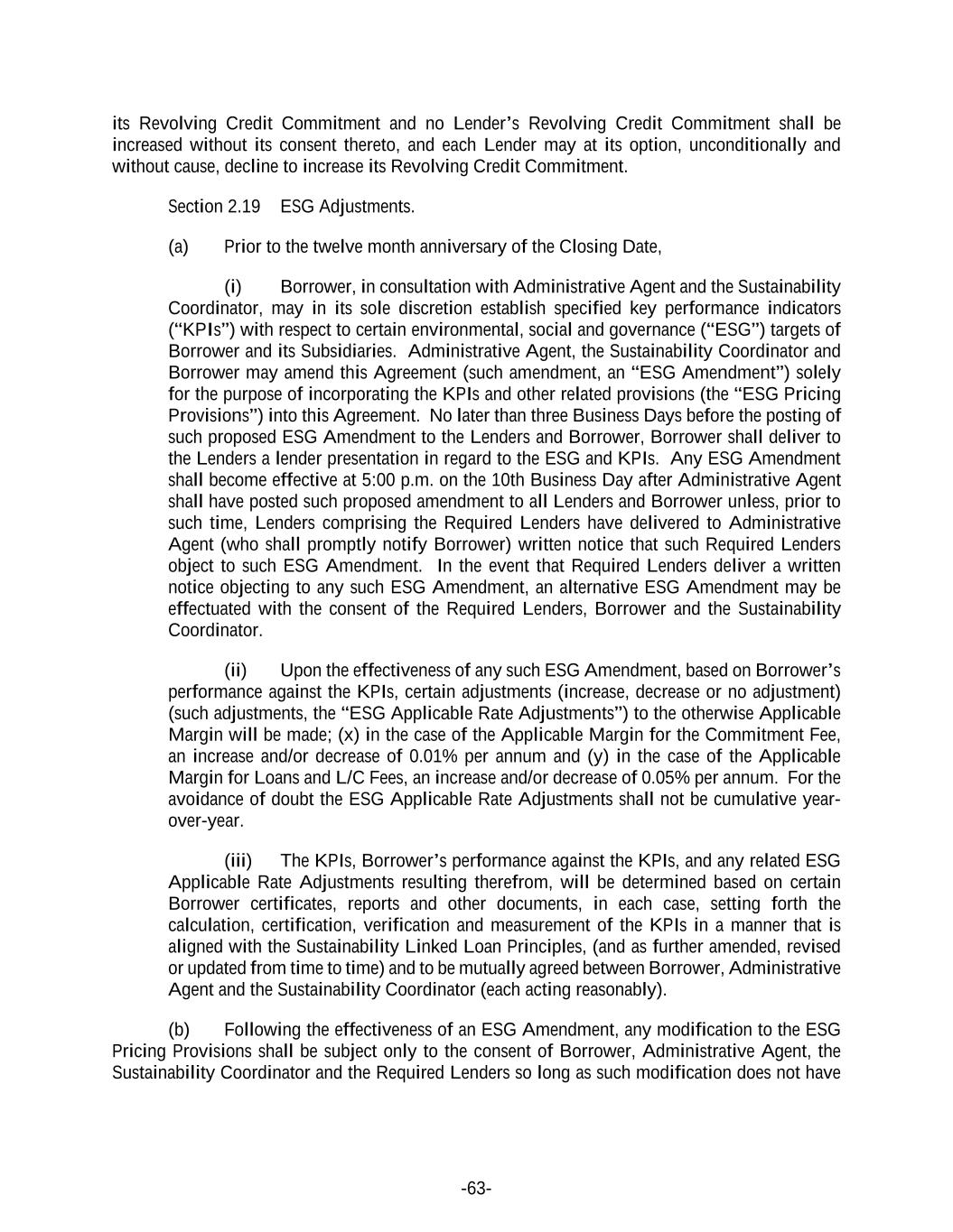 -63- its Revolving Credit Commitment and no Lender’s Revolving Credit Commitment shall be increased without its consent thereto, and each Lender may at its option, unconditionally and without cause, decline to increase its Revolving Credit Commitment. Section 2.19 ESG Adjustments. (a) Prior to the twelve month anniversary of the Closing Date, (i) Borrower, in consultation with Administrative Agent and the Sustainability Coordinator, may in its sole discretion establish specified key performance indicators (“KPIs”) with respect to certain environmental, social and governance (“ESG”) targets of Borrower and its Subsidiaries. Administrative Agent, the Sustainability Coordinator and Borrower may amend this Agreement (such amendment, an “ESG Amendment”) solely for the purpose of incorporating the KPIs and other related provisions (the “ESG Pricing Provisions”) into this Agreement. No later than three Business Days before the posting of such proposed ESG Amendment to the Lenders and Borrower, Borrower shall deliver to the Lenders a lender presentation in regard to the ESG and KPIs. Any ESG Amendment shall become effective at 5:00 p.m. on the 10th Business Day after Administrative Agent shall have posted such proposed amendment to all Lenders and Borrower unless, prior to such time, Lenders comprising the Required Lenders have delivered to Administrative Agent (who shall promptly notify Borrower) written notice that such Required Lenders object to such ESG Amendment. In the event that Required Lenders deliver a written notice objecting to any such ESG Amendment, an alternative ESG Amendment may be effectuated with the consent of the Required Lenders, Borrower and the Sustainability Coordinator. (ii) Upon the effectiveness of any such ESG Amendment, based on Borrower’s performance against the KPIs, certain adjustments (increase, decrease or no adjustment) (such adjustments, the “ESG Applicable Rate Adjustments”) to the otherwise Applicable Margin will be made; (x) in the case of the Applicable Margin for the Commitment Fee, an increase and/or decrease of 0.01% per annum and (y) in the case of the Applicable Margin for Loans and L/C Fees, an increase and/or decrease of 0.05% per annum. For the avoidance of doubt the ESG Applicable Rate Adjustments shall not be cumulative year- over-year. (iii) The KPIs, Borrower’s performance against the KPIs, and any related ESG Applicable Rate Adjustments resulting therefrom, will be determined based on certain Borrower certificates, reports and other documents, in each case, setting forth the calculation, certification, verification and measurement of the KPIs in a manner that is aligned with the Sustainability Linked Loan Principles, (and as further amended, revised or updated from time to time) and to be mutually agreed between Borrower, Administrative Agent and the Sustainability Coordinator (each acting reasonably). (b) Following the effectiveness of an ESG Amendment, any modification to the ESG Pricing Provisions shall be subject only to the consent of Borrower, Administrative Agent, the Sustainability Coordinator and the Required Lenders so long as such modification does not have