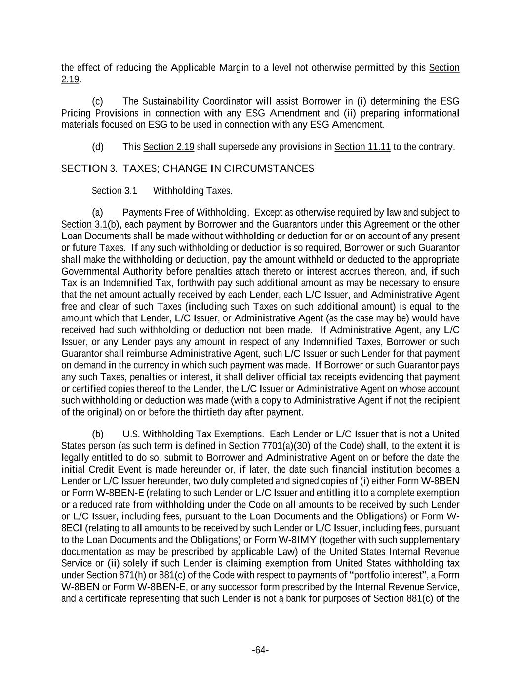-64- the effect of reducing the Applicable Margin to a level not otherwise permitted by this Section 2.19. (c) The Sustainability Coordinator will assist Borrower in (i) determining the ESG Pricing Provisions in connection with any ESG Amendment and (ii) preparing informational materials focused on ESG to be used in connection with any ESG Amendment. (d) This Section 2.19 shall supersede any provisions in Section 11.11 to the contrary. SECTION 3. TAXES; CHANGE IN CIRCUMSTANCES Section 3.1 Withholding Taxes. (a) Payments Free of Withholding. Except as otherwise required by law and subject to Section 3.1(b), each payment by Borrower and the Guarantors under this Agreement or the other Loan Documents shall be made without withholding or deduction for or on account of any present or future Taxes. If any such withholding or deduction is so required, Borrower or such Guarantor shall make the withholding or deduction, pay the amount withheld or deducted to the appropriate Governmental Authority before penalties attach thereto or interest accrues thereon, and, if such Tax is an Indemnified Tax, forthwith pay such additional amount as may be necessary to ensure that the net amount actually received by each Lender, each L/C Issuer, and Administrative Agent free and clear of such Taxes (including such Taxes on such additional amount) is equal to the amount which that Lender, L/C Issuer, or Administrative Agent (as the case may be) would have received had such withholding or deduction not been made. If Administrative Agent, any L/C Issuer, or any Lender pays any amount in respect of any Indemnified Taxes, Borrower or such Guarantor shall reimburse Administrative Agent, such L/C Issuer or such Lender for that payment on demand in the currency in which such payment was made. If Borrower or such Guarantor pays any such Taxes, penalties or interest, it shall deliver official tax receipts evidencing that payment or certified copies thereof to the Lender, the L/C Issuer or Administrative Agent on whose account such withholding or deduction was made (with a copy to Administrative Agent if not the recipient of the original) on or before the thirtieth day after payment. (b) U.S. Withholding Tax Exemptions. Each Lender or L/C Issuer that is not a United States person (as such term is defined in Section 7701(a)(30) of the Code) shall, to the extent it is legally entitled to do so, submit to Borrower and Administrative Agent on or before the date the initial Credit Event is made hereunder or, if later, the date such financial institution becomes a Lender or L/C Issuer hereunder, two duly completed and signed copies of (i) either Form W-8BEN or Form W-8BEN-E (relating to such Lender or L/C Issuer and entitling it to a complete exemption or a reduced rate from withholding under the Code on all amounts to be received by such Lender or L/C Issuer, including fees, pursuant to the Loan Documents and the Obligations) or Form W- 8ECI (relating to all amounts to be received by such Lender or L/C Issuer, including fees, pursuant to the Loan Documents and the Obligations) or Form W-8IMY (together with such supplementary documentation as may be prescribed by applicable Law) of the United States Internal Revenue Service or (ii) solely if such Lender is claiming exemption from United States withholding tax under Section 871(h) or 881(c) of the Code with respect to payments of “portfolio interest”, a Form W-8BEN or Form W-8BEN-E, or any successor form prescribed by the Internal Revenue Service, and a certificate representing that such Lender is not a bank for purposes of Section 881(c) of the