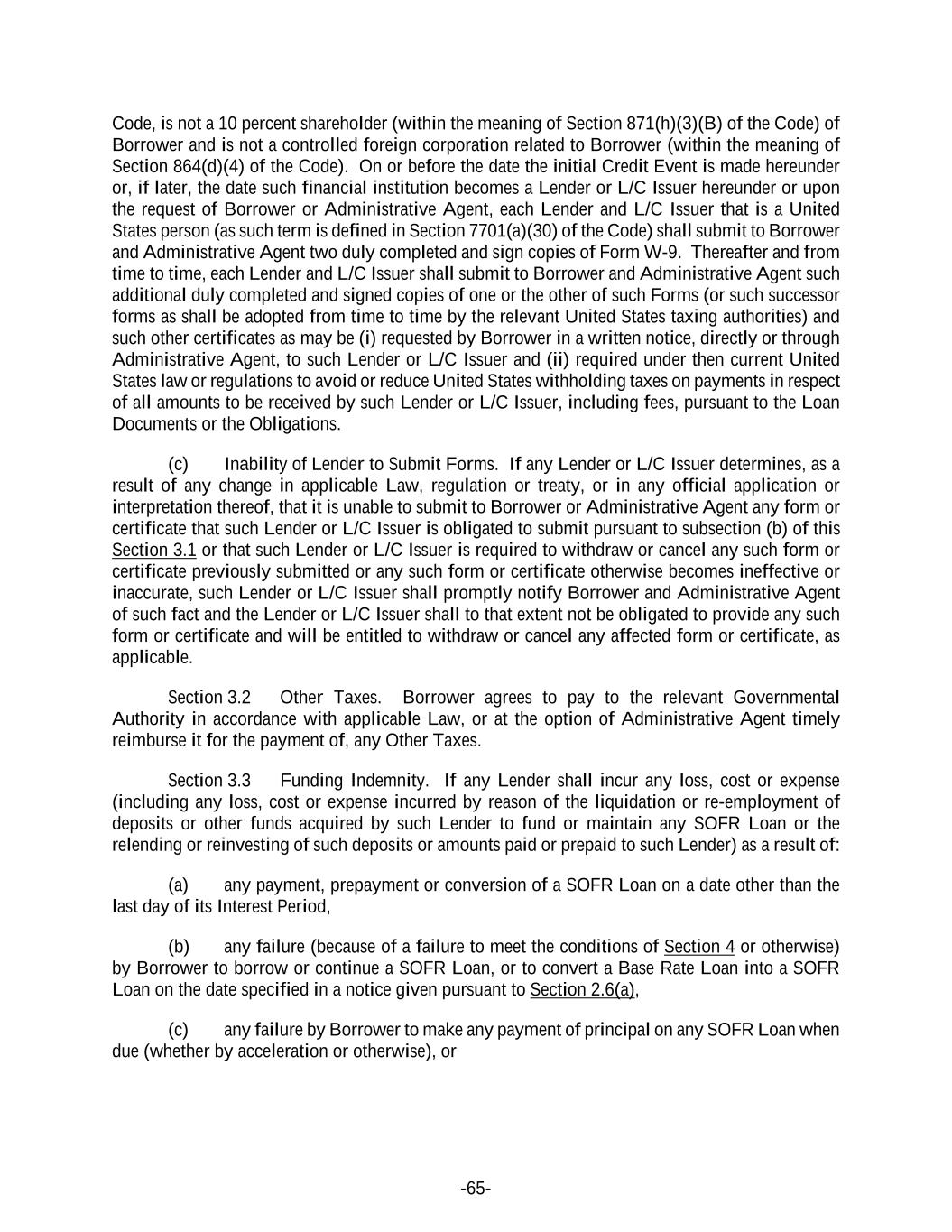 -65- Code, is not a 10 percent shareholder (within the meaning of Section 871(h)(3)(B) of the Code) of Borrower and is not a controlled foreign corporation related to Borrower (within the meaning of Section 864(d)(4) of the Code). On or before the date the initial Credit Event is made hereunder or, if later, the date such financial institution becomes a Lender or L/C Issuer hereunder or upon the request of Borrower or Administrative Agent, each Lender and L/C Issuer that is a United States person (as such term is defined in Section 7701(a)(30) of the Code) shall submit to Borrower and Administrative Agent two duly completed and sign copies of Form W-9. Thereafter and from time to time, each Lender and L/C Issuer shall submit to Borrower and Administrative Agent such additional duly completed and signed copies of one or the other of such Forms (or such successor forms as shall be adopted from time to time by the relevant United States taxing authorities) and such other certificates as may be (i) requested by Borrower in a written notice, directly or through Administrative Agent, to such Lender or L/C Issuer and (ii) required under then current United States law or regulations to avoid or reduce United States withholding taxes on payments in respect of all amounts to be received by such Lender or L/C Issuer, including fees, pursuant to the Loan Documents or the Obligations. (c) Inability of Lender to Submit Forms. If any Lender or L/C Issuer determines, as a result of any change in applicable Law, regulation or treaty, or in any official application or interpretation thereof, that it is unable to submit to Borrower or Administrative Agent any form or certificate that such Lender or L/C Issuer is obligated to submit pursuant to subsection (b) of this Section 3.1 or that such Lender or L/C Issuer is required to withdraw or cancel any such form or certificate previously submitted or any such form or certificate otherwise becomes ineffective or inaccurate, such Lender or L/C Issuer shall promptly notify Borrower and Administrative Agent of such fact and the Lender or L/C Issuer shall to that extent not be obligated to provide any such form or certificate and will be entitled to withdraw or cancel any affected form or certificate, as applicable. Section 3.2 Other Taxes. Borrower agrees to pay to the relevant Governmental Authority in accordance with applicable Law, or at the option of Administrative Agent timely reimburse it for the payment of, any Other Taxes. Section 3.3 Funding Indemnity. If any Lender shall incur any loss, cost or expense (including any loss, cost or expense incurred by reason of the liquidation or re-employment of deposits or other funds acquired by such Lender to fund or maintain any SOFR Loan or the relending or reinvesting of such deposits or amounts paid or prepaid to such Lender) as a result of: (a) any payment, prepayment or conversion of a SOFR Loan on a date other than the last day of its Interest Period, (b) any failure (because of a failure to meet the conditions of Section 4 or otherwise) by Borrower to borrow or continue a SOFR Loan, or to convert a Base Rate Loan into a SOFR Loan on the date specified in a notice given pursuant to Section 2.6(a), (c) any failure by Borrower to make any payment of principal on any SOFR Loan when due (whether by acceleration or otherwise), or