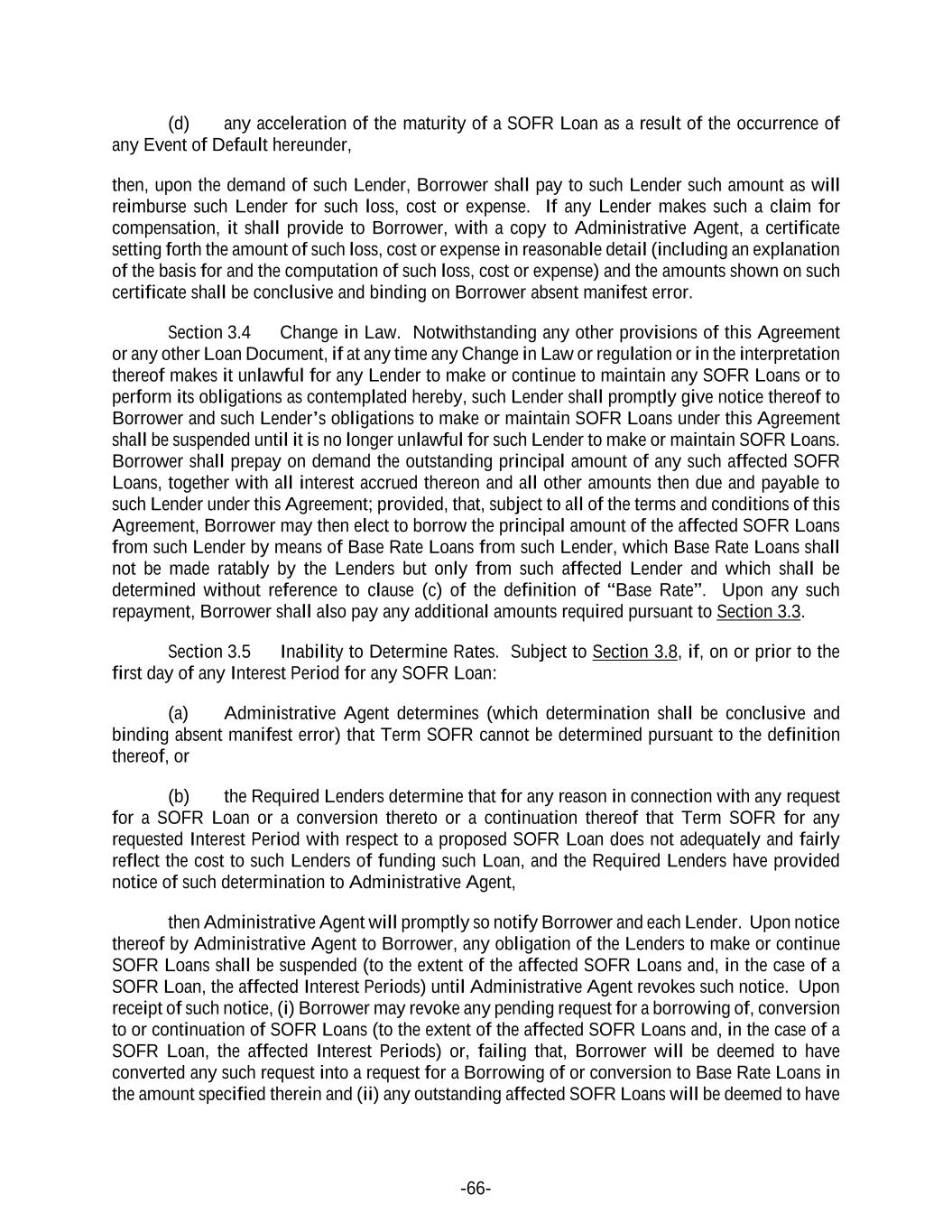 -66- (d) any acceleration of the maturity of a SOFR Loan as a result of the occurrence of any Event of Default hereunder, then, upon the demand of such Lender, Borrower shall pay to such Lender such amount as will reimburse such Lender for such loss, cost or expense. If any Lender makes such a claim for compensation, it shall provide to Borrower, with a copy to Administrative Agent, a certificate setting forth the amount of such loss, cost or expense in reasonable detail (including an explanation of the basis for and the computation of such loss, cost or expense) and the amounts shown on such certificate shall be conclusive and binding on Borrower absent manifest error. Section 3.4 Change in Law. Notwithstanding any other provisions of this Agreement or any other Loan Document, if at any time any Change in Law or regulation or in the interpretation thereof makes it unlawful for any Lender to make or continue to maintain any SOFR Loans or to perform its obligations as contemplated hereby, such Lender shall promptly give notice thereof to Borrower and such Lender’s obligations to make or maintain SOFR Loans under this Agreement shall be suspended until it is no longer unlawful for such Lender to make or maintain SOFR Loans. Borrower shall prepay on demand the outstanding principal amount of any such affected SOFR Loans, together with all interest accrued thereon and all other amounts then due and payable to such Lender under this Agreement; provided, that, subject to all of the terms and conditions of this Agreement, Borrower may then elect to borrow the principal amount of the affected SOFR Loans from such Lender by means of Base Rate Loans from such Lender, which Base Rate Loans shall not be made ratably by the Lenders but only from such affected Lender and which shall be determined without reference to clause (c) of the definition of “Base Rate”. Upon any such repayment, Borrower shall also pay any additional amounts required pursuant to Section 3.3. Section 3.5 Inability to Determine Rates. Subject to Section 3.8, if, on or prior to the first day of any Interest Period for any SOFR Loan: (a) Administrative Agent determines (which determination shall be conclusive and binding absent manifest error) that Term SOFR cannot be determined pursuant to the definition thereof, or (b) the Required Lenders determine that for any reason in connection with any request for a SOFR Loan or a conversion thereto or a continuation thereof that Term SOFR for any requested Interest Period with respect to a proposed SOFR Loan does not adequately and fairly reflect the cost to such Lenders of funding such Loan, and the Required Lenders have provided notice of such determination to Administrative Agent, then Administrative Agent will promptly so notify Borrower and each Lender. Upon notice thereof by Administrative Agent to Borrower, any obligation of the Lenders to make or continue SOFR Loans shall be suspended (to the extent of the affected SOFR Loans and, in the case of a SOFR Loan, the affected Interest Periods) until Administrative Agent revokes such notice. Upon receipt of such notice, (i) Borrower may revoke any pending request for a borrowing of, conversion to or continuation of SOFR Loans (to the extent of the affected SOFR Loans and, in the case of a SOFR Loan, the affected Interest Periods) or, failing that, Borrower will be deemed to have converted any such request into a request for a Borrowing of or conversion to Base Rate Loans in the amount specified therein and (ii) any outstanding affected SOFR Loans will be deemed to have