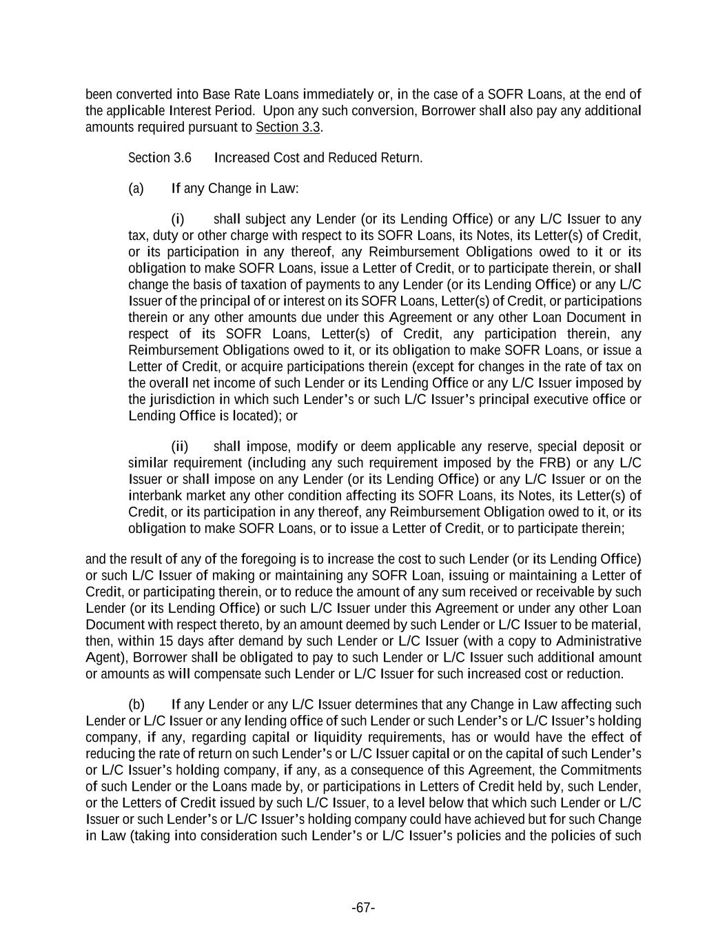 -67- been converted into Base Rate Loans immediately or, in the case of a SOFR Loans, at the end of the applicable Interest Period. Upon any such conversion, Borrower shall also pay any additional amounts required pursuant to Section 3.3. Section 3.6 Increased Cost and Reduced Return. (a) If any Change in Law: (i) shall subject any Lender (or its Lending Office) or any L/C Issuer to any tax, duty or other charge with respect to its SOFR Loans, its Notes, its Letter(s) of Credit, or its participation in any thereof, any Reimbursement Obligations owed to it or its obligation to make SOFR Loans, issue a Letter of Credit, or to participate therein, or shall change the basis of taxation of payments to any Lender (or its Lending Office) or any L/C Issuer of the principal of or interest on its SOFR Loans, Letter(s) of Credit, or participations therein or any other amounts due under this Agreement or any other Loan Document in respect of its SOFR Loans, Letter(s) of Credit, any participation therein, any Reimbursement Obligations owed to it, or its obligation to make SOFR Loans, or issue a Letter of Credit, or acquire participations therein (except for changes in the rate of tax on the overall net income of such Lender or its Lending Office or any L/C Issuer imposed by the jurisdiction in which such Lender’s or such L/C Issuer’s principal executive office or Lending Office is located); or (ii) shall impose, modify or deem applicable any reserve, special deposit or similar requirement (including any such requirement imposed by the FRB) or any L/C Issuer or shall impose on any Lender (or its Lending Office) or any L/C Issuer or on the interbank market any other condition affecting its SOFR Loans, its Notes, its Letter(s) of Credit, or its participation in any thereof, any Reimbursement Obligation owed to it, or its obligation to make SOFR Loans, or to issue a Letter of Credit, or to participate therein; and the result of any of the foregoing is to increase the cost to such Lender (or its Lending Office) or such L/C Issuer of making or maintaining any SOFR Loan, issuing or maintaining a Letter of Credit, or participating therein, or to reduce the amount of any sum received or receivable by such Lender (or its Lending Office) or such L/C Issuer under this Agreement or under any other Loan Document with respect thereto, by an amount deemed by such Lender or L/C Issuer to be material, then, within 15 days after demand by such Lender or L/C Issuer (with a copy to Administrative Agent), Borrower shall be obligated to pay to such Lender or L/C Issuer such additional amount or amounts as will compensate such Lender or L/C Issuer for such increased cost or reduction. (b) If any Lender or any L/C Issuer determines that any Change in Law affecting such Lender or L/C Issuer or any lending office of such Lender or such Lender’s or L/C Issuer’s holding company, if any, regarding capital or liquidity requirements, has or would have the effect of reducing the rate of return on such Lender’s or L/C Issuer capital or on the capital of such Lender’s or L/C Issuer’s holding company, if any, as a consequence of this Agreement, the Commitments of such Lender or the Loans made by, or participations in Letters of Credit held by, such Lender, or the Letters of Credit issued by such L/C Issuer, to a level below that which such Lender or L/C Issuer or such Lender’s or L/C Issuer’s holding company could have achieved but for such Change in Law (taking into consideration such Lender’s or L/C Issuer’s policies and the policies of such