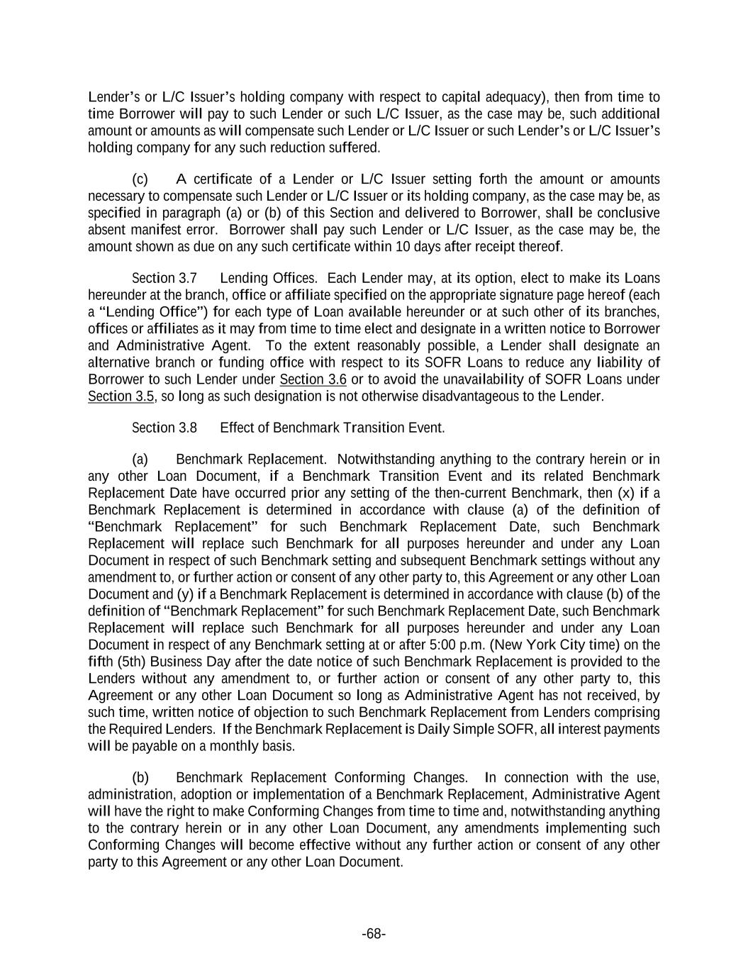 -68- Lender’s or L/C Issuer’s holding company with respect to capital adequacy), then from time to time Borrower will pay to such Lender or such L/C Issuer, as the case may be, such additional amount or amounts as will compensate such Lender or L/C Issuer or such Lender’s or L/C Issuer’s holding company for any such reduction suffered. (c) A certificate of a Lender or L/C Issuer setting forth the amount or amounts necessary to compensate such Lender or L/C Issuer or its holding company, as the case may be, as specified in paragraph (a) or (b) of this Section and delivered to Borrower, shall be conclusive absent manifest error. Borrower shall pay such Lender or L/C Issuer, as the case may be, the amount shown as due on any such certificate within 10 days after receipt thereof. Section 3.7 Lending Offices. Each Lender may, at its option, elect to make its Loans hereunder at the branch, office or affiliate specified on the appropriate signature page hereof (each a “Lending Office”) for each type of Loan available hereunder or at such other of its branches, offices or affiliates as it may from time to time elect and designate in a written notice to Borrower and Administrative Agent. To the extent reasonably possible, a Lender shall designate an alternative branch or funding office with respect to its SOFR Loans to reduce any liability of Borrower to such Lender under Section 3.6 or to avoid the unavailability of SOFR Loans under Section 3.5, so long as such designation is not otherwise disadvantageous to the Lender. Section 3.8 Effect of Benchmark Transition Event. (a) Benchmark Replacement. Notwithstanding anything to the contrary herein or in any other Loan Document, if a Benchmark Transition Event and its related Benchmark Replacement Date have occurred prior any setting of the then-current Benchmark, then (x) if a Benchmark Replacement is determined in accordance with clause (a) of the definition of “Benchmark Replacement” for such Benchmark Replacement Date, such Benchmark Replacement will replace such Benchmark for all purposes hereunder and under any Loan Document in respect of such Benchmark setting and subsequent Benchmark settings without any amendment to, or further action or consent of any other party to, this Agreement or any other Loan Document and (y) if a Benchmark Replacement is determined in accordance with clause (b) of the definition of “Benchmark Replacement” for such Benchmark Replacement Date, such Benchmark Replacement will replace such Benchmark for all purposes hereunder and under any Loan Document in respect of any Benchmark setting at or after 5:00 p.m. (New York City time) on the fifth (5th) Business Day after the date notice of such Benchmark Replacement is provided to the Lenders without any amendment to, or further action or consent of any other party to, this Agreement or any other Loan Document so long as Administrative Agent has not received, by such time, written notice of objection to such Benchmark Replacement from Lenders comprising the Required Lenders. If the Benchmark Replacement is Daily Simple SOFR, all interest payments will be payable on a monthly basis. (b) Benchmark Replacement Conforming Changes. In connection with the use, administration, adoption or implementation of a Benchmark Replacement, Administrative Agent will have the right to make Conforming Changes from time to time and, notwithstanding anything to the contrary herein or in any other Loan Document, any amendments implementing such Conforming Changes will become effective without any further action or consent of any other party to this Agreement or any other Loan Document.