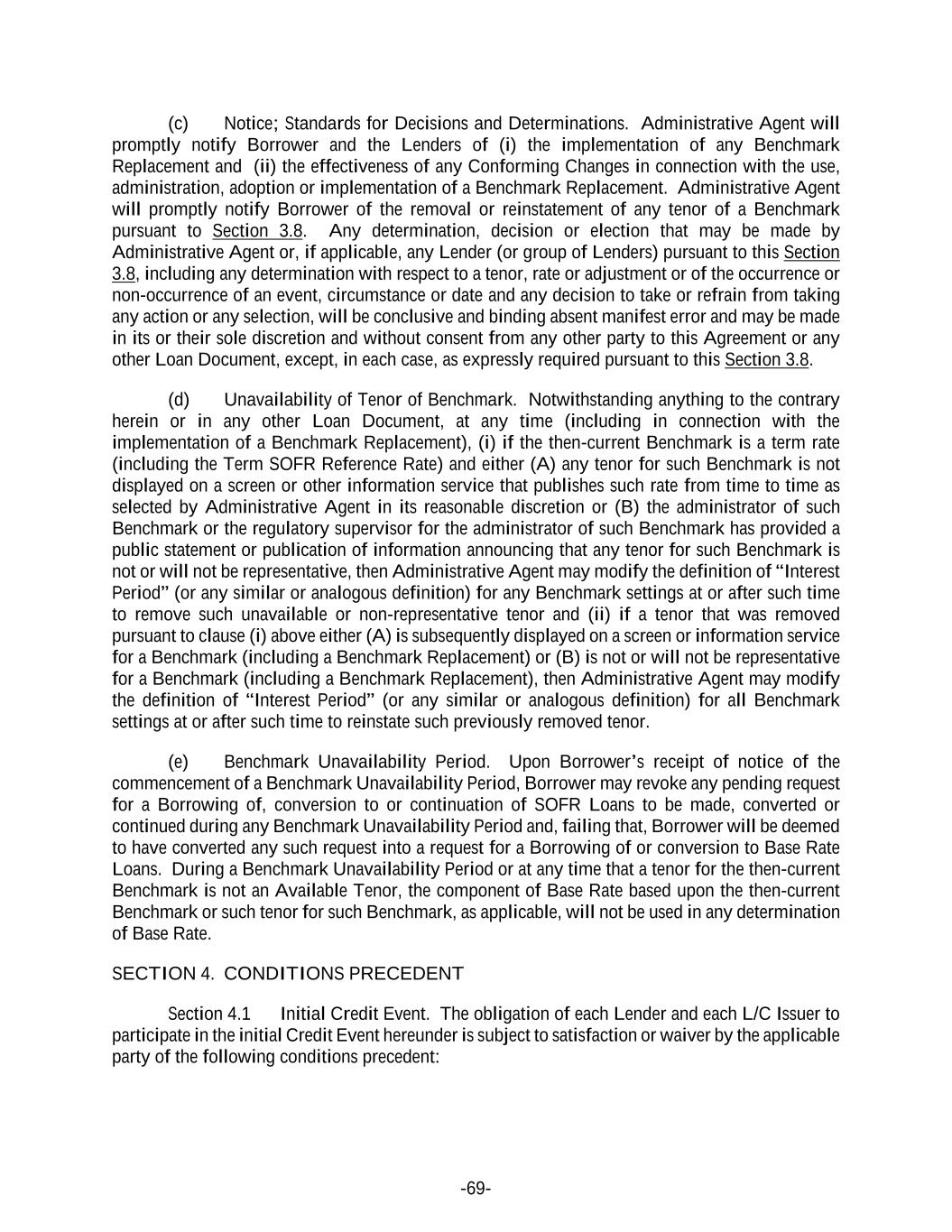 -69- (c) Notice; Standards for Decisions and Determinations. Administrative Agent will promptly notify Borrower and the Lenders of (i) the implementation of any Benchmark Replacement and (ii) the effectiveness of any Conforming Changes in connection with the use, administration, adoption or implementation of a Benchmark Replacement. Administrative Agent will promptly notify Borrower of the removal or reinstatement of any tenor of a Benchmark pursuant to Section 3.8. Any determination, decision or election that may be made by Administrative Agent or, if applicable, any Lender (or group of Lenders) pursuant to this Section 3.8, including any determination with respect to a tenor, rate or adjustment or of the occurrence or non-occurrence of an event, circumstance or date and any decision to take or refrain from taking any action or any selection, will be conclusive and binding absent manifest error and may be made in its or their sole discretion and without consent from any other party to this Agreement or any other Loan Document, except, in each case, as expressly required pursuant to this Section 3.8. (d) Unavailability of Tenor of Benchmark. Notwithstanding anything to the contrary herein or in any other Loan Document, at any time (including in connection with the implementation of a Benchmark Replacement), (i) if the then-current Benchmark is a term rate (including the Term SOFR Reference Rate) and either (A) any tenor for such Benchmark is not displayed on a screen or other information service that publishes such rate from time to time as selected by Administrative Agent in its reasonable discretion or (B) the administrator of such Benchmark or the regulatory supervisor for the administrator of such Benchmark has provided a public statement or publication of information announcing that any tenor for such Benchmark is not or will not be representative, then Administrative Agent may modify the definition of “Interest Period” (or any similar or analogous definition) for any Benchmark settings at or after such time to remove such unavailable or non-representative tenor and (ii) if a tenor that was removed pursuant to clause (i) above either (A) is subsequently displayed on a screen or information service for a Benchmark (including a Benchmark Replacement) or (B) is not or will not be representative for a Benchmark (including a Benchmark Replacement), then Administrative Agent may modify the definition of “Interest Period” (or any similar or analogous definition) for all Benchmark settings at or after such time to reinstate such previously removed tenor. (e) Benchmark Unavailability Period. Upon Borrower’s receipt of notice of the commencement of a Benchmark Unavailability Period, Borrower may revoke any pending request for a Borrowing of, conversion to or continuation of SOFR Loans to be made, converted or continued during any Benchmark Unavailability Period and, failing that, Borrower will be deemed to have converted any such request into a request for a Borrowing of or conversion to Base Rate Loans. During a Benchmark Unavailability Period or at any time that a tenor for the then-current Benchmark is not an Available Tenor, the component of Base Rate based upon the then-current Benchmark or such tenor for such Benchmark, as applicable, will not be used in any determination of Base Rate. SECTION 4. CONDITIONS PRECEDENT Section 4.1 Initial Credit Event. The obligation of each Lender and each L/C Issuer to participate in the initial Credit Event hereunder is subject to satisfaction or waiver by the applicable party of the following conditions precedent:
