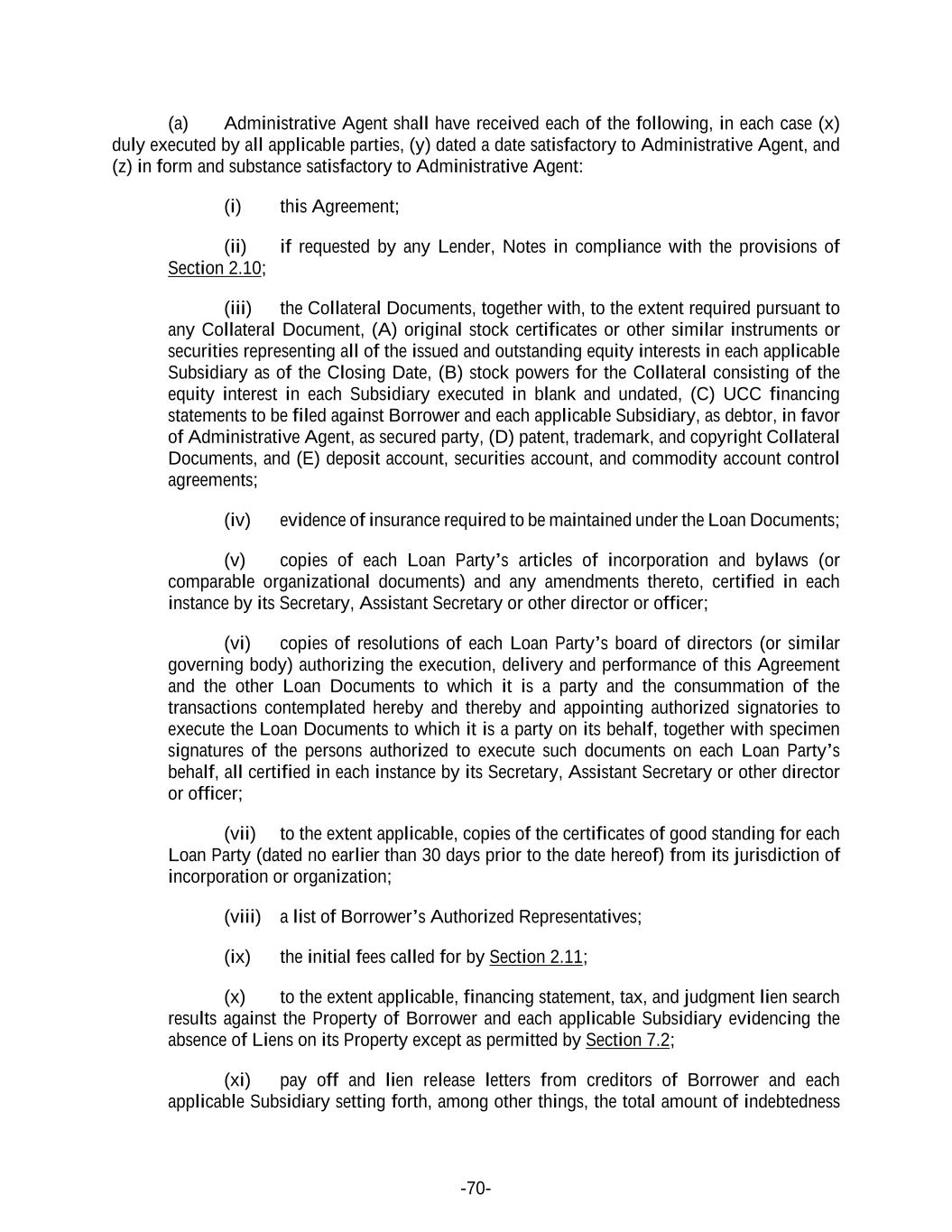 -70- (a) Administrative Agent shall have received each of the following, in each case (x) duly executed by all applicable parties, (y) dated a date satisfactory to Administrative Agent, and (z) in form and substance satisfactory to Administrative Agent: (i) this Agreement; (ii) if requested by any Lender, Notes in compliance with the provisions of Section 2.10; (iii) the Collateral Documents, together with, to the extent required pursuant to any Collateral Document, (A) original stock certificates or other similar instruments or securities representing all of the issued and outstanding equity interests in each applicable Subsidiary as of the Closing Date, (B) stock powers for the Collateral consisting of the equity interest in each Subsidiary executed in blank and undated, (C) UCC financing statements to be filed against Borrower and each applicable Subsidiary, as debtor, in favor of Administrative Agent, as secured party, (D) patent, trademark, and copyright Collateral Documents, and (E) deposit account, securities account, and commodity account control agreements; (iv) evidence of insurance required to be maintained under the Loan Documents; (v) copies of each Loan Party’s articles of incorporation and bylaws (or comparable organizational documents) and any amendments thereto, certified in each instance by its Secretary, Assistant Secretary or other director or officer; (vi) copies of resolutions of each Loan Party’s board of directors (or similar governing body) authorizing the execution, delivery and performance of this Agreement and the other Loan Documents to which it is a party and the consummation of the transactions contemplated hereby and thereby and appointing authorized signatories to execute the Loan Documents to which it is a party on its behalf, together with specimen signatures of the persons authorized to execute such documents on each Loan Party’s behalf, all certified in each instance by its Secretary, Assistant Secretary or other director or officer; (vii) to the extent applicable, copies of the certificates of good standing for each Loan Party (dated no earlier than 30 days prior to the date hereof) from its jurisdiction of incorporation or organization; (viii) a list of Borrower’s Authorized Representatives; (ix) the initial fees called for by Section 2.11; (x) to the extent applicable, financing statement, tax, and judgment lien search results against the Property of Borrower and each applicable Subsidiary evidencing the absence of Liens on its Property except as permitted by Section 7.2; (xi) pay off and lien release letters from creditors of Borrower and each applicable Subsidiary setting forth, among other things, the total amount of indebtedness