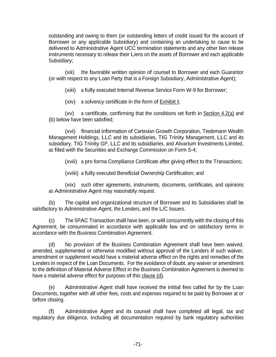 -71- outstanding and owing to them (or outstanding letters of credit issued for the account of Borrower or any applicable Subsidiary) and containing an undertaking to cause to be delivered to Administrative Agent UCC termination statements and any other lien release instruments necessary to release their Liens on the assets of Borrower and each applicable Subsidiary; (xii) the favorable written opinion of counsel to Borrower and each Guarantor (or with respect to any Loan Party that is a Foreign Subsidiary, Administrative Agent); (xiii) a fully executed Internal Revenue Service Form W-9 for Borrower; (xiv) a solvency certificate in the form of Exhibit I; (xv) a certificate, confirming that the conditions set forth in Section 4.2(a) and (b) below have been satisfied; (xvi) financial information of Cartesian Growth Corporation, Tiedemann Wealth Management Holdings, LLC and its subsidiaries, TIG Trinity Management, LLC and its subsidiary, TIG Trinity GP, LLC and its subsidiaries, and Alvarium Investments Limited, as filed with the Securities and Exchange Commission on Form S-4; (xvii) a pro forma Compliance Certificate after giving effect to the Transactions; (xviii) a fully executed Beneficial Ownership Certification; and (xix) such other agreements, instruments, documents, certificates, and opinions as Administrative Agent may reasonably request. (b) The capital and organizational structure of Borrower and its Subsidiaries shall be satisfactory to Administrative Agent, the Lenders, and the L/C Issuers. (c) The SPAC Transaction shall have been, or will concurrently with the closing of this Agreement, be consummated in accordance with applicable law and on satisfactory terms in accordance with the Business Combination Agreement. (d) No provision of the Business Combination Agreement shall have been waived, amended, supplemented or otherwise modified without approval of the Lenders if such waiver, amendment or supplement would have a material adverse effect on the rights and remedies of the Lenders in respect of the Loan Documents. For the avoidance of doubt, any waiver or amendment to the definition of Material Adverse Effect in the Business Combination Agreement is deemed to have a material adverse effect for purposes of this clause (d). (e) Administrative Agent shall have received the initial fees called for by the Loan Documents, together with all other fees, costs and expenses required to be paid by Borrower at or before closing. (f) Administrative Agent and its counsel shall have completed all legal, tax and regulatory due diligence, including all documentation required by bank regulatory authorities