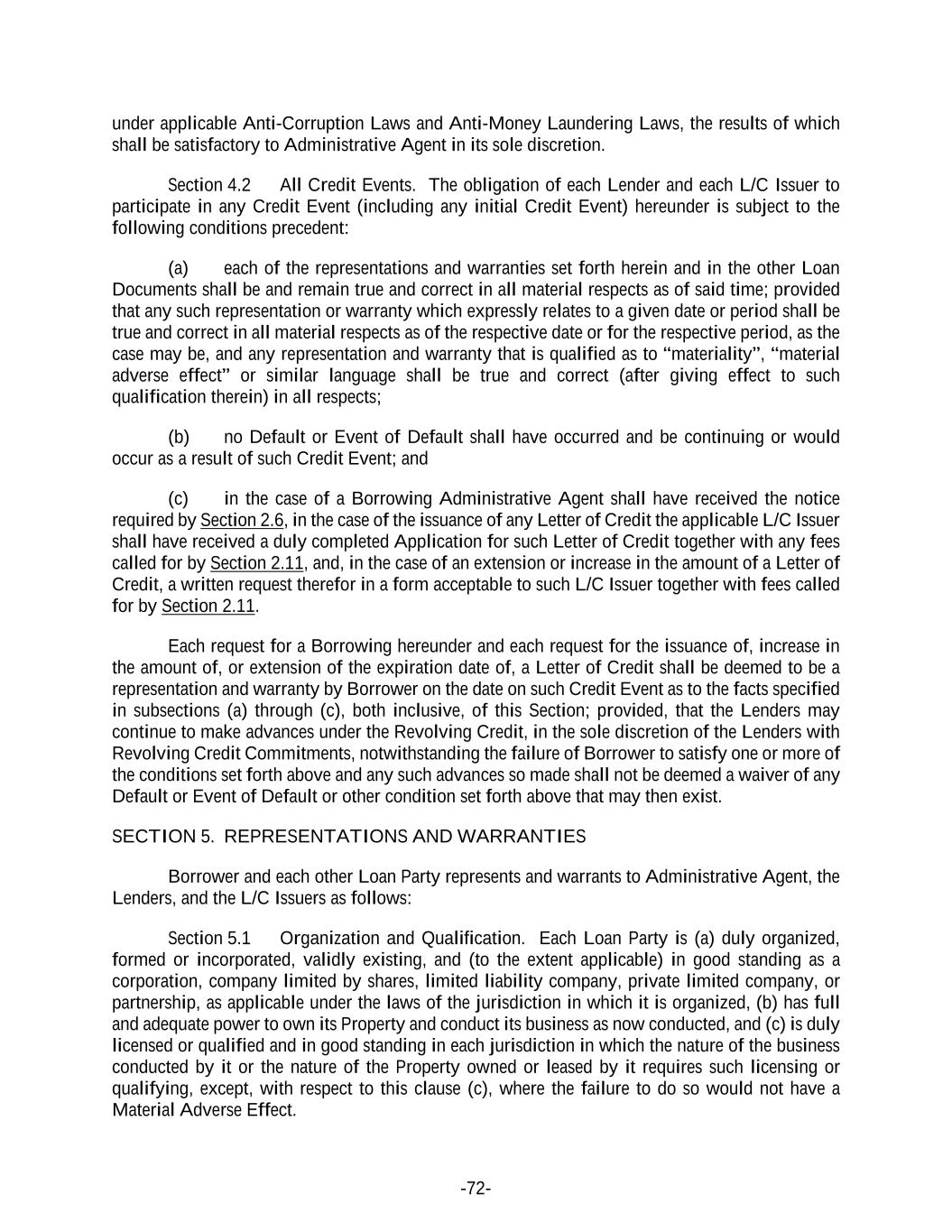 -72- under applicable Anti-Corruption Laws and Anti-Money Laundering Laws, the results of which shall be satisfactory to Administrative Agent in its sole discretion. Section 4.2 All Credit Events. The obligation of each Lender and each L/C Issuer to participate in any Credit Event (including any initial Credit Event) hereunder is subject to the following conditions precedent: (a) each of the representations and warranties set forth herein and in the other Loan Documents shall be and remain true and correct in all material respects as of said time; provided that any such representation or warranty which expressly relates to a given date or period shall be true and correct in all material respects as of the respective date or for the respective period, as the case may be, and any representation and warranty that is qualified as to “materiality”, “material adverse effect” or similar language shall be true and correct (after giving effect to such qualification therein) in all respects; (b) no Default or Event of Default shall have occurred and be continuing or would occur as a result of such Credit Event; and (c) in the case of a Borrowing Administrative Agent shall have received the notice required by Section 2.6, in the case of the issuance of any Letter of Credit the applicable L/C Issuer shall have received a duly completed Application for such Letter of Credit together with any fees called for by Section 2.11, and, in the case of an extension or increase in the amount of a Letter of Credit, a written request therefor in a form acceptable to such L/C Issuer together with fees called for by Section 2.11. Each request for a Borrowing hereunder and each request for the issuance of, increase in the amount of, or extension of the expiration date of, a Letter of Credit shall be deemed to be a representation and warranty by Borrower on the date on such Credit Event as to the facts specified in subsections (a) through (c), both inclusive, of this Section; provided, that the Lenders may continue to make advances under the Revolving Credit, in the sole discretion of the Lenders with Revolving Credit Commitments, notwithstanding the failure of Borrower to satisfy one or more of the conditions set forth above and any such advances so made shall not be deemed a waiver of any Default or Event of Default or other condition set forth above that may then exist. SECTION 5. REPRESENTATIONS AND WARRANTIES Borrower and each other Loan Party represents and warrants to Administrative Agent, the Lenders, and the L/C Issuers as follows: Section 5.1 Organization and Qualification. Each Loan Party is (a) duly organized, formed or incorporated, validly existing, and (to the extent applicable) in good standing as a corporation, company limited by shares, limited liability company, private limited company, or partnership, as applicable under the laws of the jurisdiction in which it is organized, (b) has full and adequate power to own its Property and conduct its business as now conducted, and (c) is duly licensed or qualified and in good standing in each jurisdiction in which the nature of the business conducted by it or the nature of the Property owned or leased by it requires such licensing or qualifying, except, with respect to this clause (c), where the failure to do so would not have a Material Adverse Effect.