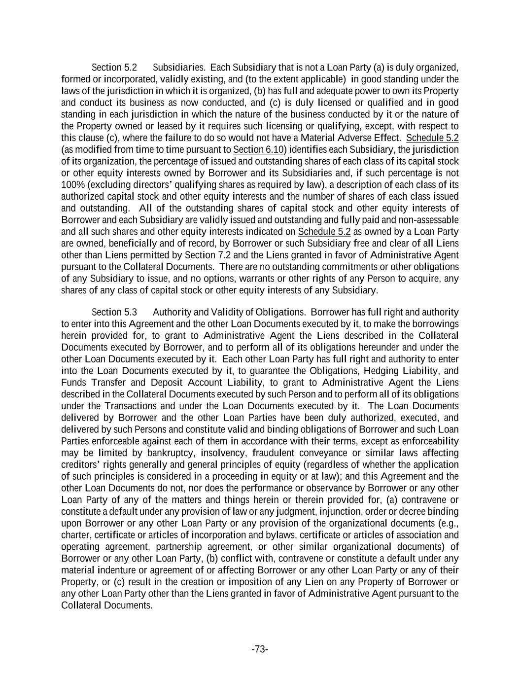 -73- Section 5.2 Subsidiaries. Each Subsidiary that is not a Loan Party (a) is duly organized, formed or incorporated, validly existing, and (to the extent applicable) in good standing under the laws of the jurisdiction in which it is organized, (b) has full and adequate power to own its Property and conduct its business as now conducted, and (c) is duly licensed or qualified and in good standing in each jurisdiction in which the nature of the business conducted by it or the nature of the Property owned or leased by it requires such licensing or qualifying, except, with respect to this clause (c), where the failure to do so would not have a Material Adverse Effect. Schedule 5.2 (as modified from time to time pursuant to Section 6.10) identifies each Subsidiary, the jurisdiction of its organization, the percentage of issued and outstanding shares of each class of its capital stock or other equity interests owned by Borrower and its Subsidiaries and, if such percentage is not 100% (excluding directors’ qualifying shares as required by law), a description of each class of its authorized capital stock and other equity interests and the number of shares of each class issued and outstanding. All of the outstanding shares of capital stock and other equity interests of Borrower and each Subsidiary are validly issued and outstanding and fully paid and non-assessable and all such shares and other equity interests indicated on Schedule 5.2 as owned by a Loan Party are owned, beneficially and of record, by Borrower or such Subsidiary free and clear of all Liens other than Liens permitted by Section 7.2 and the Liens granted in favor of Administrative Agent pursuant to the Collateral Documents. There are no outstanding commitments or other obligations of any Subsidiary to issue, and no options, warrants or other rights of any Person to acquire, any shares of any class of capital stock or other equity interests of any Subsidiary. Section 5.3 Authority and Validity of Obligations. Borrower has full right and authority to enter into this Agreement and the other Loan Documents executed by it, to make the borrowings herein provided for, to grant to Administrative Agent the Liens described in the Collateral Documents executed by Borrower, and to perform all of its obligations hereunder and under the other Loan Documents executed by it. Each other Loan Party has full right and authority to enter into the Loan Documents executed by it, to guarantee the Obligations, Hedging Liability, and Funds Transfer and Deposit Account Liability, to grant to Administrative Agent the Liens described in the Collateral Documents executed by such Person and to perform all of its obligations under the Transactions and under the Loan Documents executed by it. The Loan Documents delivered by Borrower and the other Loan Parties have been duly authorized, executed, and delivered by such Persons and constitute valid and binding obligations of Borrower and such Loan Parties enforceable against each of them in accordance with their terms, except as enforceability may be limited by bankruptcy, insolvency, fraudulent conveyance or similar laws affecting creditors’ rights generally and general principles of equity (regardless of whether the application of such principles is considered in a proceeding in equity or at law); and this Agreement and the other Loan Documents do not, nor does the performance or observance by Borrower or any other Loan Party of any of the matters and things herein or therein provided for, (a) contravene or constitute a default under any provision of law or any judgment, injunction, order or decree binding upon Borrower or any other Loan Party or any provision of the organizational documents (e.g., charter, certificate or articles of incorporation and bylaws, certificate or articles of association and operating agreement, partnership agreement, or other similar organizational documents) of Borrower or any other Loan Party, (b) conflict with, contravene or constitute a default under any material indenture or agreement of or affecting Borrower or any other Loan Party or any of their Property, or (c) result in the creation or imposition of any Lien on any Property of Borrower or any other Loan Party other than the Liens granted in favor of Administrative Agent pursuant to the Collateral Documents.