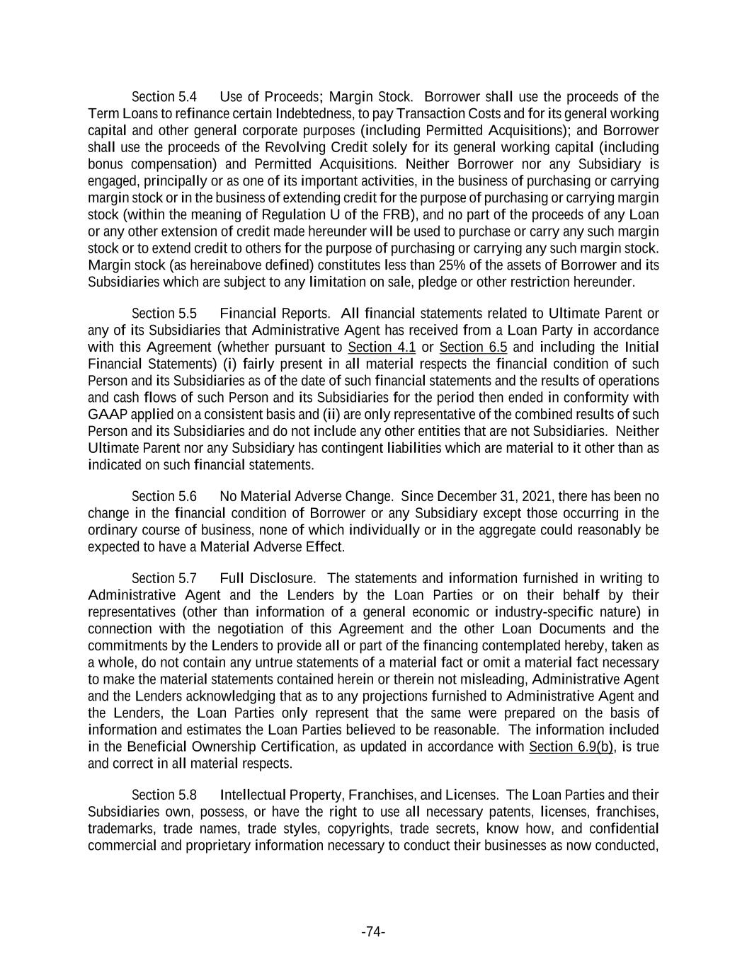 -74- Section 5.4 Use of Proceeds; Margin Stock. Borrower shall use the proceeds of the Term Loans to refinance certain Indebtedness, to pay Transaction Costs and for its general working capital and other general corporate purposes (including Permitted Acquisitions); and Borrower shall use the proceeds of the Revolving Credit solely for its general working capital (including bonus compensation) and Permitted Acquisitions. Neither Borrower nor any Subsidiary is engaged, principally or as one of its important activities, in the business of purchasing or carrying margin stock or in the business of extending credit for the purpose of purchasing or carrying margin stock (within the meaning of Regulation U of the FRB), and no part of the proceeds of any Loan or any other extension of credit made hereunder will be used to purchase or carry any such margin stock or to extend credit to others for the purpose of purchasing or carrying any such margin stock. Margin stock (as hereinabove defined) constitutes less than 25% of the assets of Borrower and its Subsidiaries which are subject to any limitation on sale, pledge or other restriction hereunder. Section 5.5 Financial Reports. All financial statements related to Ultimate Parent or any of its Subsidiaries that Administrative Agent has received from a Loan Party in accordance with this Agreement (whether pursuant to Section 4.1 or Section 6.5 and including the Initial Financial Statements) (i) fairly present in all material respects the financial condition of such Person and its Subsidiaries as of the date of such financial statements and the results of operations and cash flows of such Person and its Subsidiaries for the period then ended in conformity with GAAP applied on a consistent basis and (ii) are only representative of the combined results of such Person and its Subsidiaries and do not include any other entities that are not Subsidiaries. Neither Ultimate Parent nor any Subsidiary has contingent liabilities which are material to it other than as indicated on such financial statements. Section 5.6 No Material Adverse Change. Since December 31, 2021, there has been no change in the financial condition of Borrower or any Subsidiary except those occurring in the ordinary course of business, none of which individually or in the aggregate could reasonably be expected to have a Material Adverse Effect. Section 5.7 Full Disclosure. The statements and information furnished in writing to Administrative Agent and the Lenders by the Loan Parties or on their behalf by their representatives (other than information of a general economic or industry-specific nature) in connection with the negotiation of this Agreement and the other Loan Documents and the commitments by the Lenders to provide all or part of the financing contemplated hereby, taken as a whole, do not contain any untrue statements of a material fact or omit a material fact necessary to make the material statements contained herein or therein not misleading, Administrative Agent and the Lenders acknowledging that as to any projections furnished to Administrative Agent and the Lenders, the Loan Parties only represent that the same were prepared on the basis of information and estimates the Loan Parties believed to be reasonable. The information included in the Beneficial Ownership Certification, as updated in accordance with Section 6.9(b), is true and correct in all material respects. Section 5.8 Intellectual Property, Franchises, and Licenses. The Loan Parties and their Subsidiaries own, possess, or have the right to use all necessary patents, licenses, franchises, trademarks, trade names, trade styles, copyrights, trade secrets, know how, and confidential commercial and proprietary information necessary to conduct their businesses as now conducted,