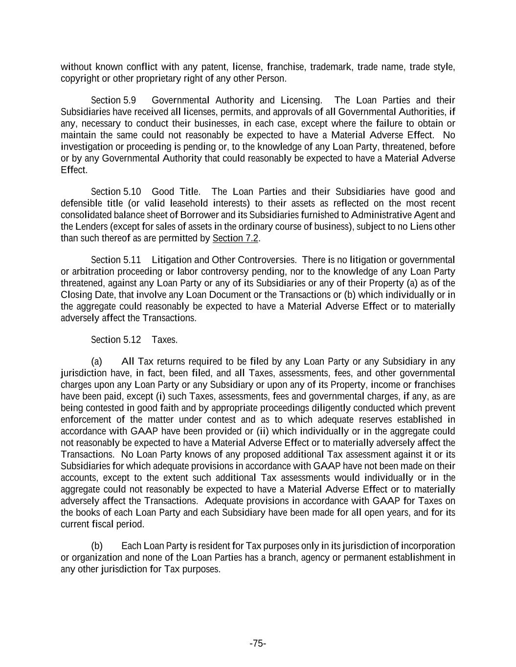-75- without known conflict with any patent, license, franchise, trademark, trade name, trade style, copyright or other proprietary right of any other Person. Section 5.9 Governmental Authority and Licensing. The Loan Parties and their Subsidiaries have received all licenses, permits, and approvals of all Governmental Authorities, if any, necessary to conduct their businesses, in each case, except where the failure to obtain or maintain the same could not reasonably be expected to have a Material Adverse Effect. No investigation or proceeding is pending or, to the knowledge of any Loan Party, threatened, before or by any Governmental Authority that could reasonably be expected to have a Material Adverse Effect. Section 5.10 Good Title. The Loan Parties and their Subsidiaries have good and defensible title (or valid leasehold interests) to their assets as reflected on the most recent consolidated balance sheet of Borrower and its Subsidiaries furnished to Administrative Agent and the Lenders (except for sales of assets in the ordinary course of business), subject to no Liens other than such thereof as are permitted by Section 7.2. Section 5.11 Litigation and Other Controversies. There is no litigation or governmental or arbitration proceeding or labor controversy pending, nor to the knowledge of any Loan Party threatened, against any Loan Party or any of its Subsidiaries or any of their Property (a) as of the Closing Date, that involve any Loan Document or the Transactions or (b) which individually or in the aggregate could reasonably be expected to have a Material Adverse Effect or to materially adversely affect the Transactions. Section 5.12 Taxes. (a) All Tax returns required to be filed by any Loan Party or any Subsidiary in any jurisdiction have, in fact, been filed, and all Taxes, assessments, fees, and other governmental charges upon any Loan Party or any Subsidiary or upon any of its Property, income or franchises have been paid, except (i) such Taxes, assessments, fees and governmental charges, if any, as are being contested in good faith and by appropriate proceedings diligently conducted which prevent enforcement of the matter under contest and as to which adequate reserves established in accordance with GAAP have been provided or (ii) which individually or in the aggregate could not reasonably be expected to have a Material Adverse Effect or to materially adversely affect the Transactions. No Loan Party knows of any proposed additional Tax assessment against it or its Subsidiaries for which adequate provisions in accordance with GAAP have not been made on their accounts, except to the extent such additional Tax assessments would individually or in the aggregate could not reasonably be expected to have a Material Adverse Effect or to materially adversely affect the Transactions. Adequate provisions in accordance with GAAP for Taxes on the books of each Loan Party and each Subsidiary have been made for all open years, and for its current fiscal period. (b) Each Loan Party is resident for Tax purposes only in its jurisdiction of incorporation or organization and none of the Loan Parties has a branch, agency or permanent establishment in any other jurisdiction for Tax purposes.