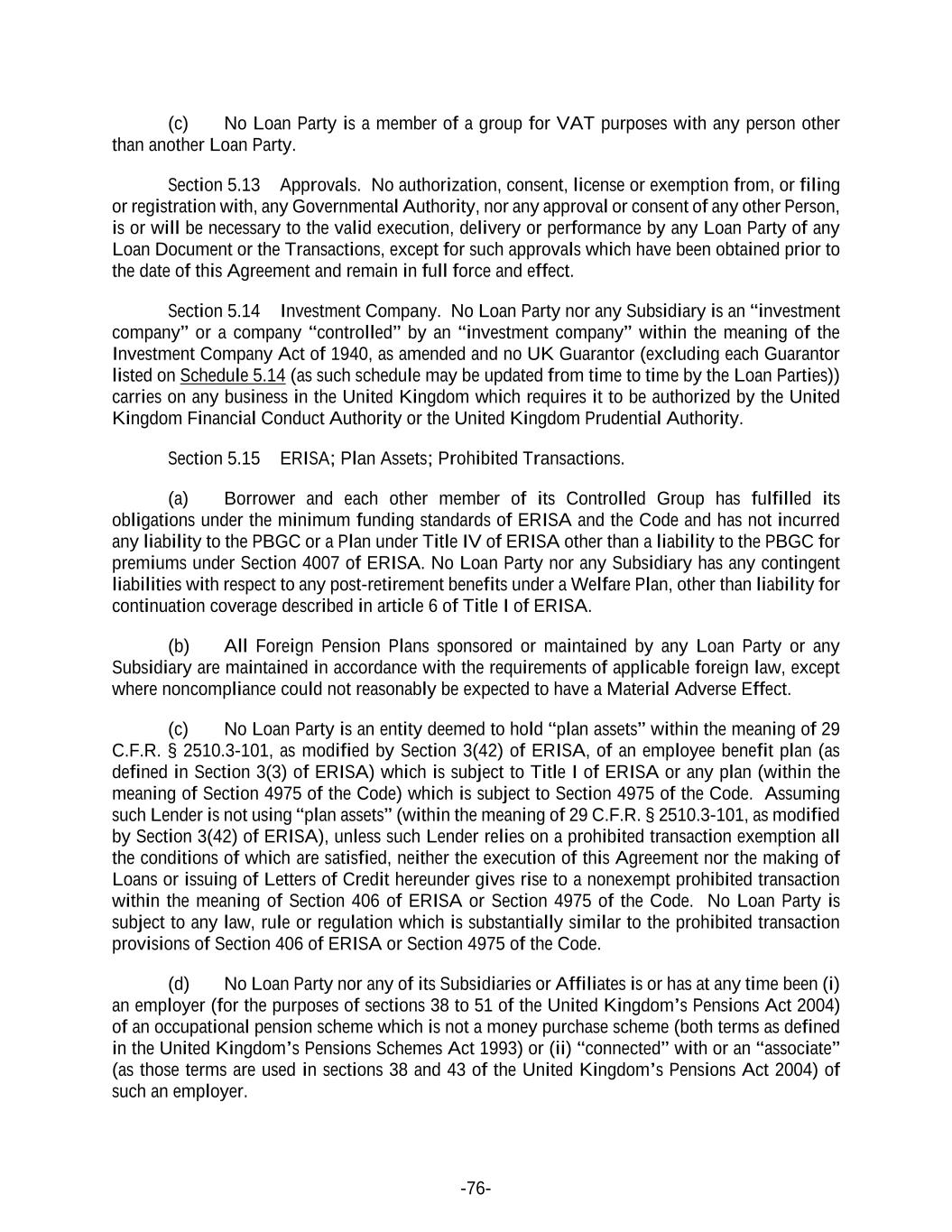 -76- (c) No Loan Party is a member of a group for VAT purposes with any person other than another Loan Party. Section 5.13 Approvals. No authorization, consent, license or exemption from, or filing or registration with, any Governmental Authority, nor any approval or consent of any other Person, is or will be necessary to the valid execution, delivery or performance by any Loan Party of any Loan Document or the Transactions, except for such approvals which have been obtained prior to the date of this Agreement and remain in full force and effect. Section 5.14 Investment Company. No Loan Party nor any Subsidiary is an “investment company” or a company “controlled” by an “investment company” within the meaning of the Investment Company Act of 1940, as amended and no UK Guarantor (excluding each Guarantor listed on Schedule 5.14 (as such schedule may be updated from time to time by the Loan Parties)) carries on any business in the United Kingdom which requires it to be authorized by the United Kingdom Financial Conduct Authority or the United Kingdom Prudential Authority. Section 5.15 ERISA; Plan Assets; Prohibited Transactions. (a) Borrower and each other member of its Controlled Group has fulfilled its obligations under the minimum funding standards of ERISA and the Code and has not incurred any liability to the PBGC or a Plan under Title IV of ERISA other than a liability to the PBGC for premiums under Section 4007 of ERISA. No Loan Party nor any Subsidiary has any contingent liabilities with respect to any post-retirement benefits under a Welfare Plan, other than liability for continuation coverage described in article 6 of Title I of ERISA. (b) All Foreign Pension Plans sponsored or maintained by any Loan Party or any Subsidiary are maintained in accordance with the requirements of applicable foreign law, except where noncompliance could not reasonably be expected to have a Material Adverse Effect. (c) No Loan Party is an entity deemed to hold “plan assets” within the meaning of 29 C.F.R. § 2510.3-101, as modified by Section 3(42) of ERISA, of an employee benefit plan (as defined in Section 3(3) of ERISA) which is subject to Title I of ERISA or any plan (within the meaning of Section 4975 of the Code) which is subject to Section 4975 of the Code. Assuming such Lender is not using “plan assets” (within the meaning of 29 C.F.R. § 2510.3-101, as modified by Section 3(42) of ERISA), unless such Lender relies on a prohibited transaction exemption all the conditions of which are satisfied, neither the execution of this Agreement nor the making of Loans or issuing of Letters of Credit hereunder gives rise to a nonexempt prohibited transaction within the meaning of Section 406 of ERISA or Section 4975 of the Code. No Loan Party is subject to any law, rule or regulation which is substantially similar to the prohibited transaction provisions of Section 406 of ERISA or Section 4975 of the Code. (d) No Loan Party nor any of its Subsidiaries or Affiliates is or has at any time been (i) an employer (for the purposes of sections 38 to 51 of the United Kingdom’s Pensions Act 2004) of an occupational pension scheme which is not a money purchase scheme (both terms as defined in the United Kingdom’s Pensions Schemes Act 1993) or (ii) “connected” with or an “associate” (as those terms are used in sections 38 and 43 of the United Kingdom’s Pensions Act 2004) of such an employer.